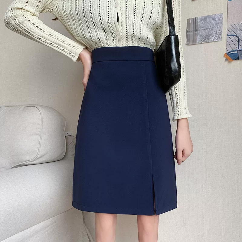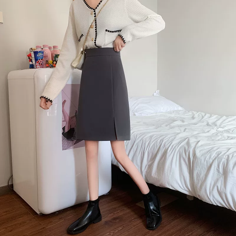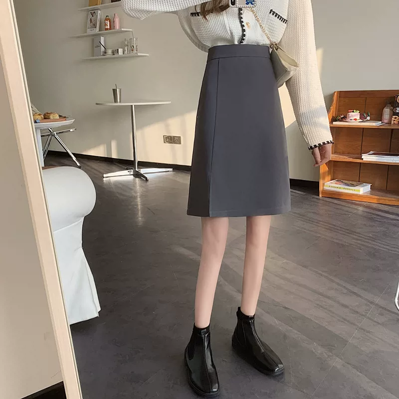 Váy bút chì xẻ tà màu xám lưng cao dành cho nữ, cỡ lớn, dài vừa phải, váy chữ A, váy công sở, mùa thu.