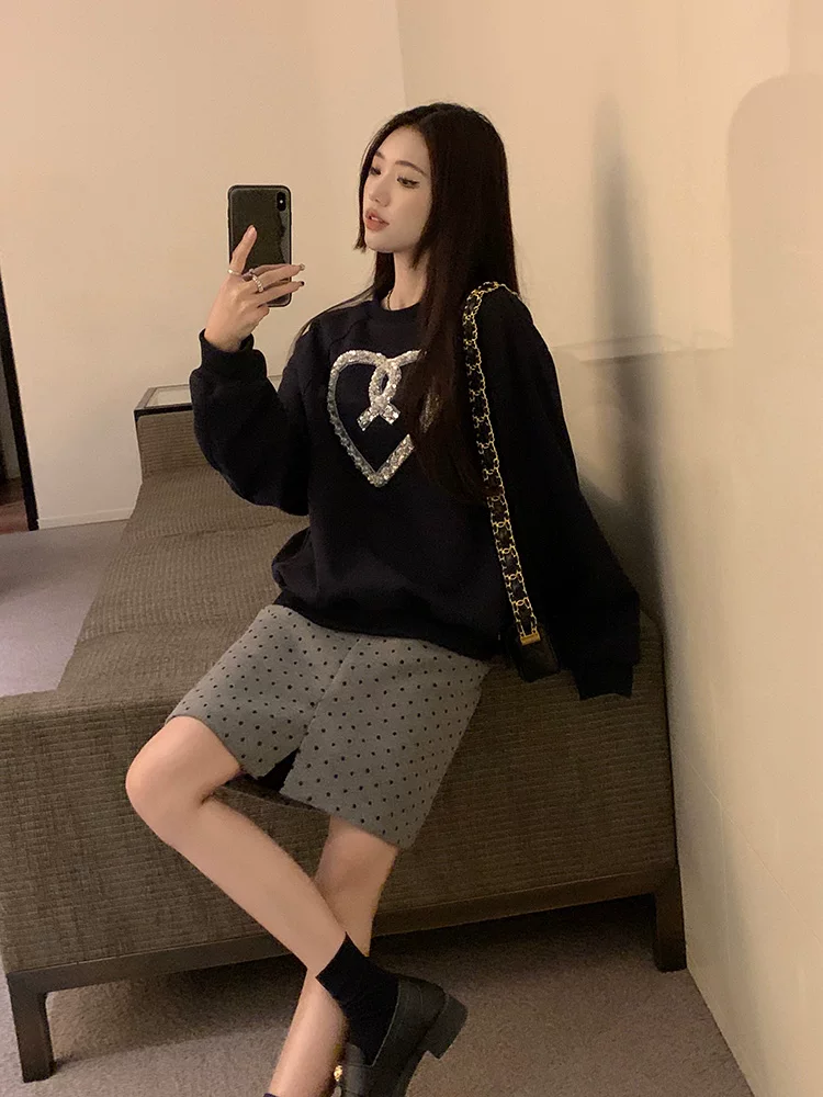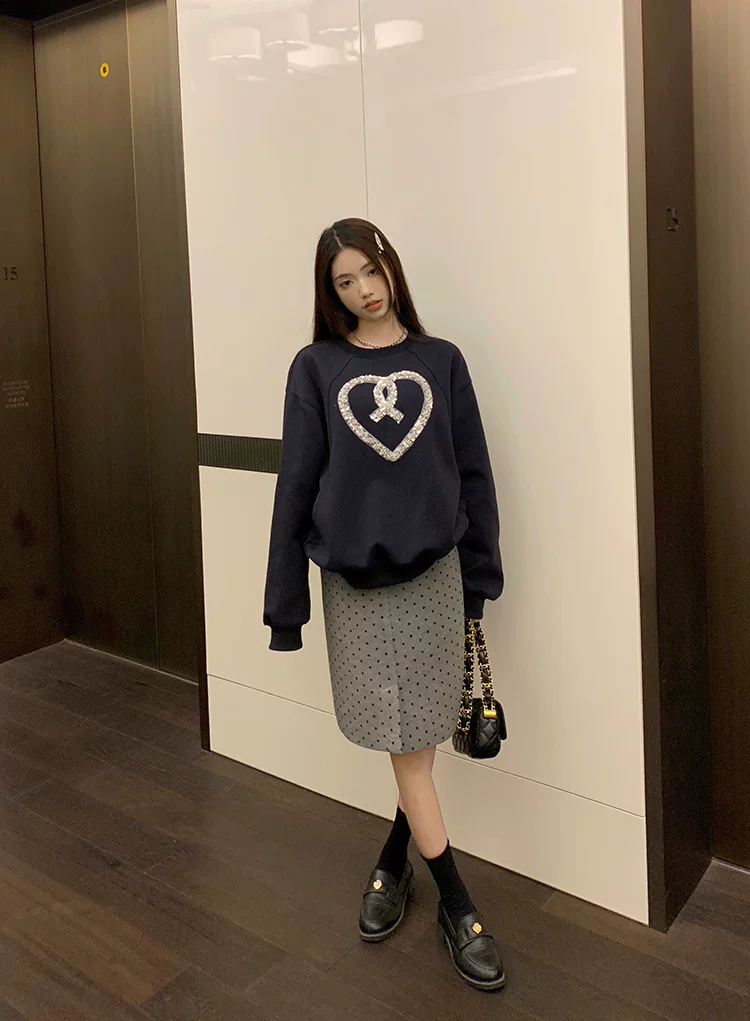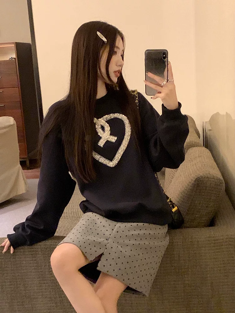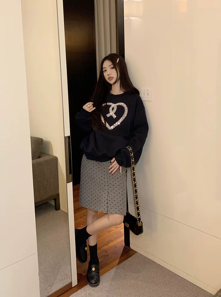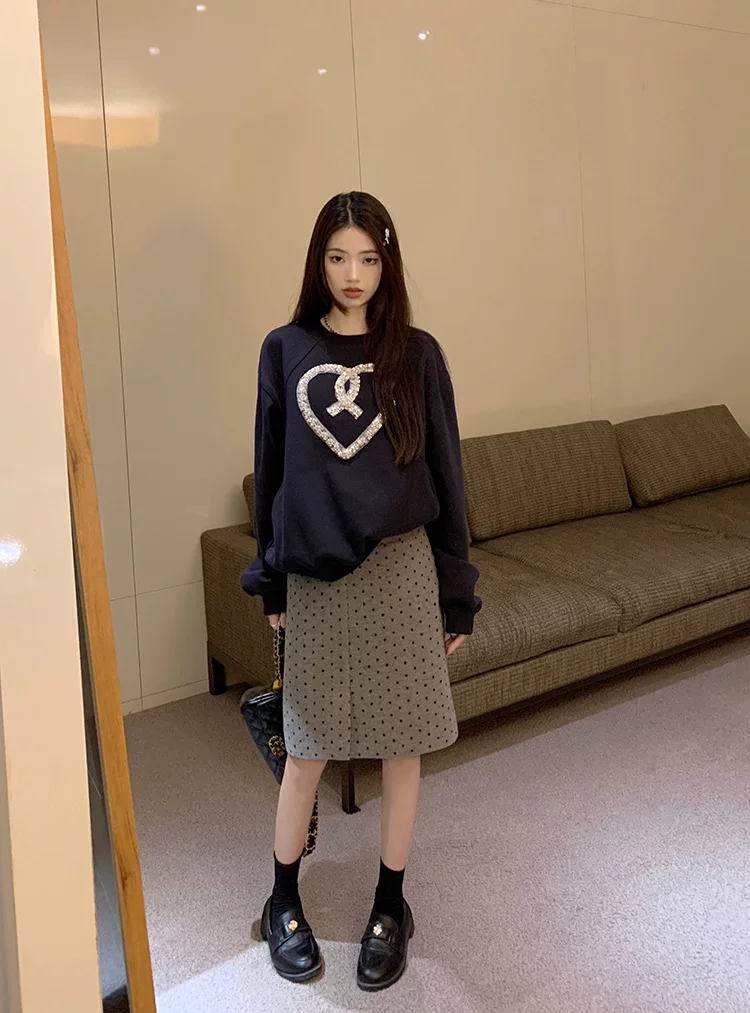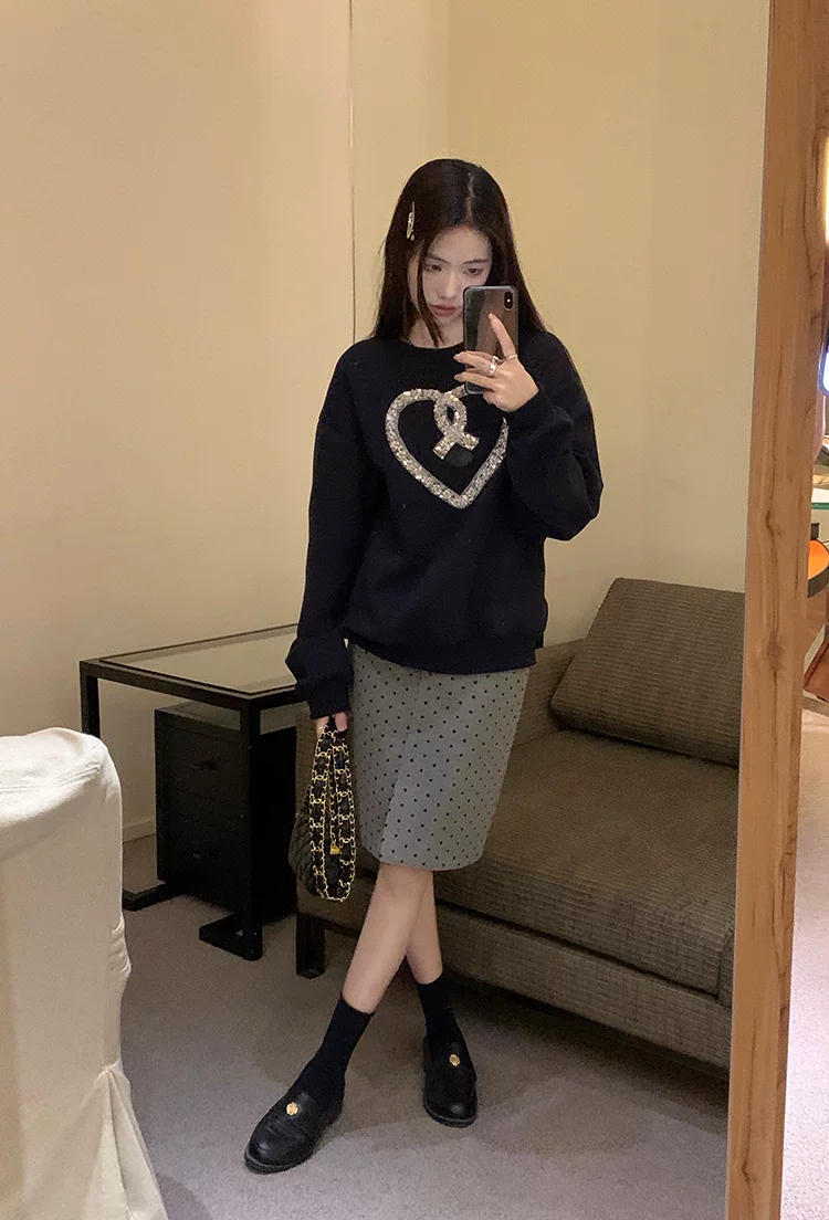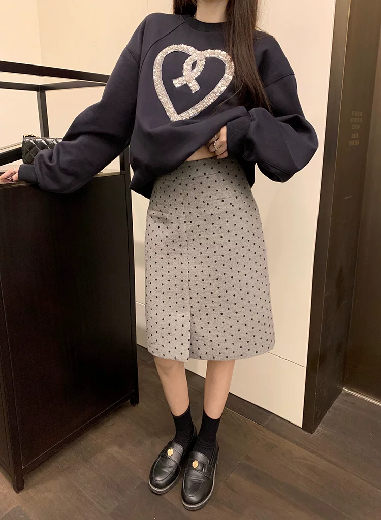 - Váy chấm bi đen cổ điển dành cho nữ mùa thu đông, cạp cao, dáng nhỏ nhắn, thiết kế xẻ tà, váy chữ A, váy len dài trung bình