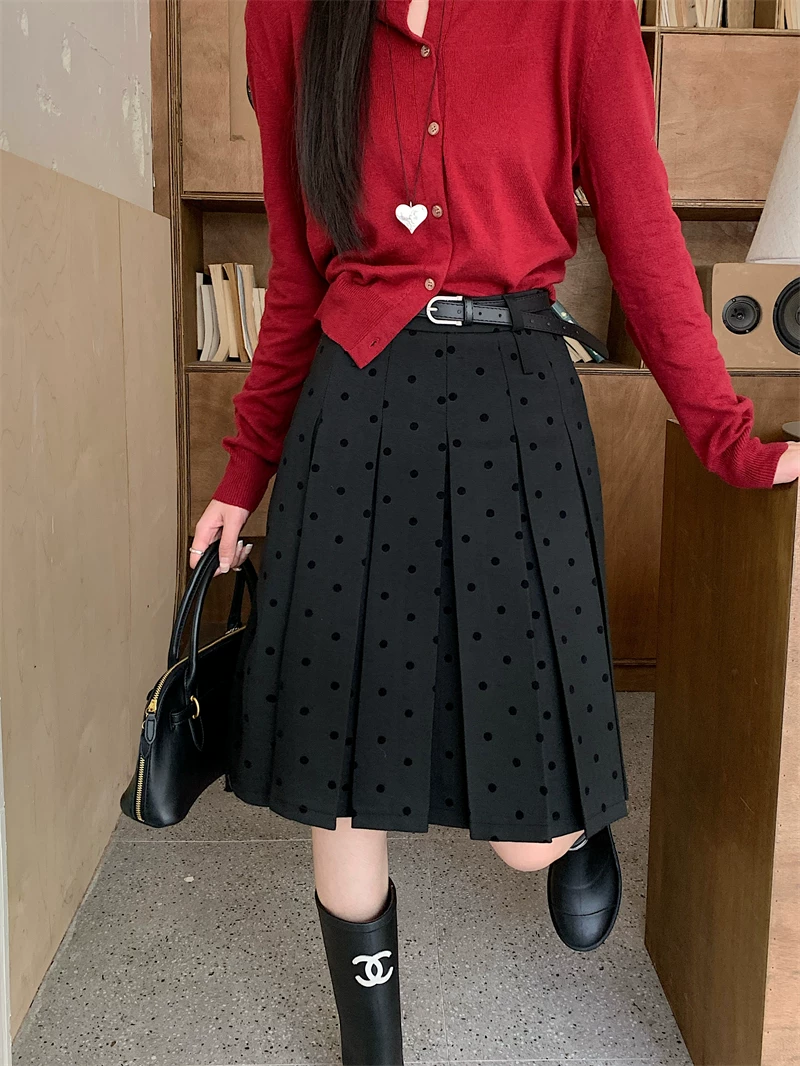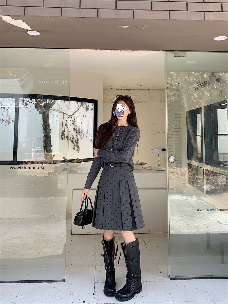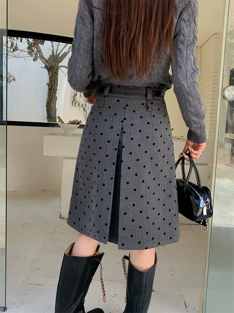 - Váy chấm bi màu xám cỡ lớn, váy cạp cao, váy chữ A phong cách preppy dành cho nữ, váy xếp ly dài vừa phải giúp giảm béo mùa xuân hè