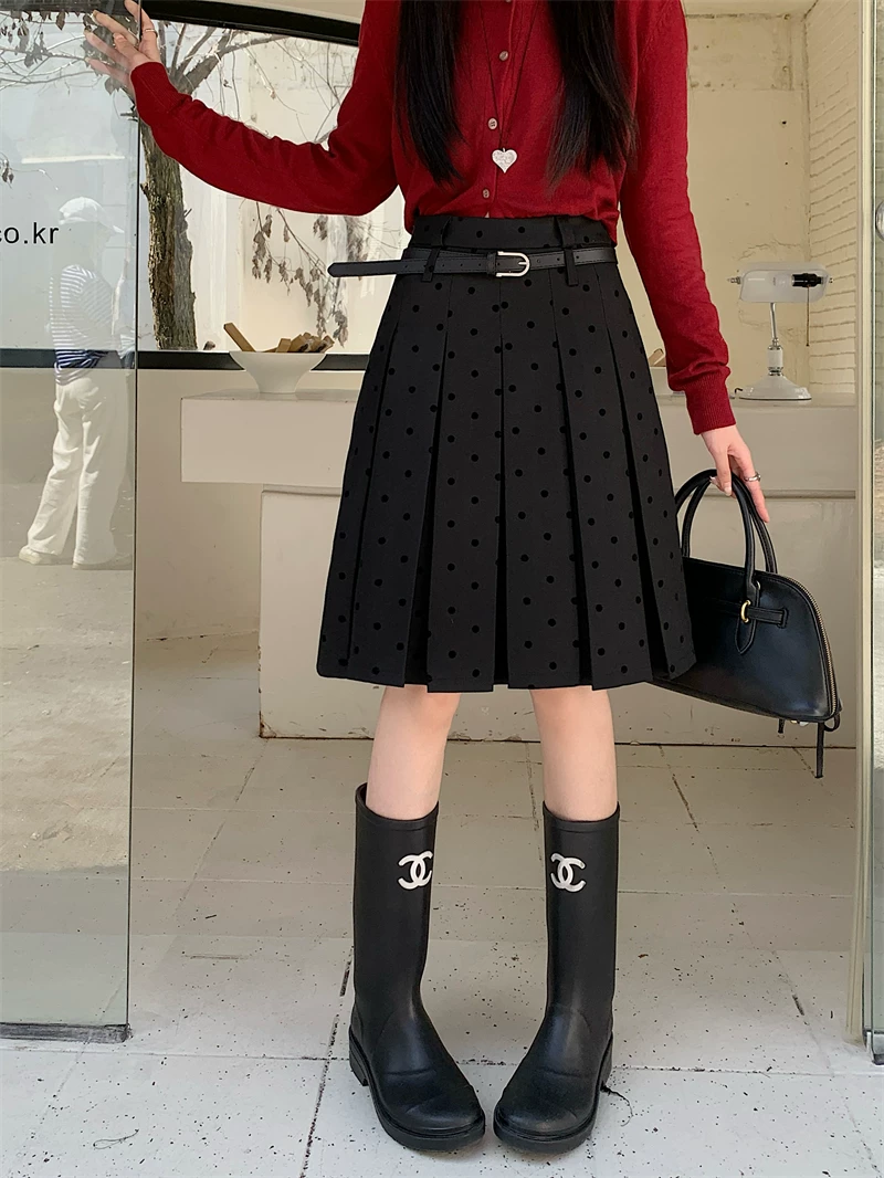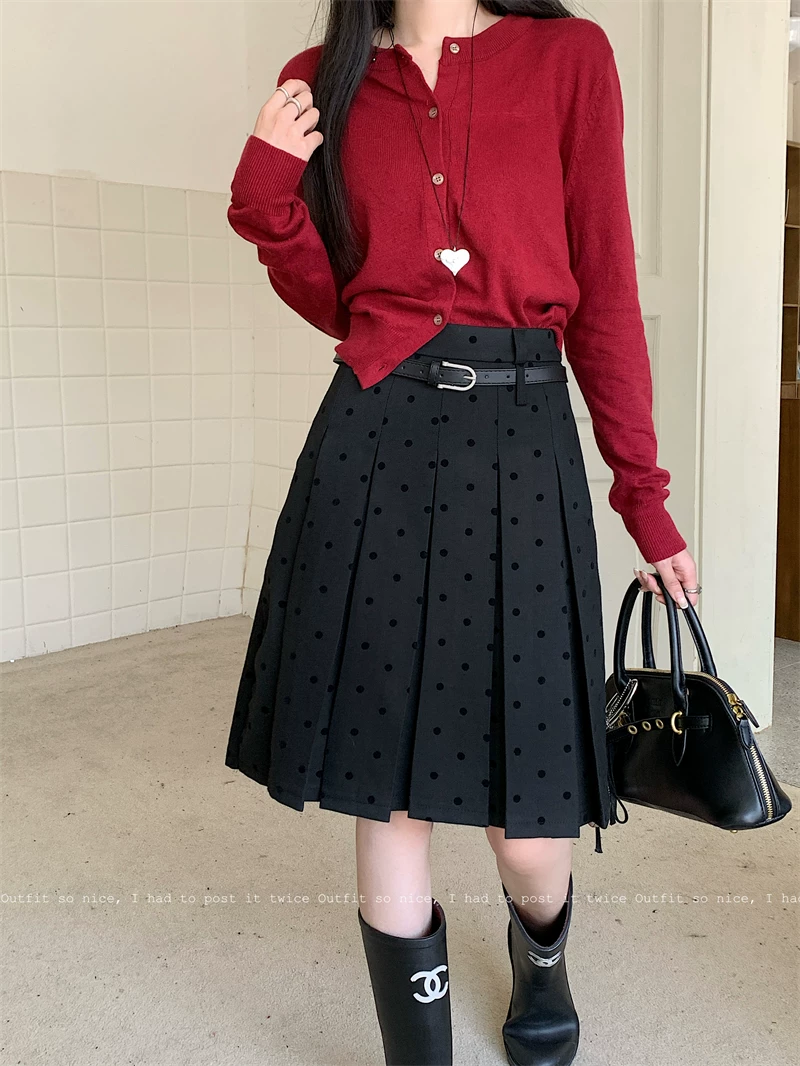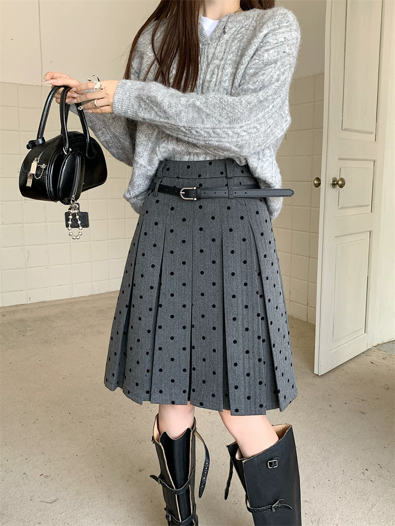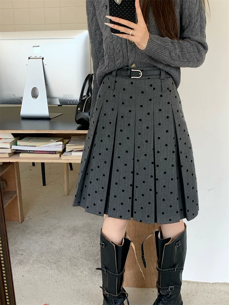 Váy chấm bi màu xám cỡ lớn, váy cạp cao, váy chữ A phong cách preppy dành cho nữ, váy xếp ly dài vừa phải giúp giảm béo mùa xuân hè