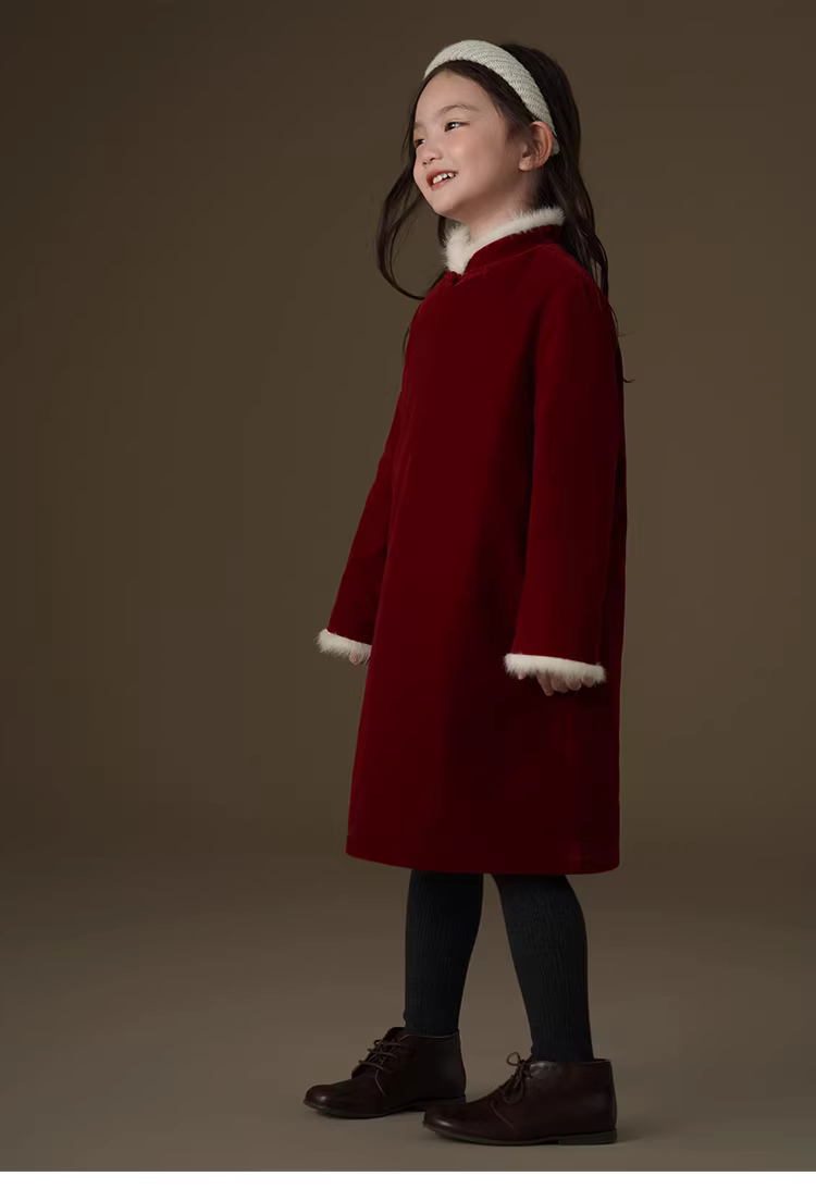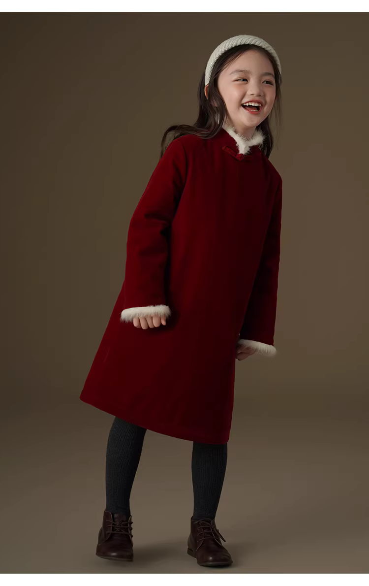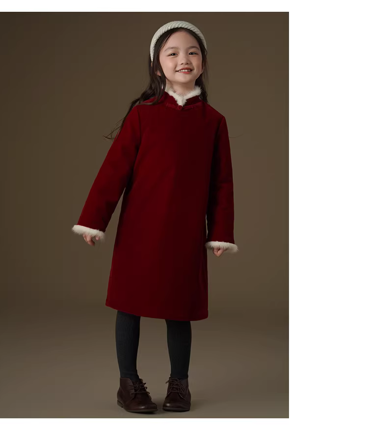 - Váy dài tay mùa đông có cổ lông thật cho bé gái, trang phục Tết kiểu Trung Quốc mới màu đỏ, áo khoác Tết.