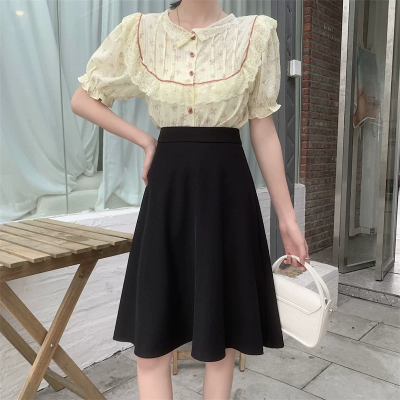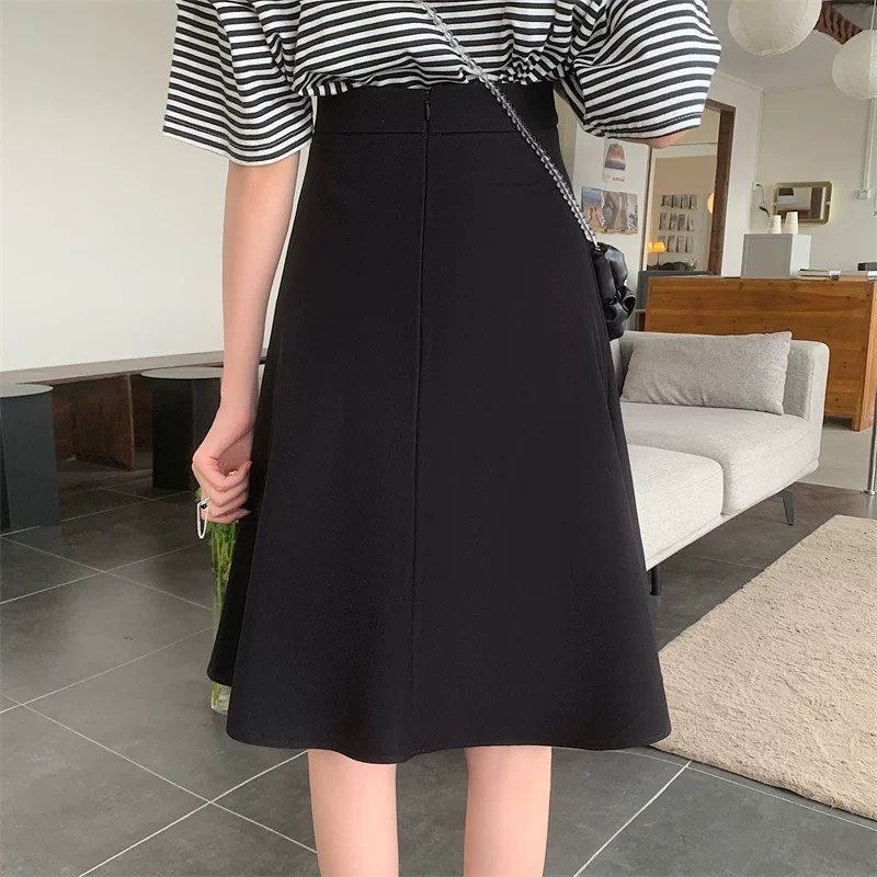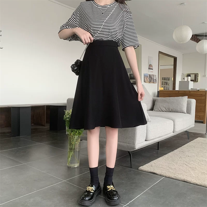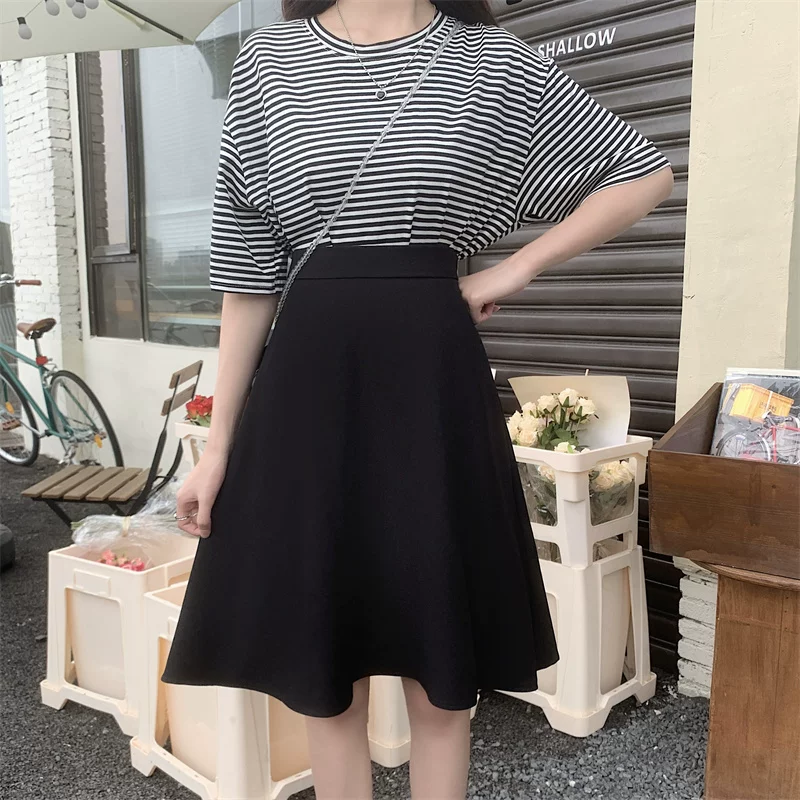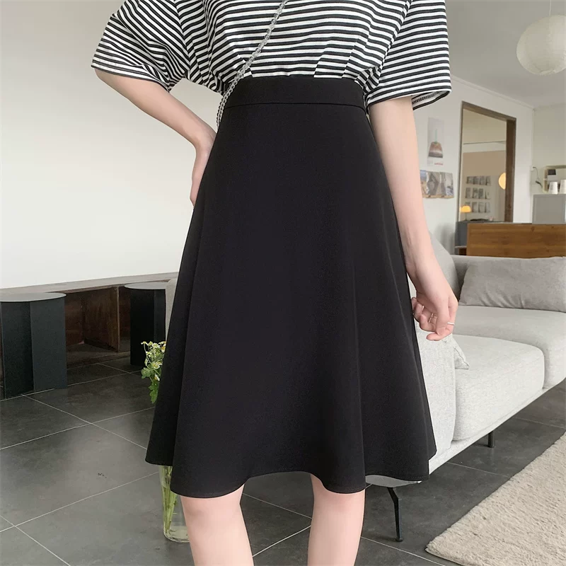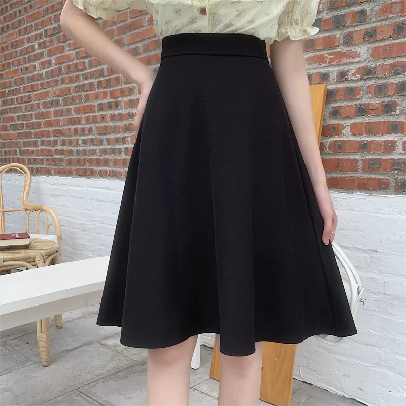 Váy đen xòe dài ngang đùi mùa hè, size lớn cho nữ, cạp cao, tôn dáng, kiểu dáng chữ A, chống lộ nắng.