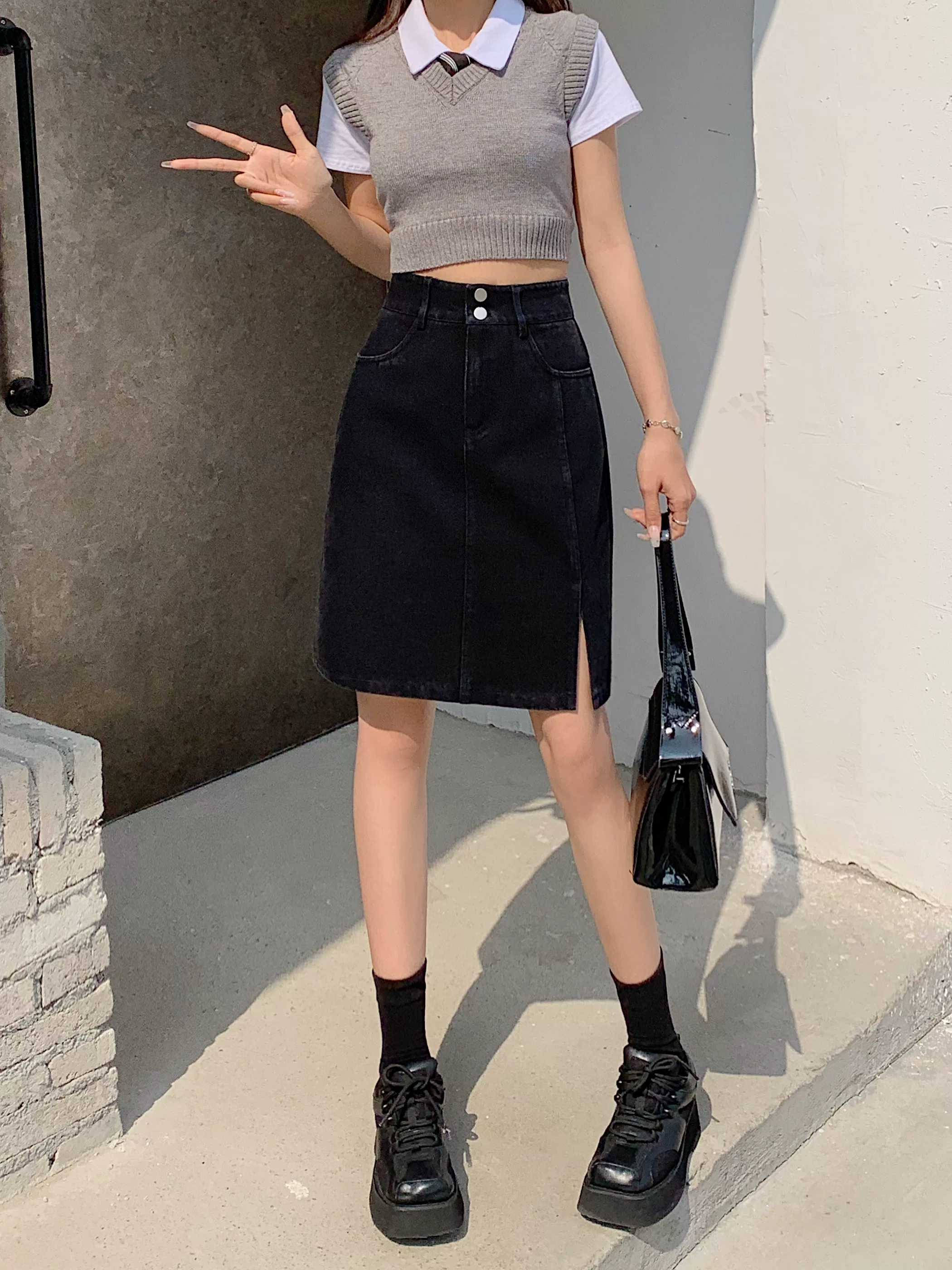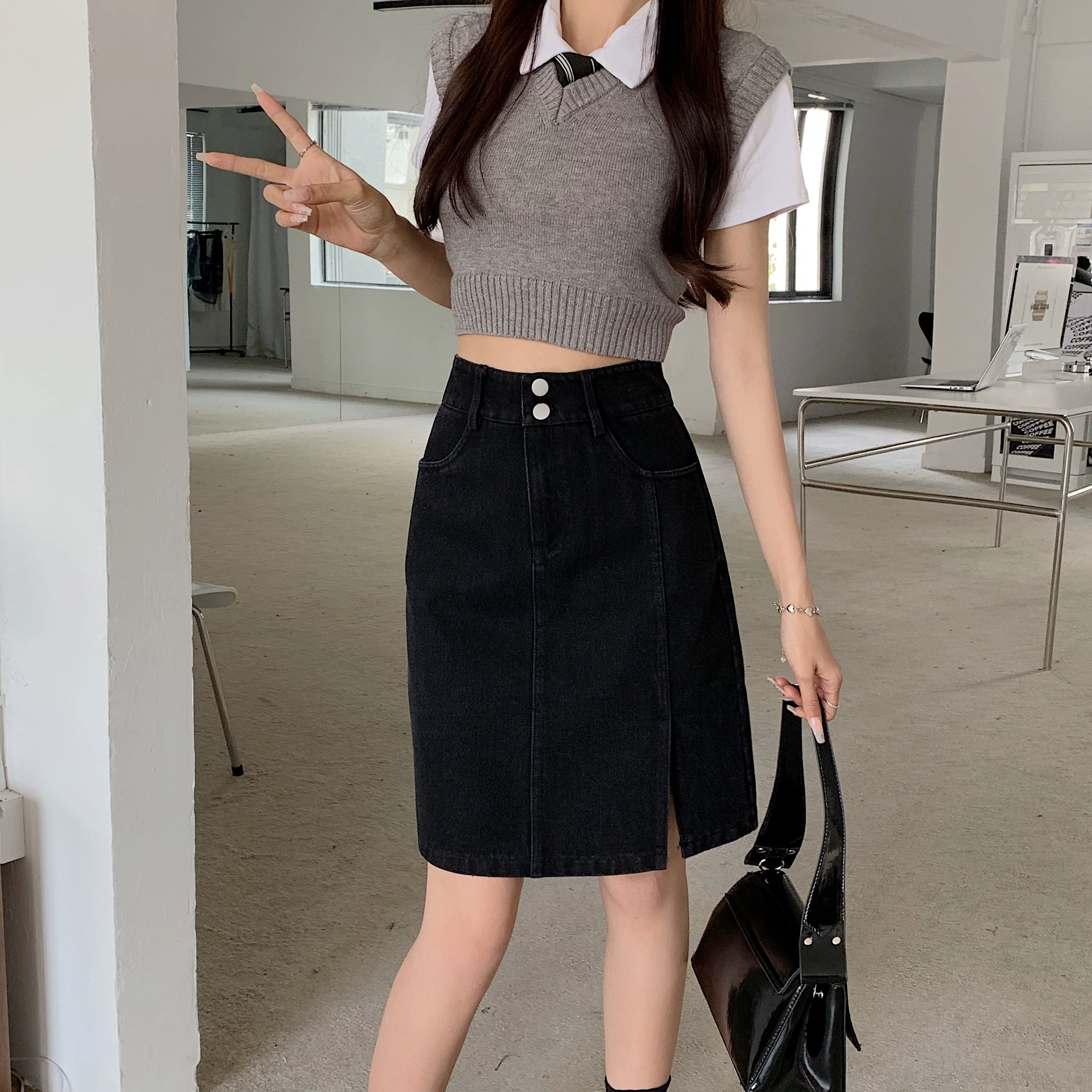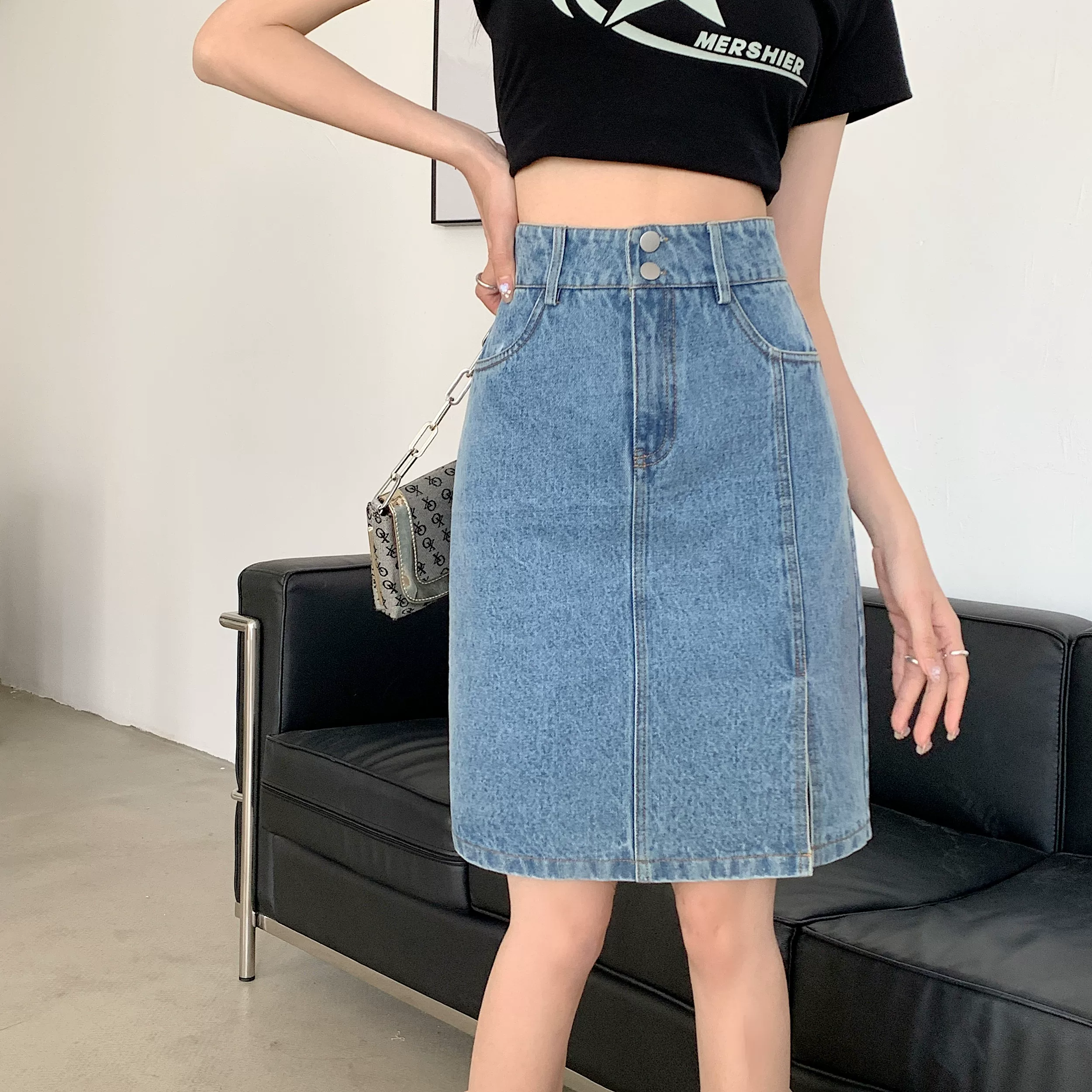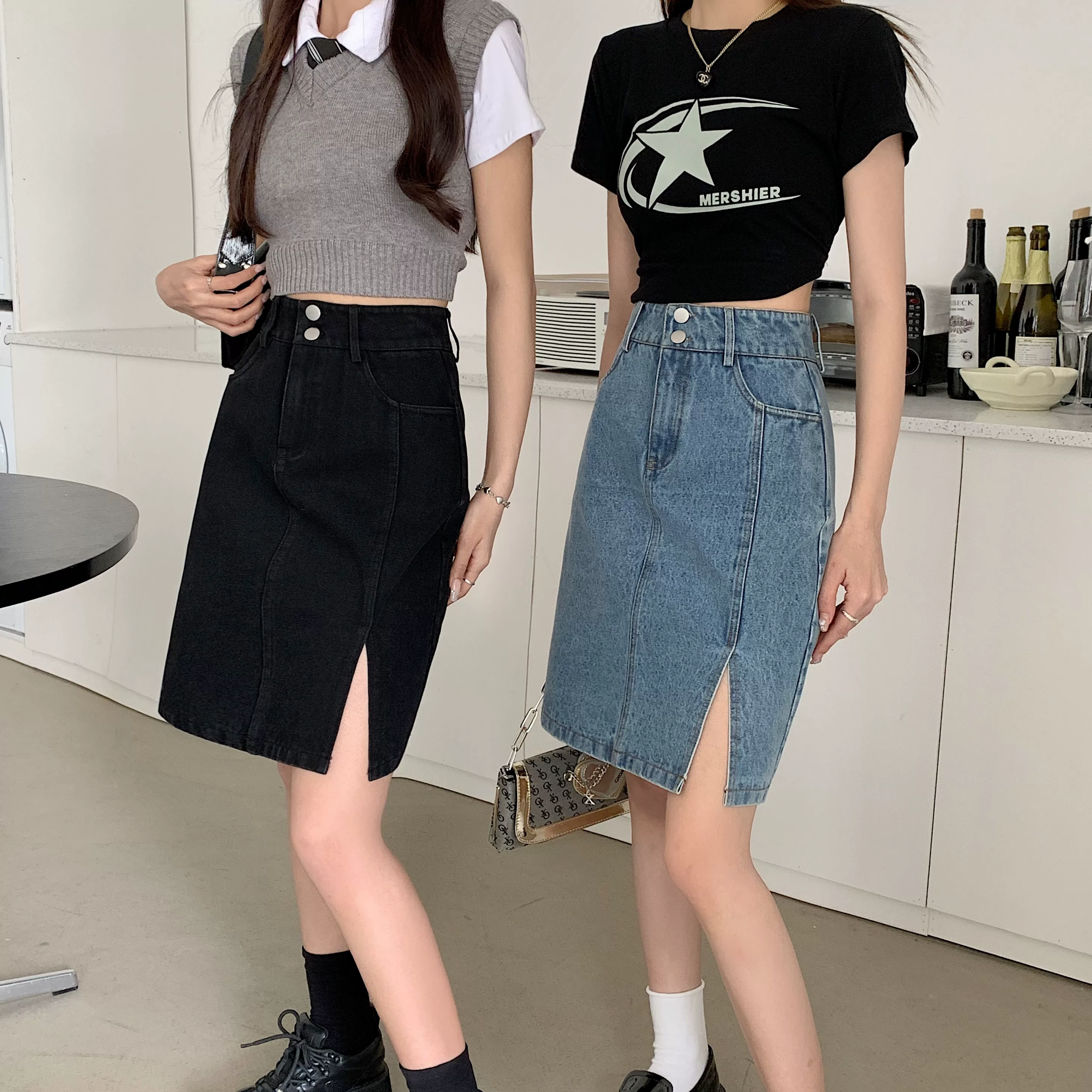 - Váy denim cỡ lớn, váy midi mùa hè dành cho nữ, váy chữ A cạp cao, váy bút chì xẻ tà dài vừa phải kiểu Hàn Quốc.