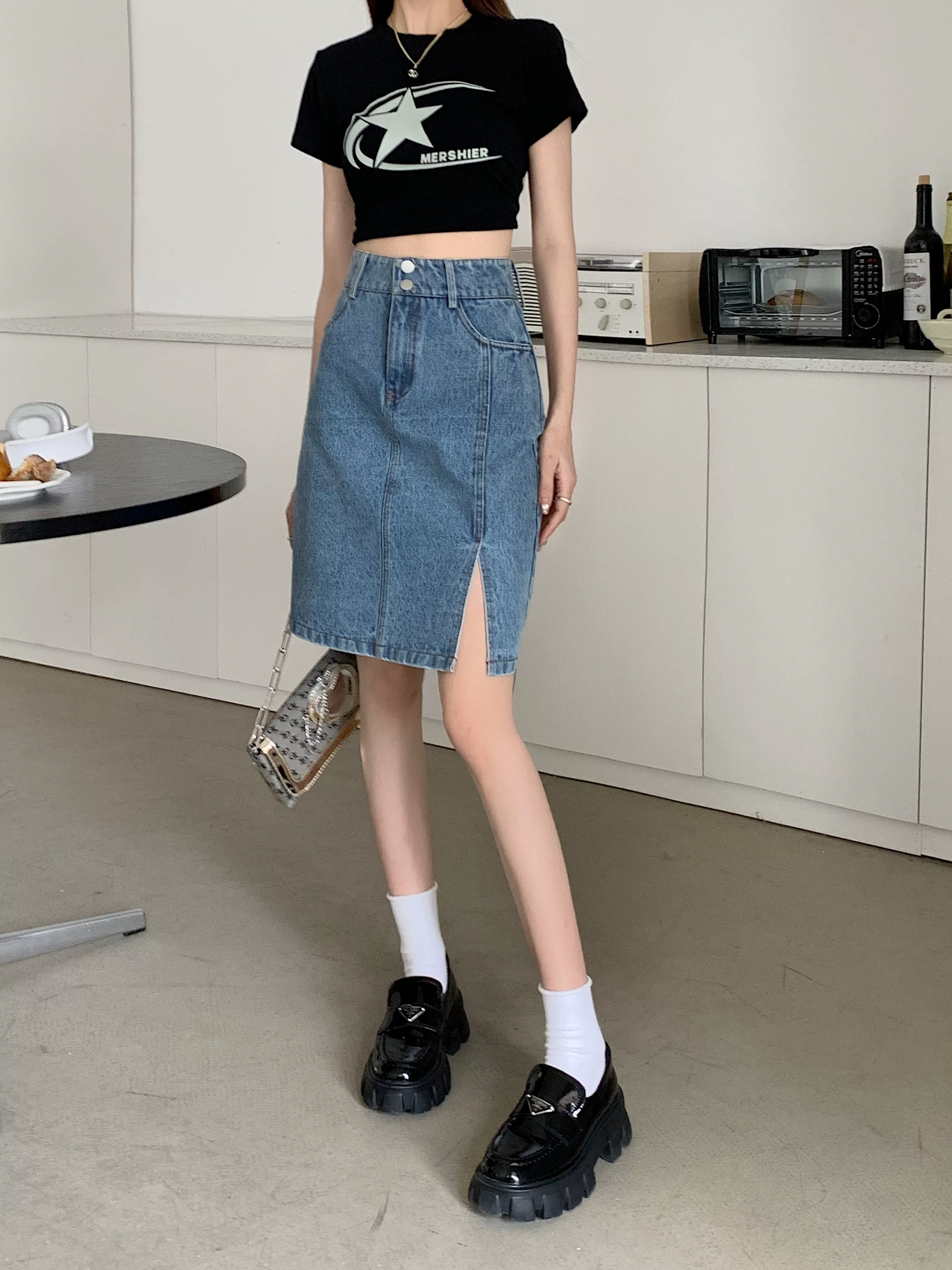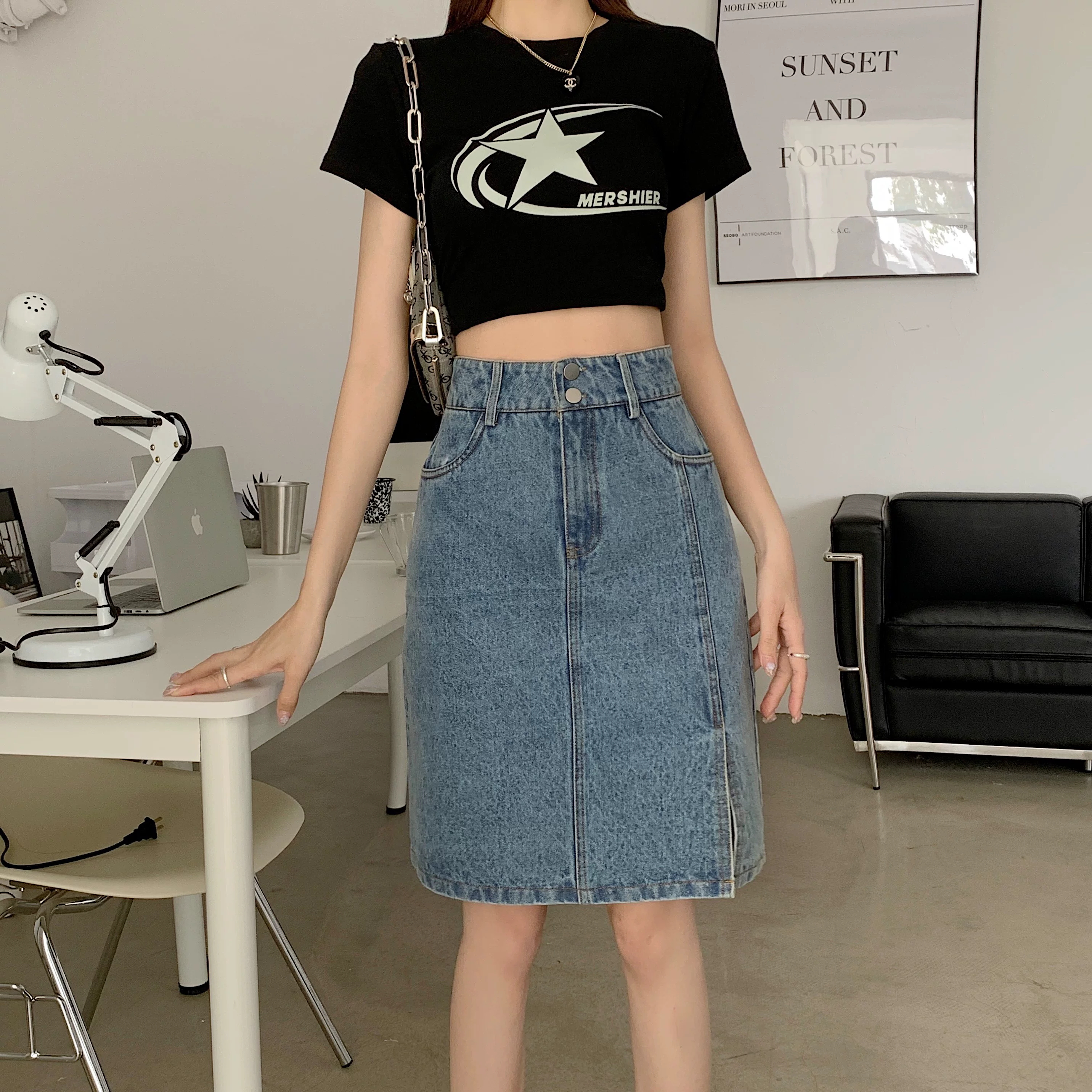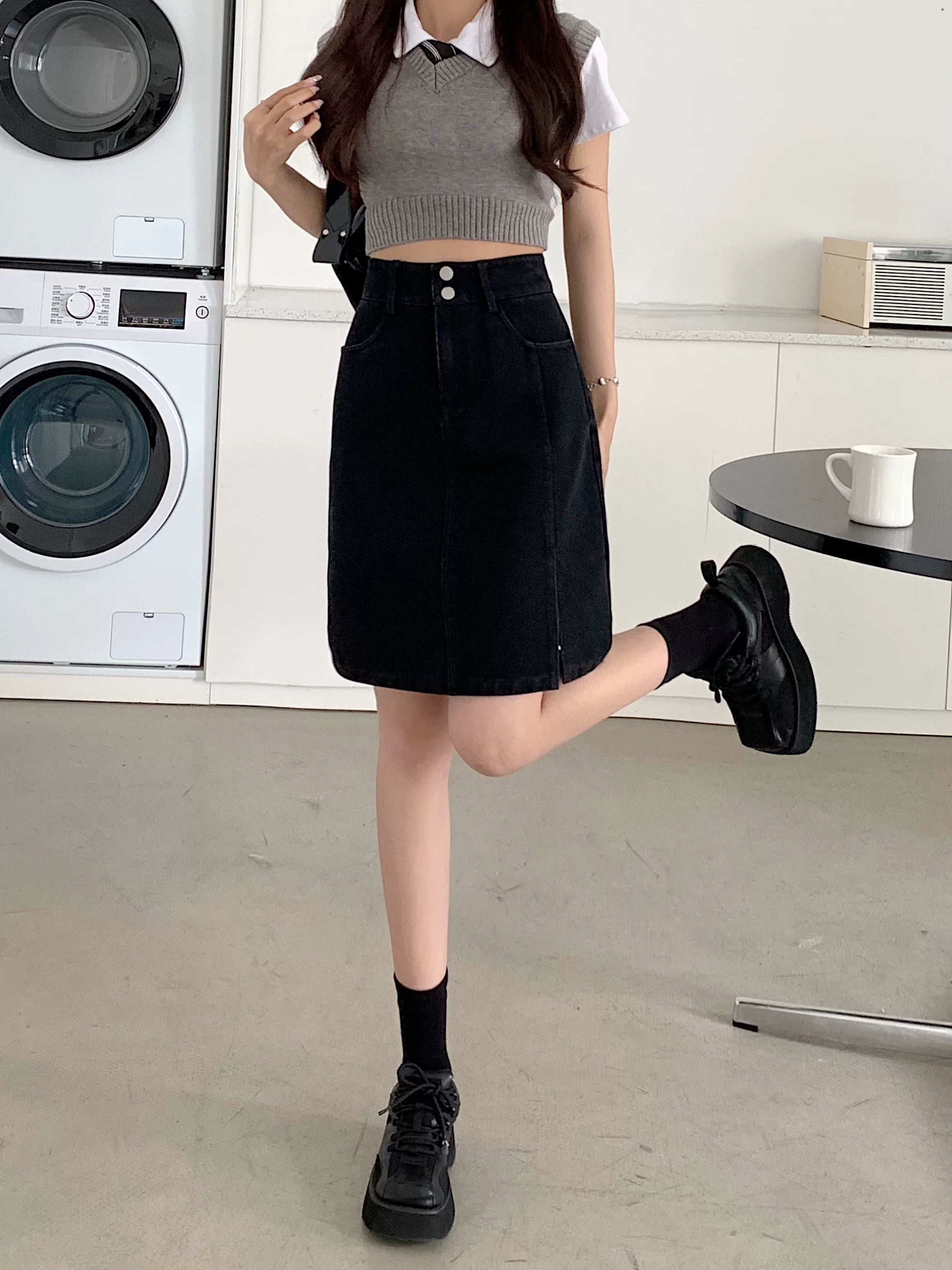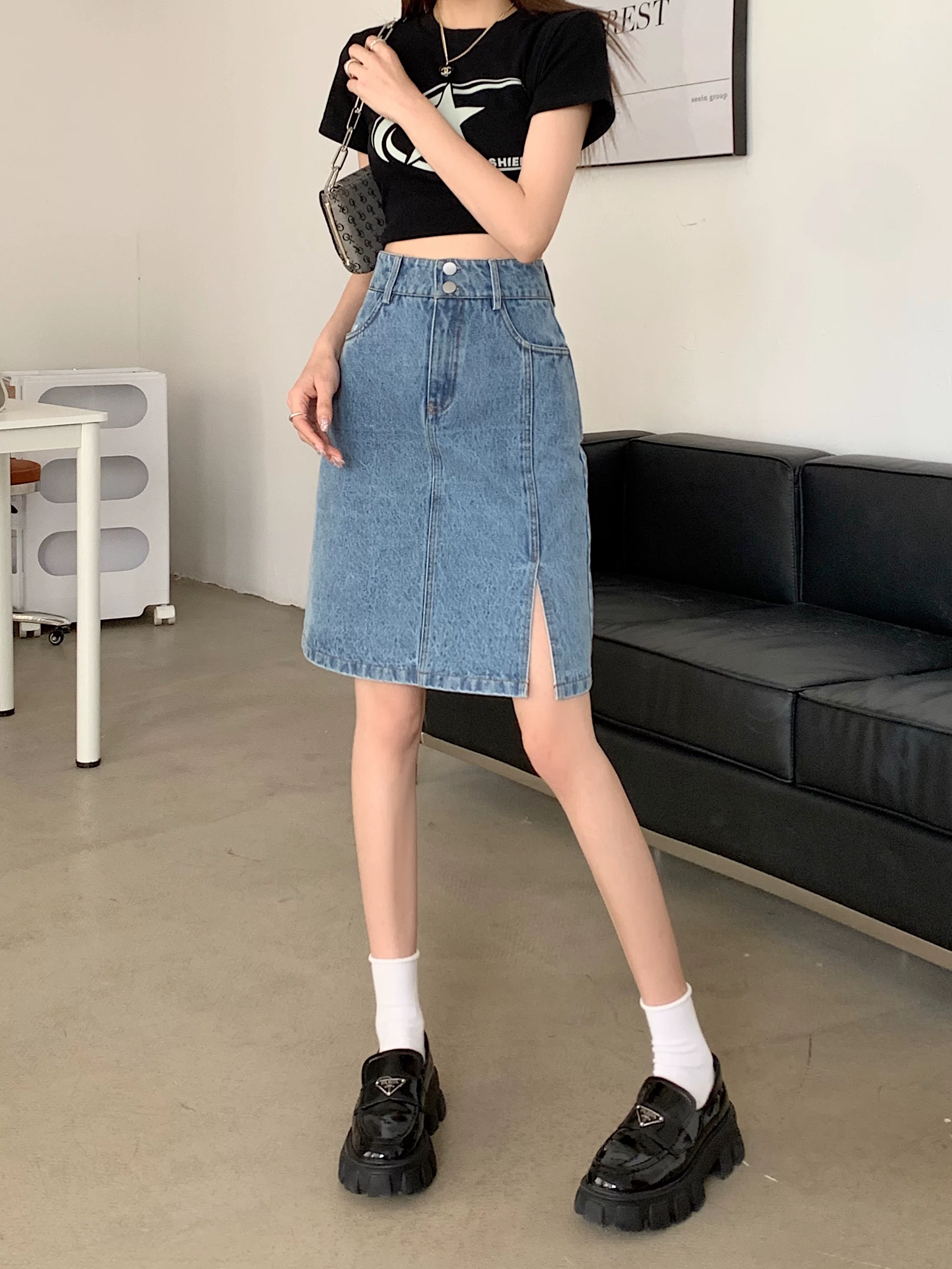 - Váy denim cỡ lớn, váy midi mùa hè dành cho nữ, váy chữ A cạp cao, váy bút chì xẻ tà dài vừa phải kiểu Hàn Quốc.
