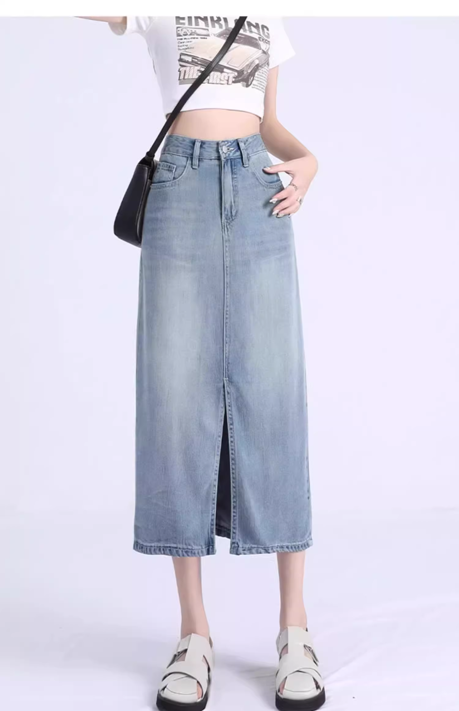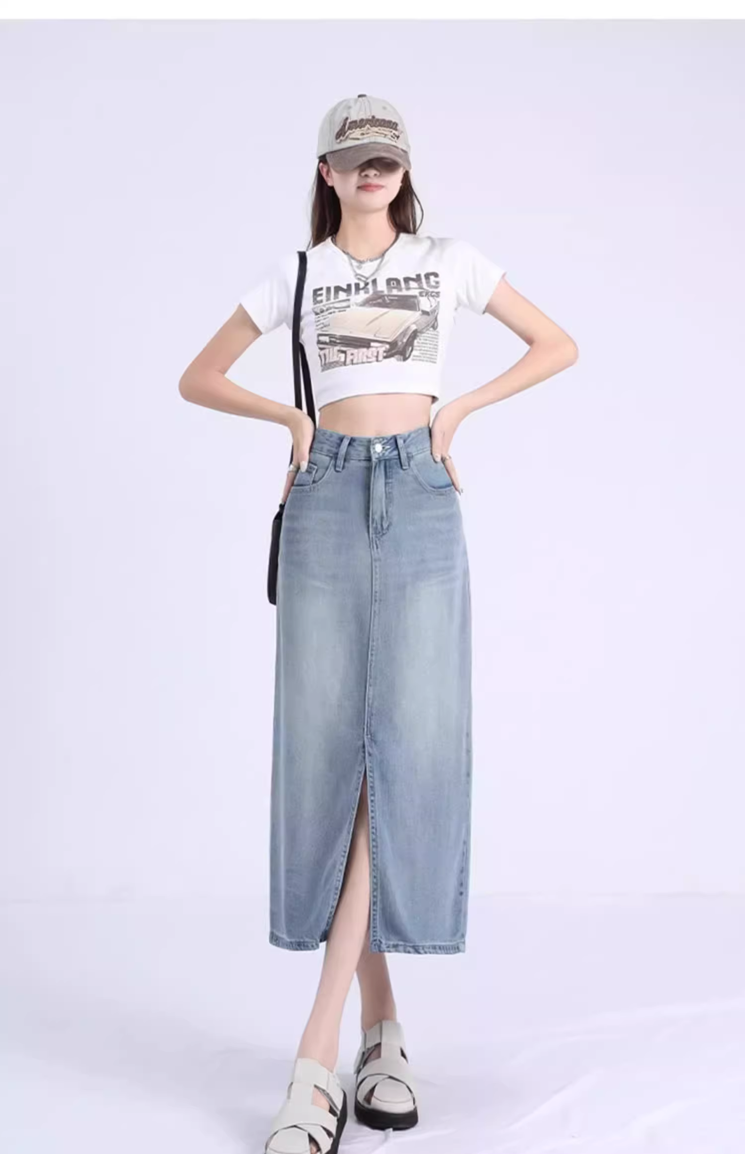 Váy denim Tencel màu xanh dành cho nữ, kiểu dáng mỏng mùa hè, cỡ lớn, lưng cao, xẻ tà, che hông, váy bút chì chữ A thon gọn.