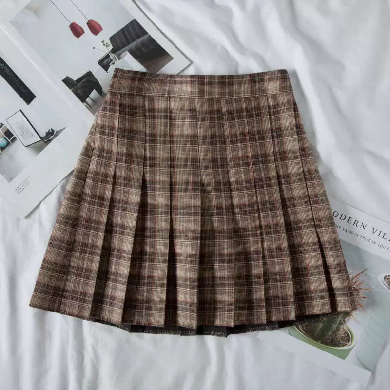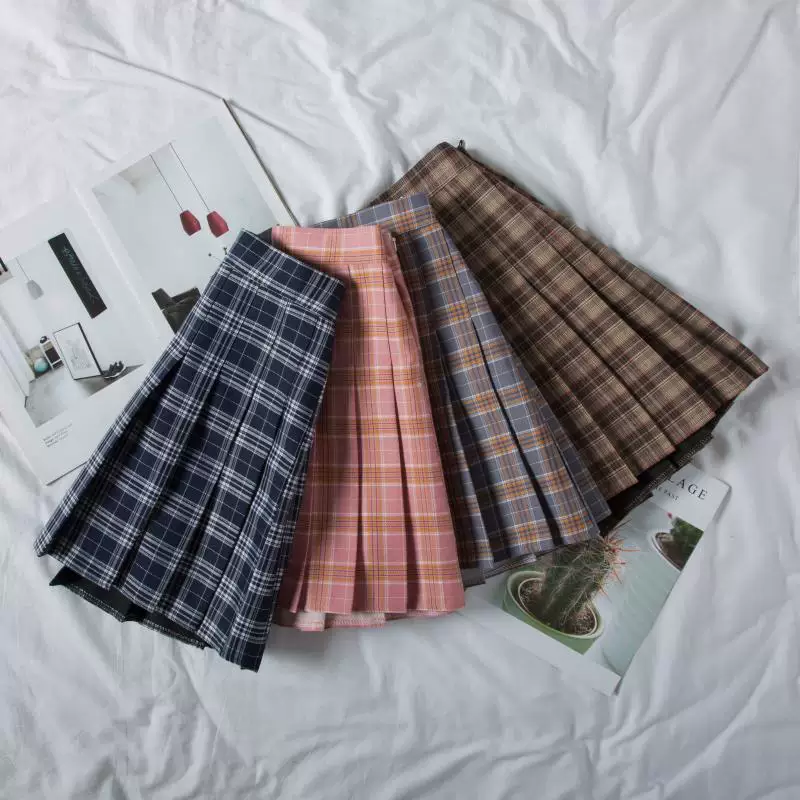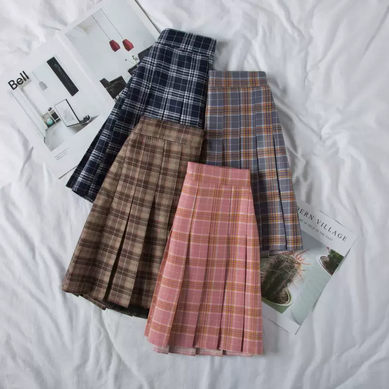 - Váy đồng phục mùa xuân JK váy xếp ly nữ cỡ lớn váy ngắn kẻ sọc cô gái béo váy chữ A eo cao váy học sinh giảm béo