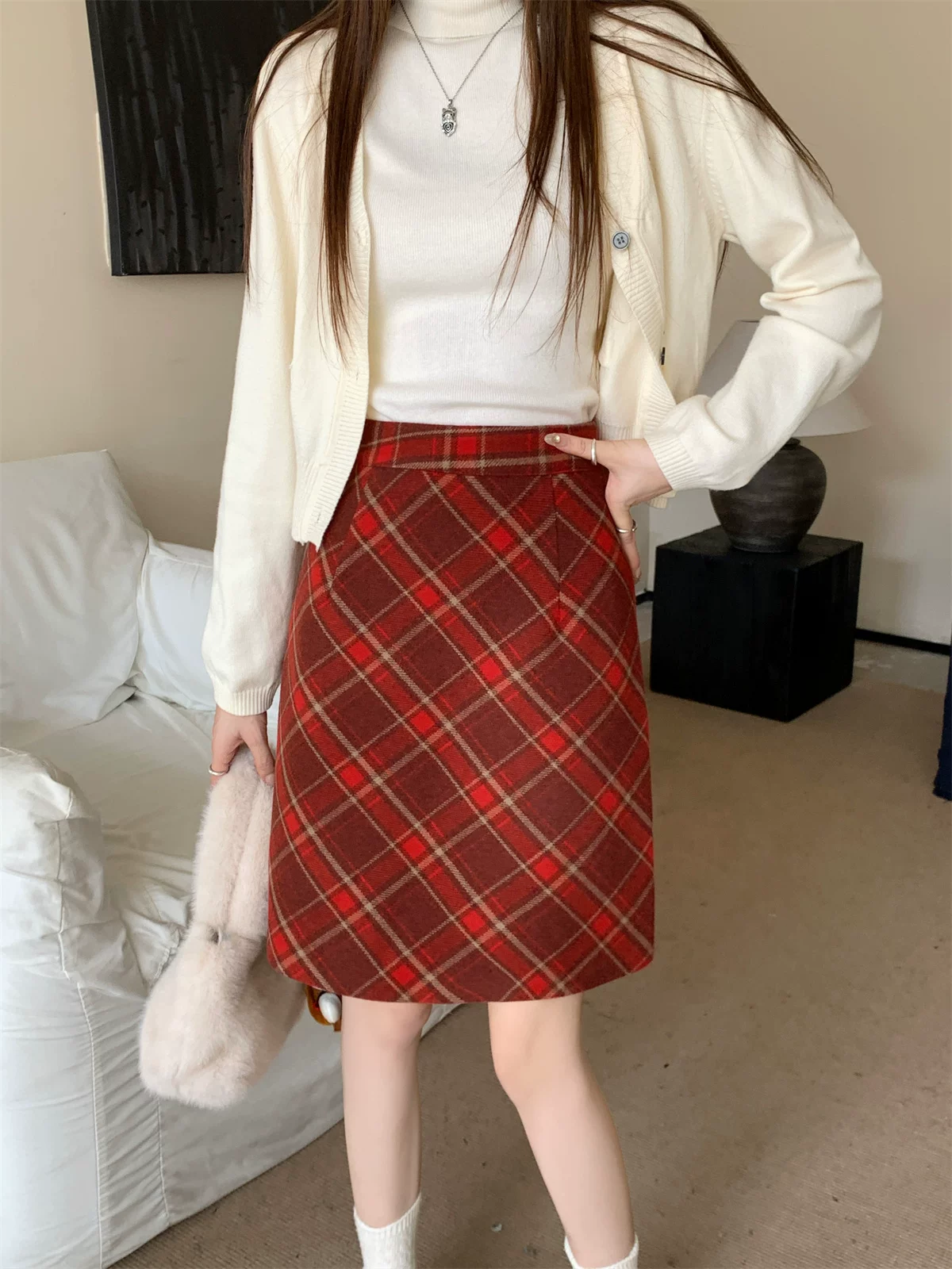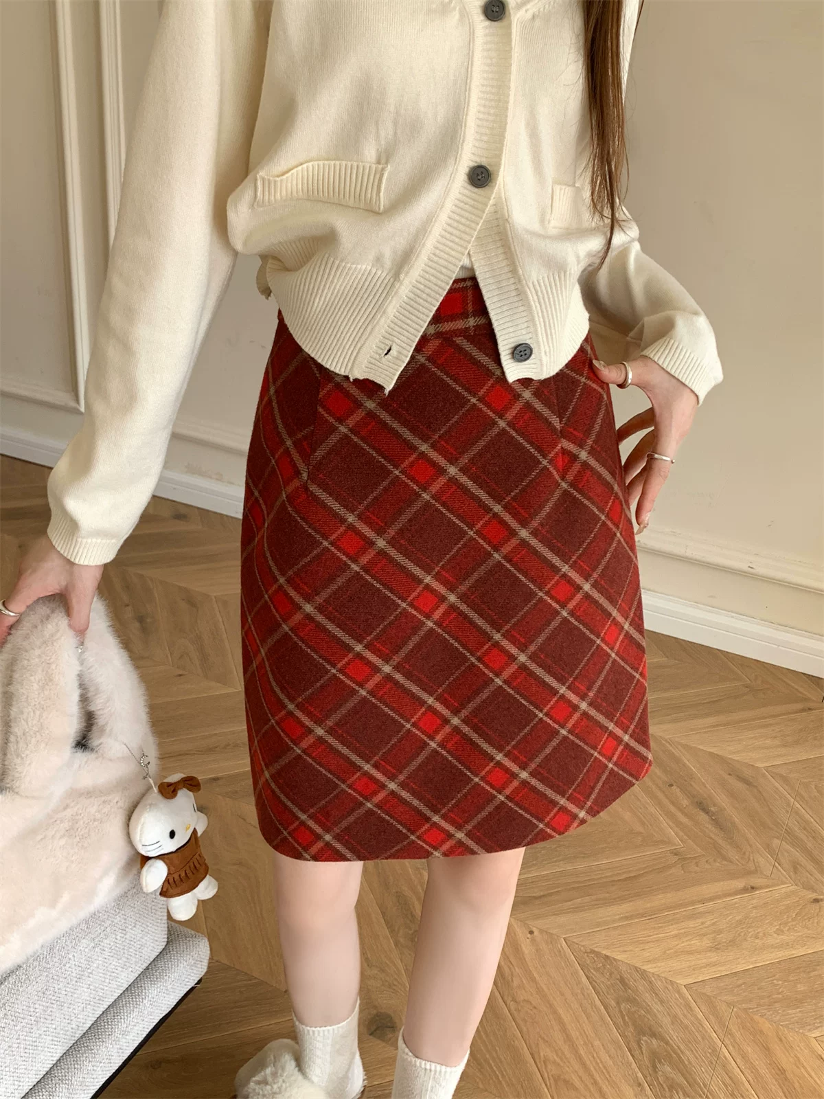 - Váy kẻ sọc đỏ cổ điển cỡ lớn dành cho nữ, váy bút chì chữ A cạp cao giảm béo mới mùa thu đông, váy dài vừa phải hợp thời trang.