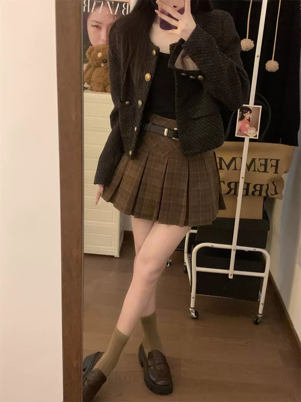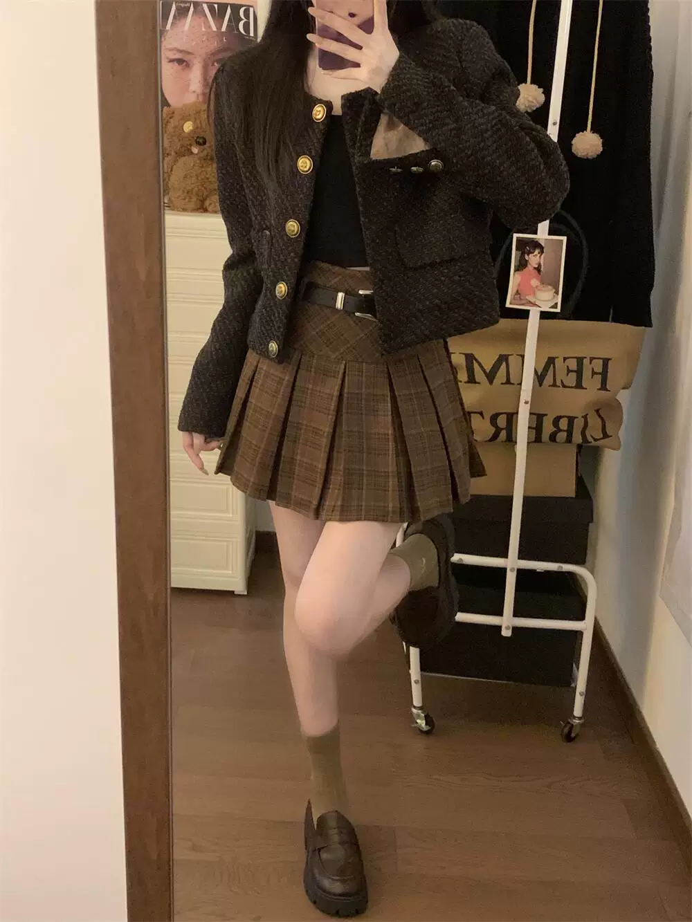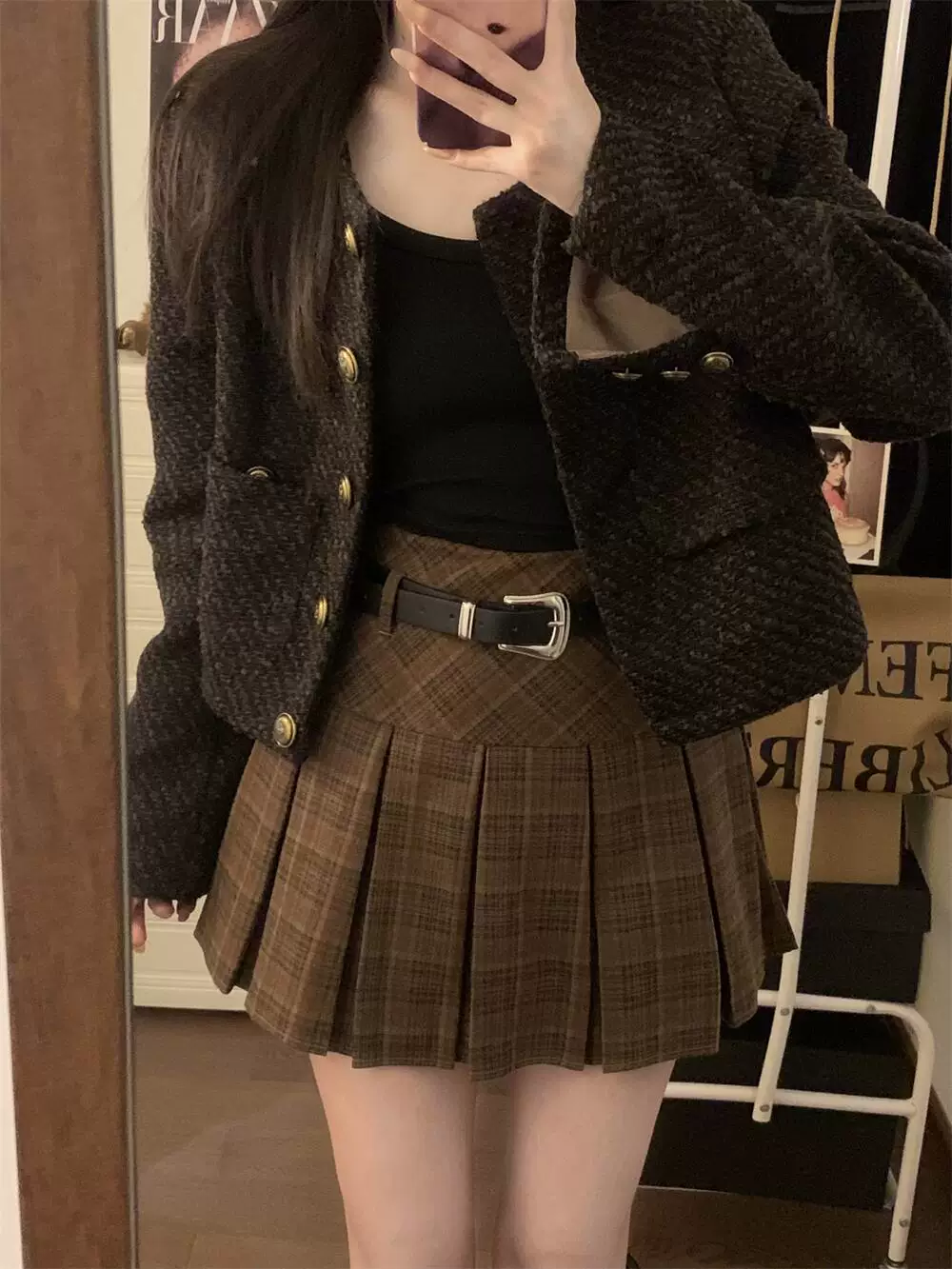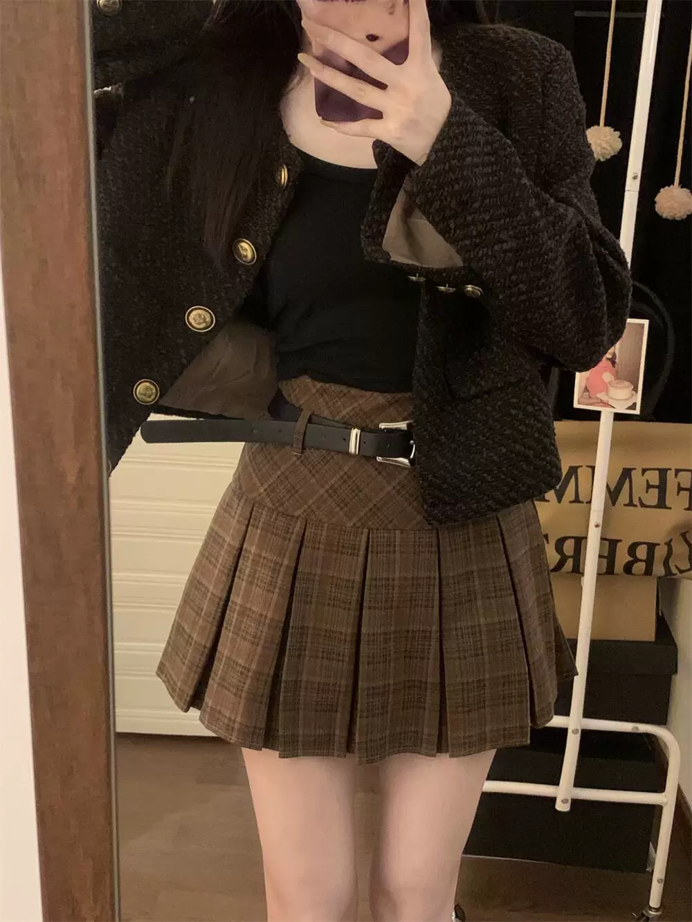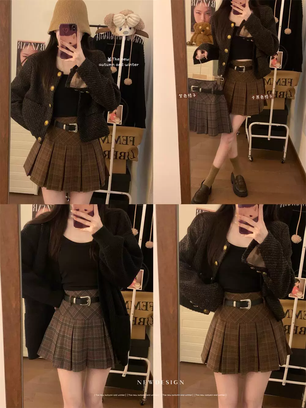 Váy kẻ sọc len cỡ lớn dành cho nữ, thiết kế thu đông, váy chữ A ôm hông, váy xếp ly chống lộ dành cho phụ nữ cỡ lớn, váy ngắn.
