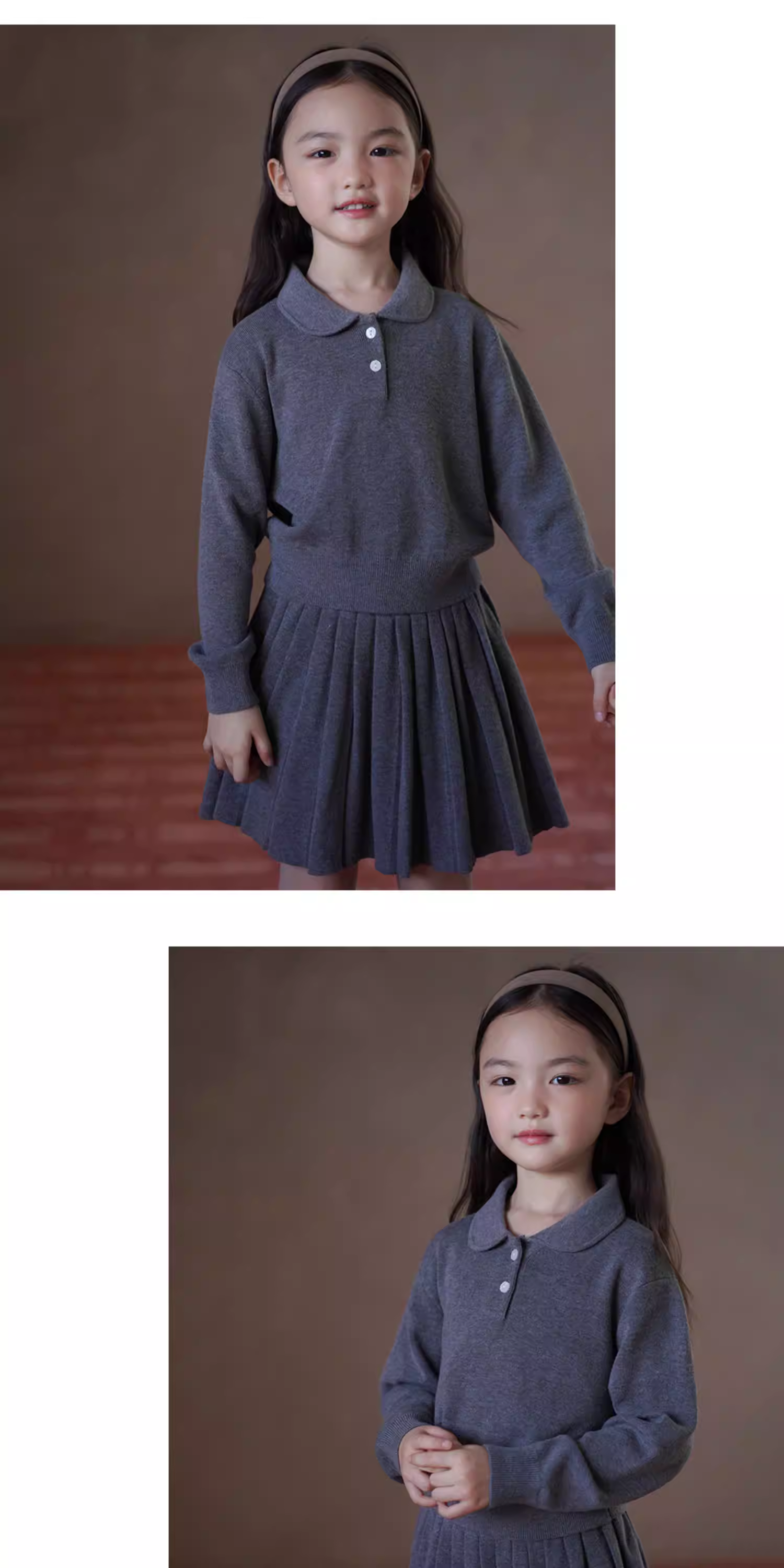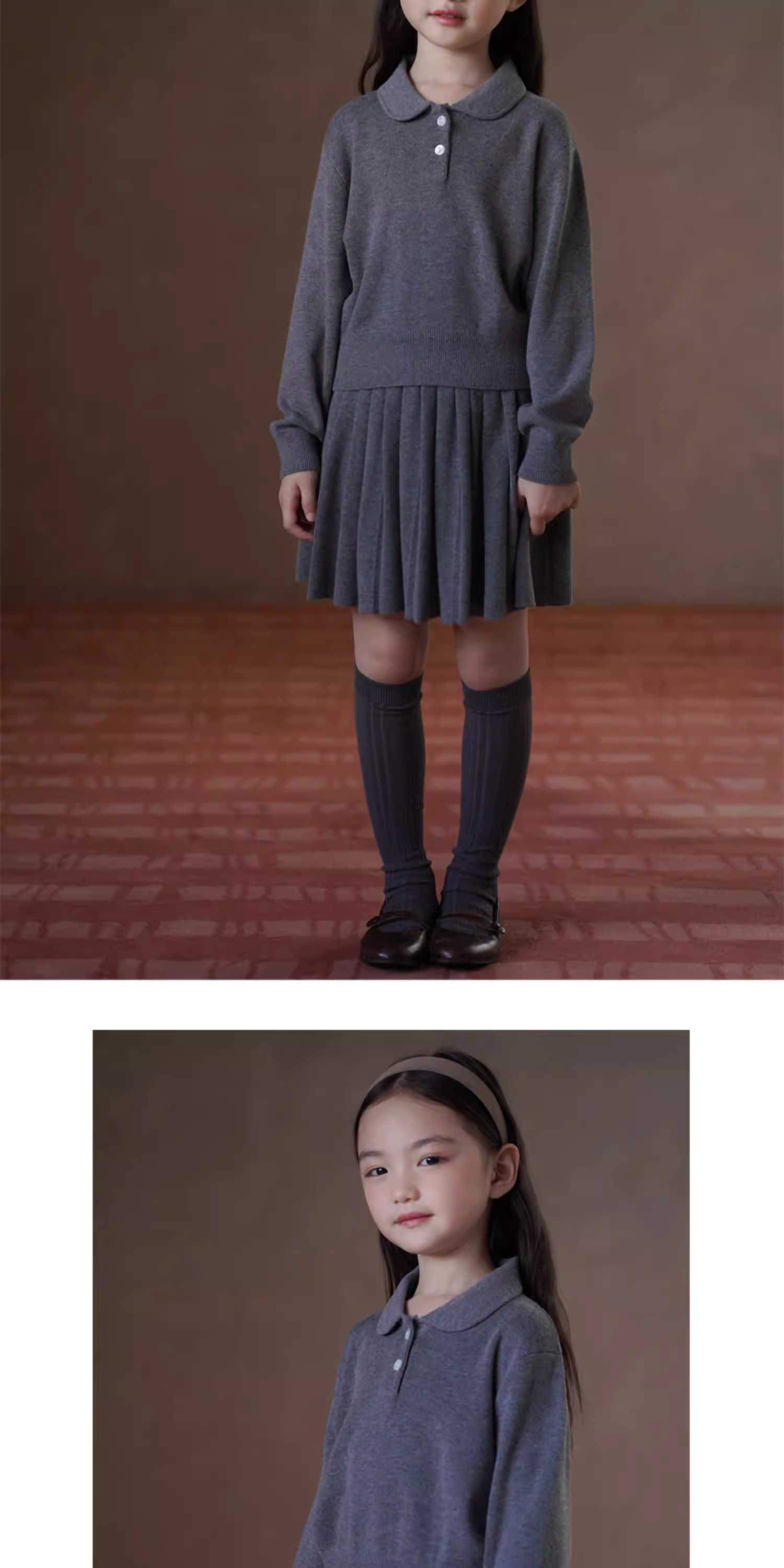 Váy len bé gái màu xám, kiểu dáng đa năng, phong cách học sinh, xếp ly, thích hợp cho mùa xuân và mùa thu.