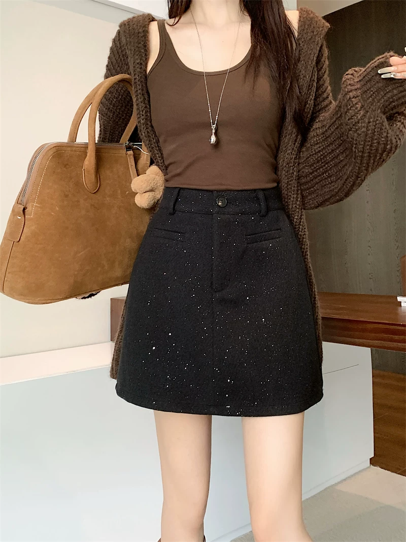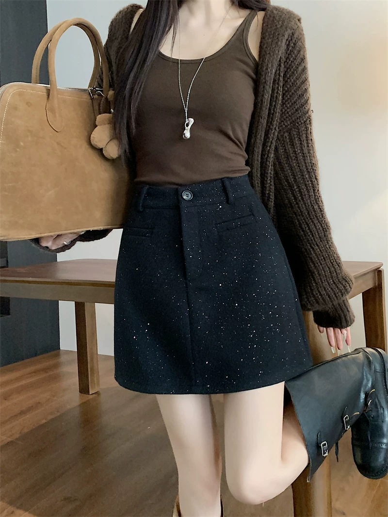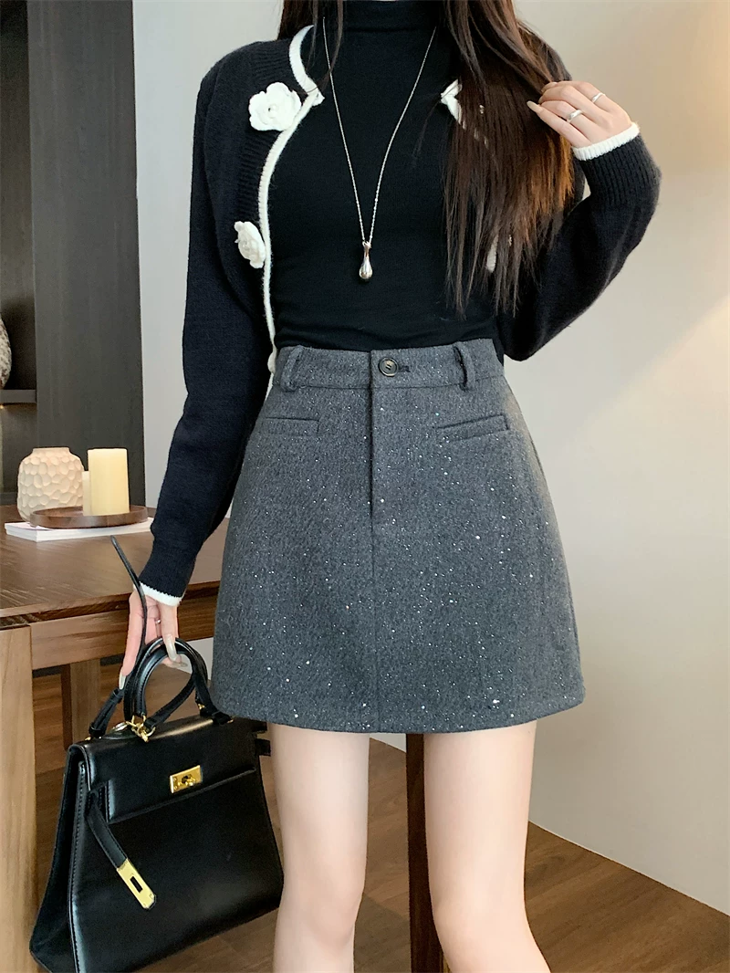 Váy len bóng mượt, váy ôm hông cao eo, size lớn dành cho nữ mùa thu đông, váy ngắn chữ A đính sequin kiểu Chanel