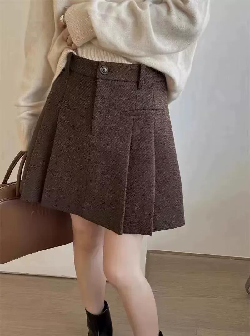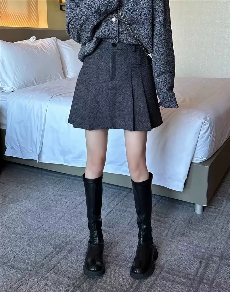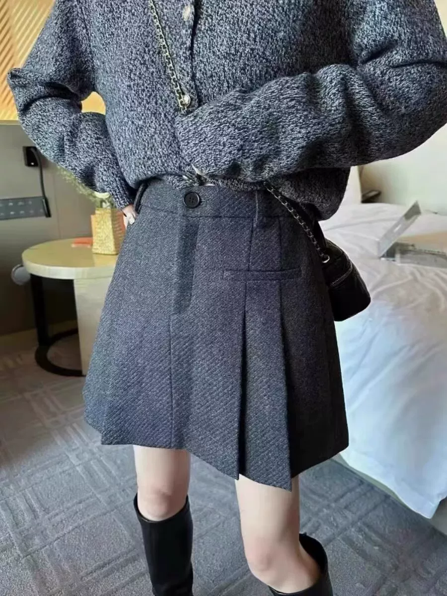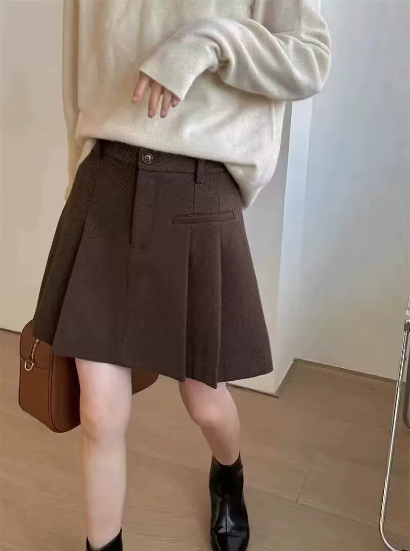 Váy len cao eo mùa thu đông 2024 dành cho nữ, váy chữ A chống lộ, size lớn, váy ngắn xếp ly tôn dáng cho nữ.