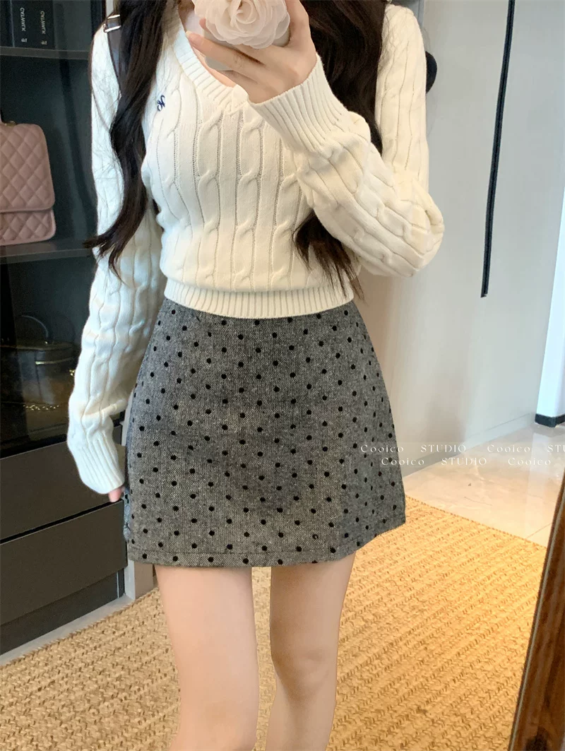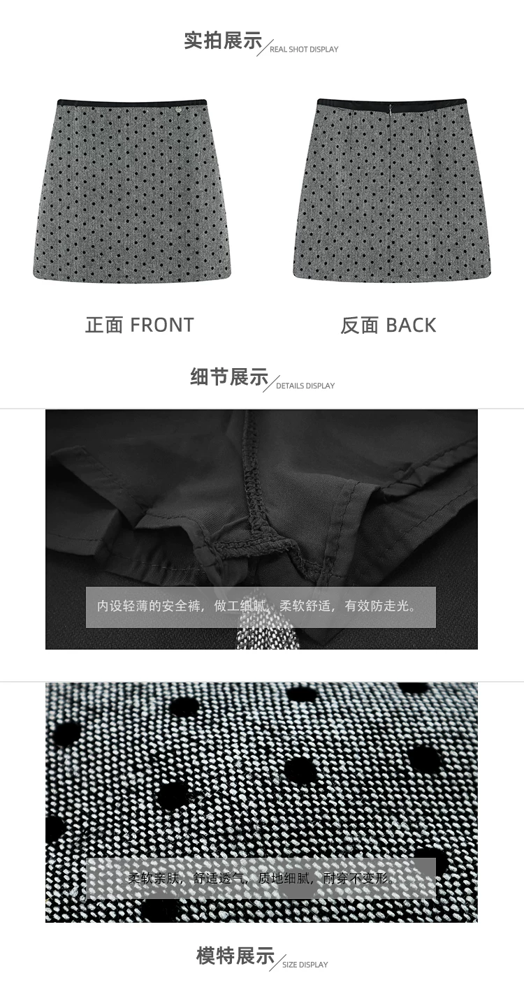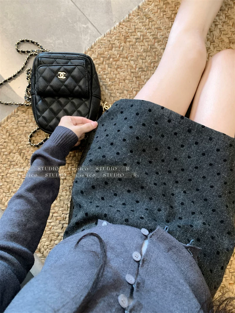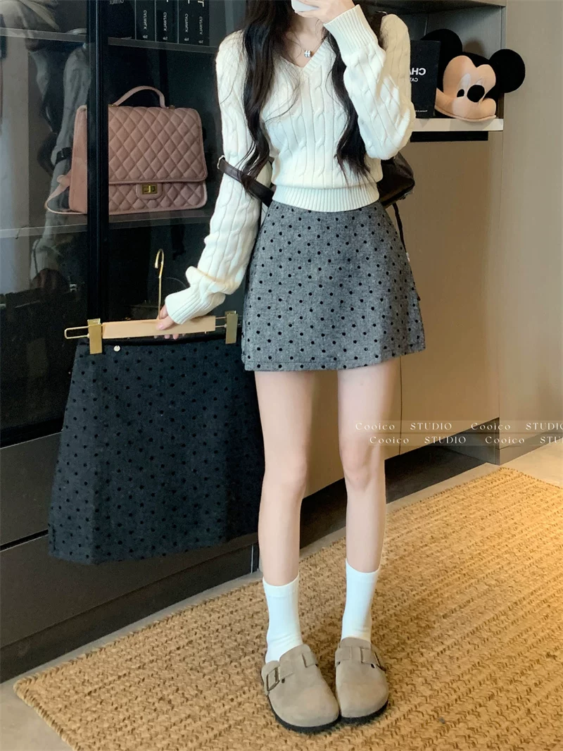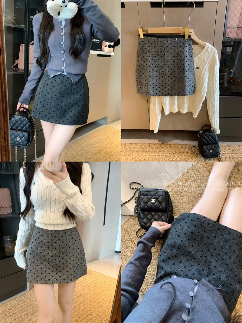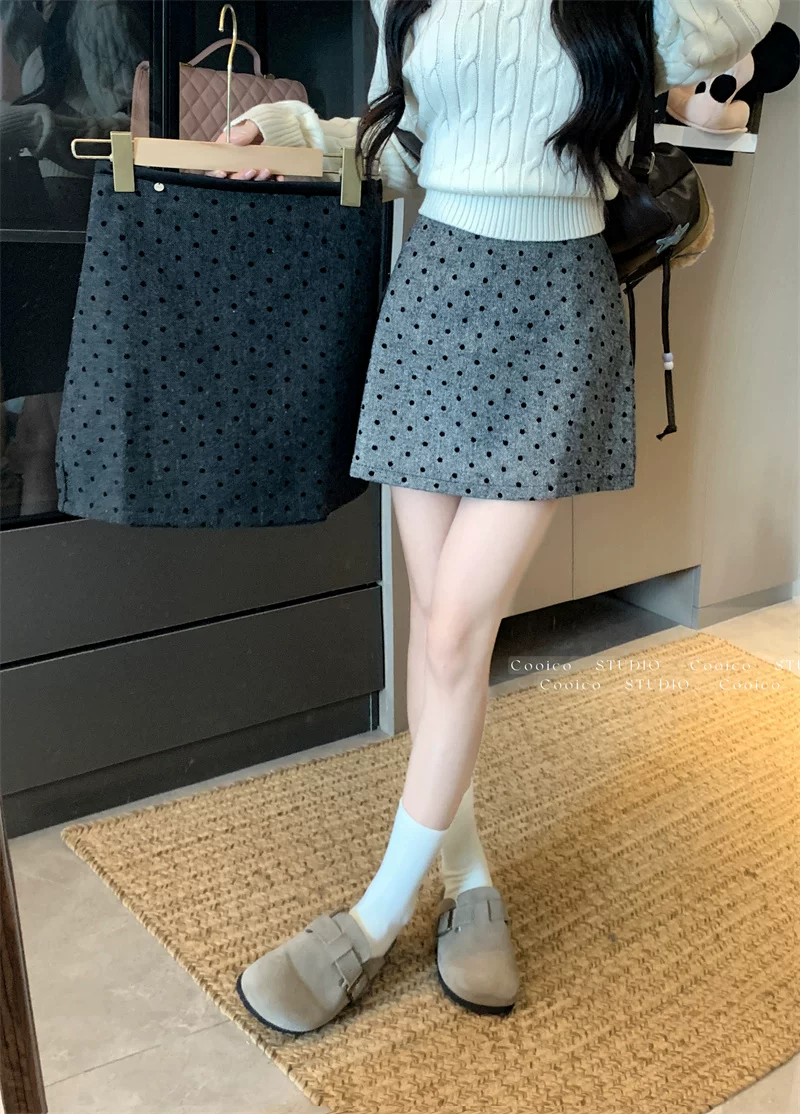 Váy len chấm bi màu xám dành cho nữ mùa đông, váy chữ A ôm hông eo cao, dáng nhỏ nhắn, có chân váy ngắn chống lộ