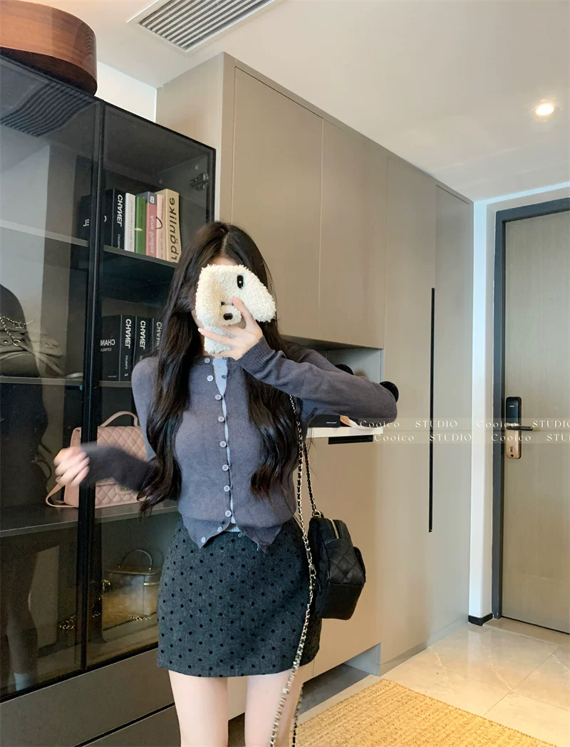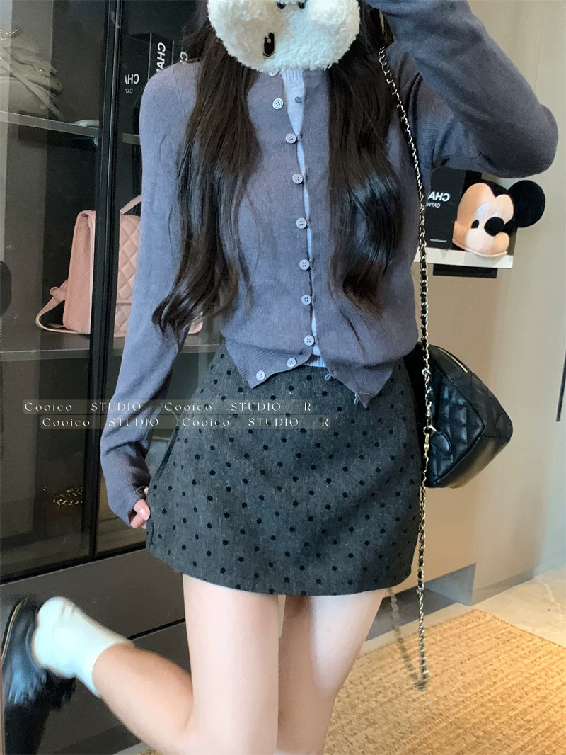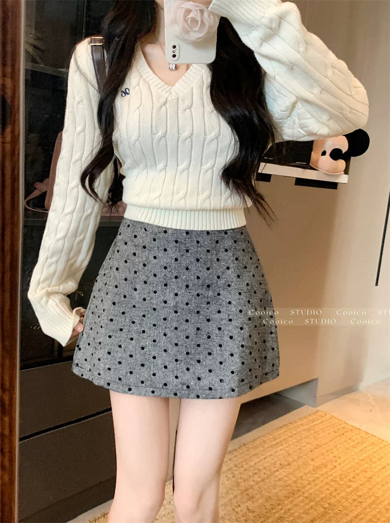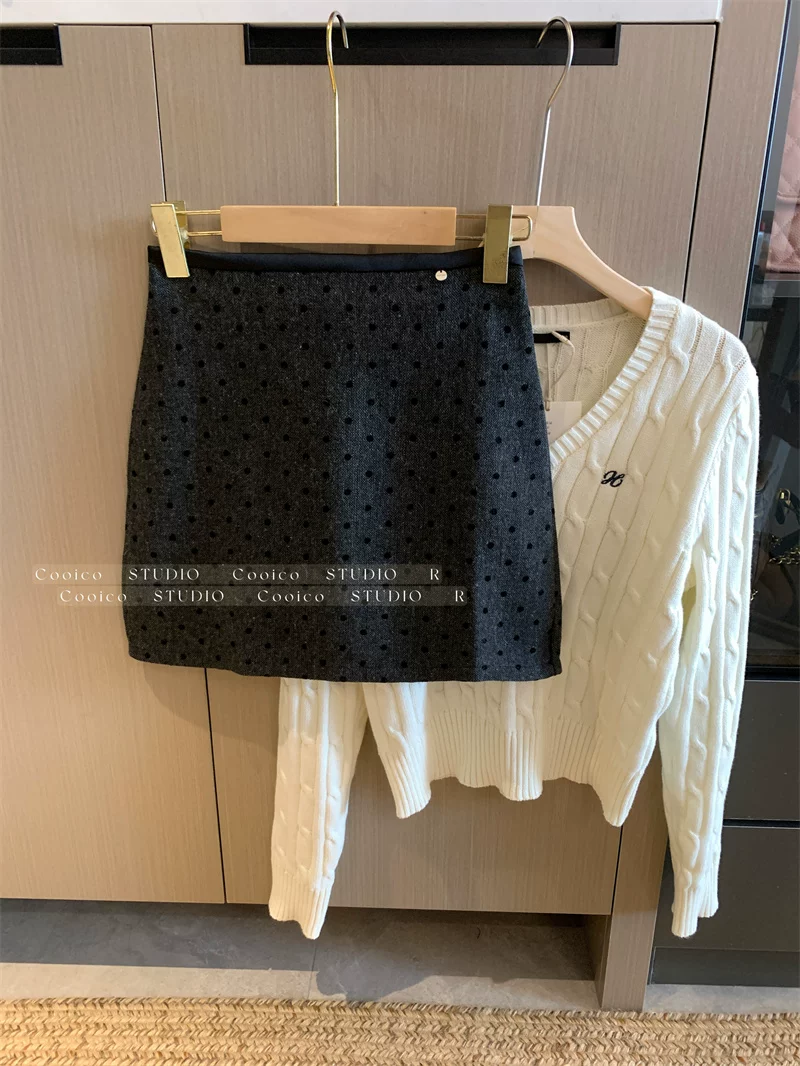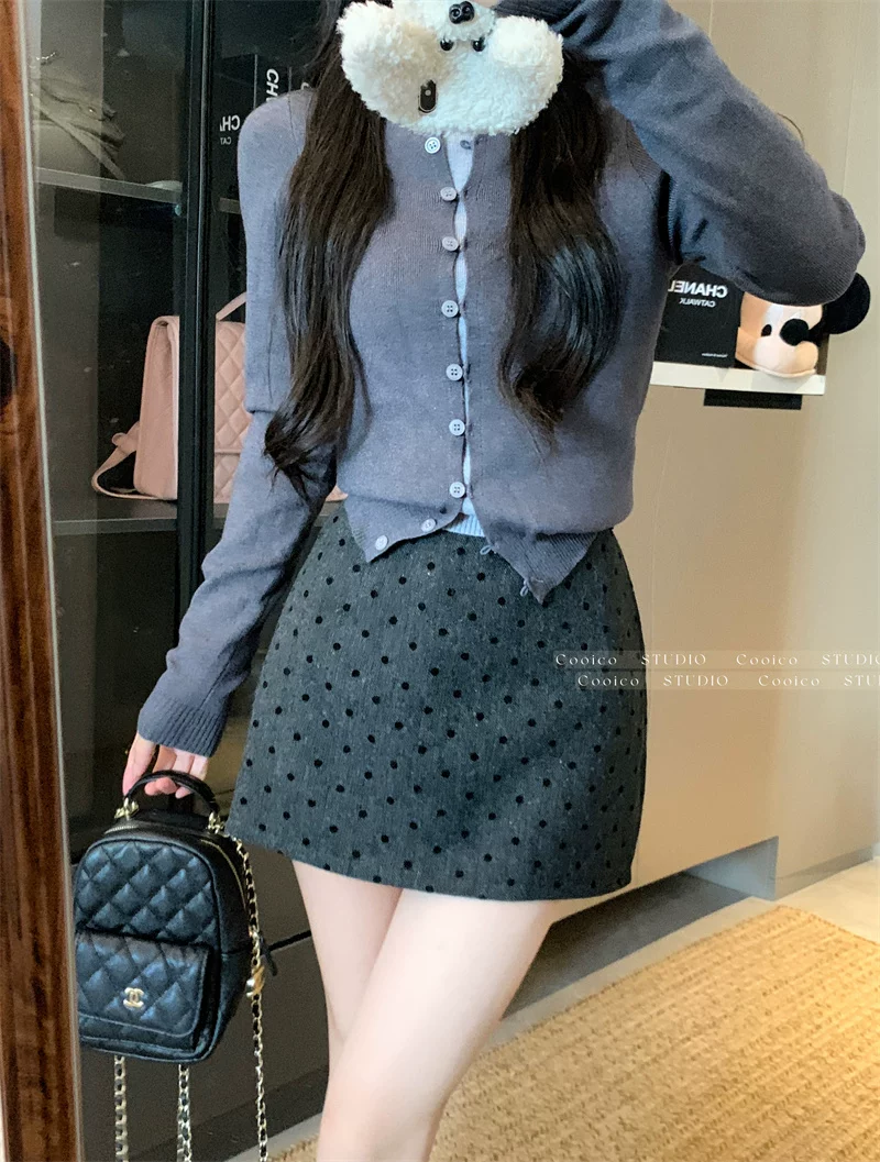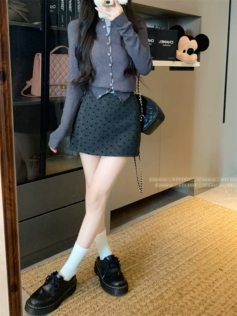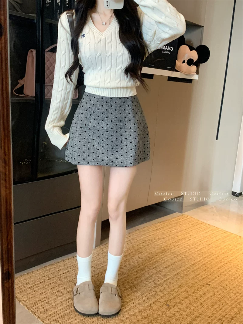 Váy len chấm bi màu xám dành cho nữ mùa đông, váy chữ A ôm hông eo cao, dáng nhỏ nhắn, có chân váy ngắn chống lộ