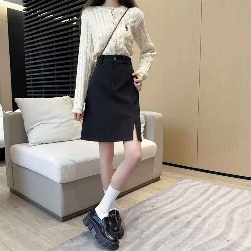 Váy len chấm bi màu xám dành cho nữ, mùa thu đông, cỡ lớn, lưng cao, tôn dáng, váy chữ A xẻ tà, váy midi ôm hông dành cho phụ nữ cỡ lớn.