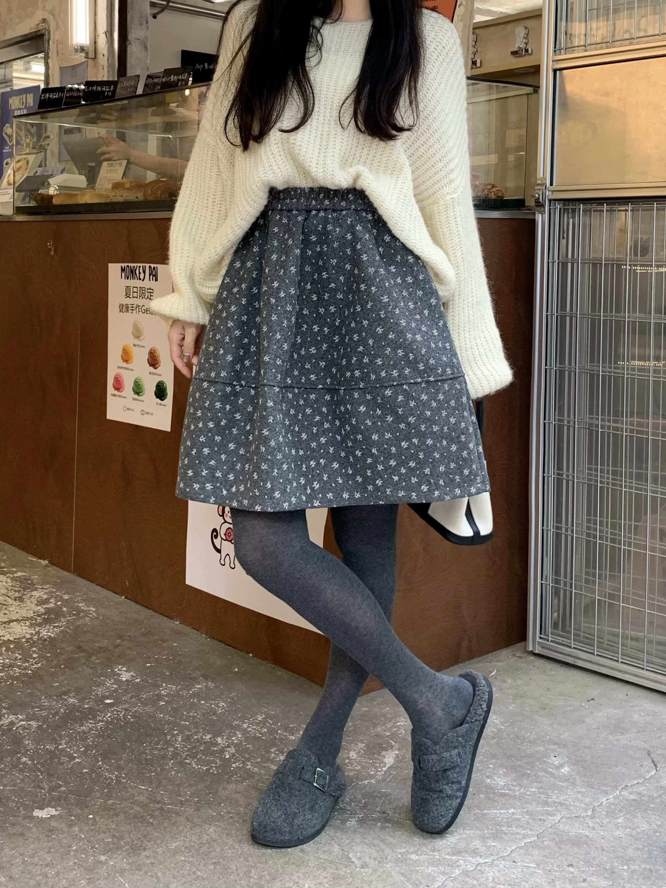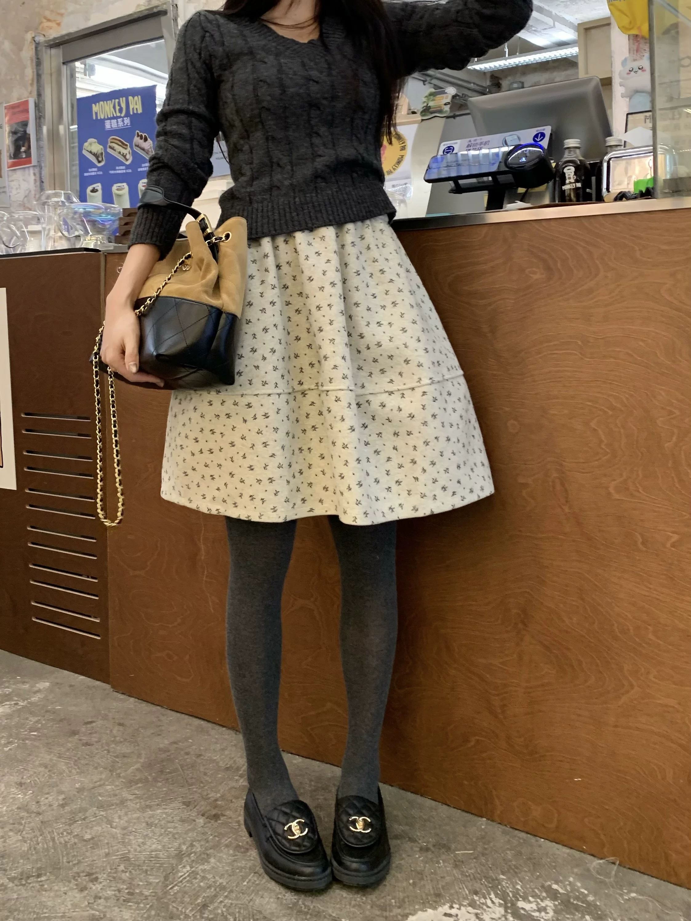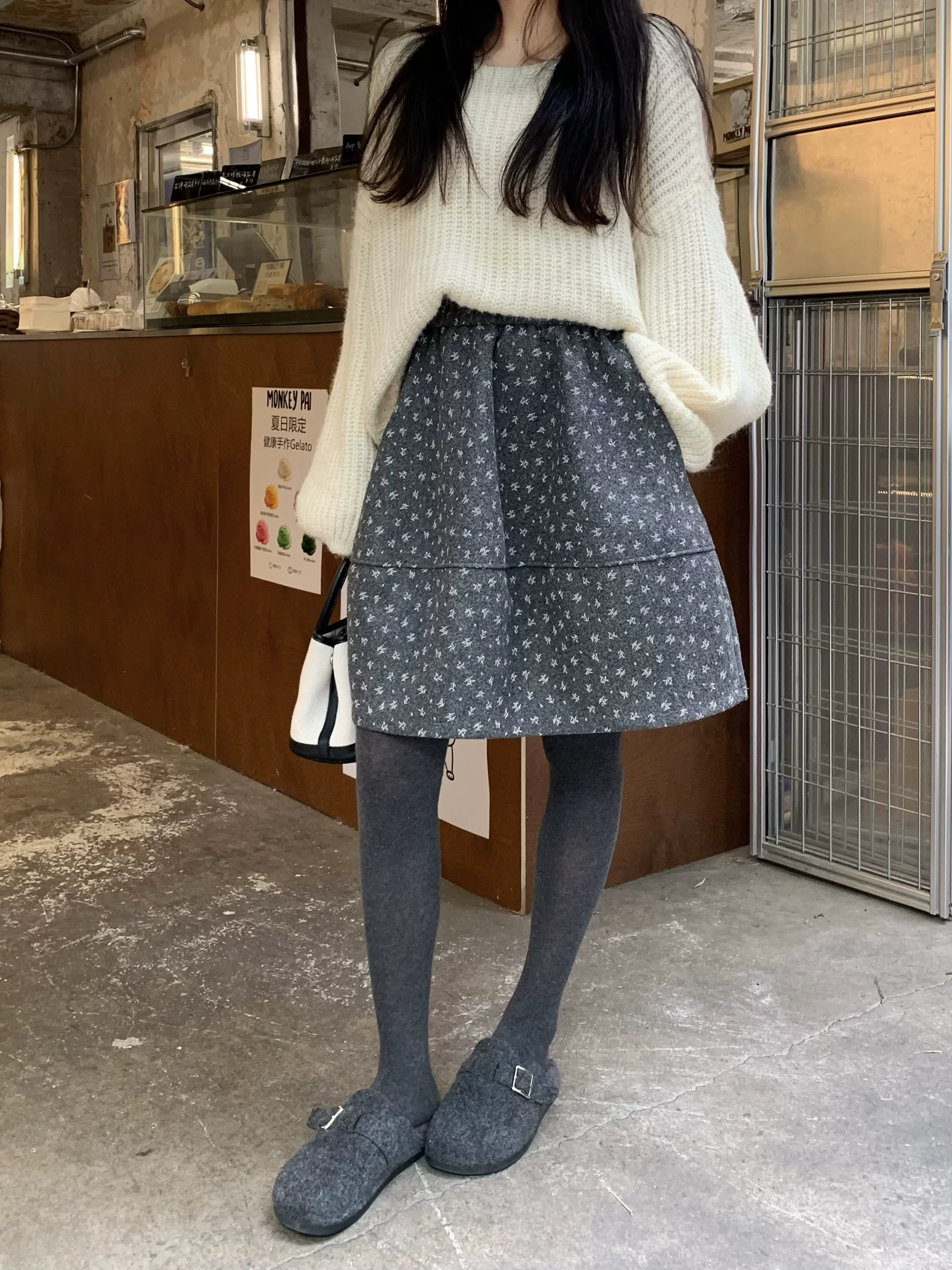 - Váy len hoa, cỡ lớn mùa thu đông, phong cách Miu, váy ngắn chữ A tôn dáng, váy dù dài ngang hông che hông, váy nụ hoa phồng.