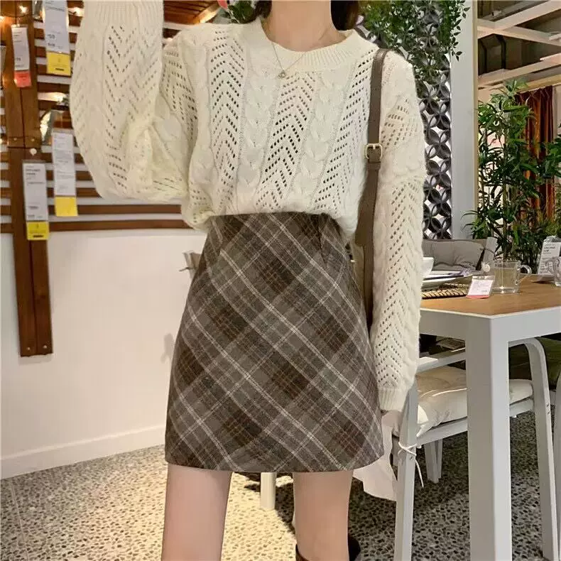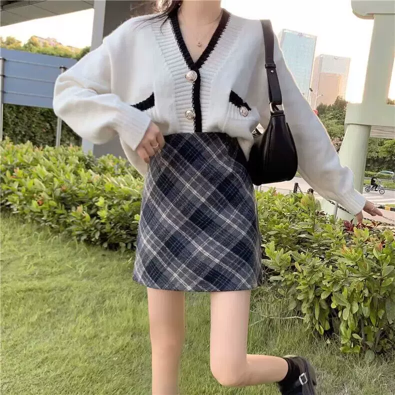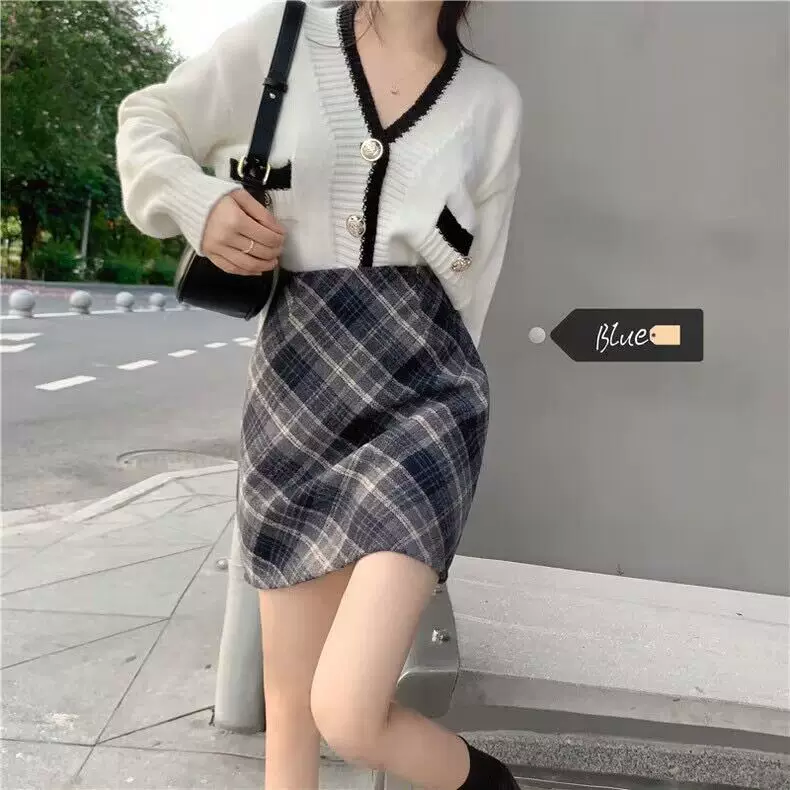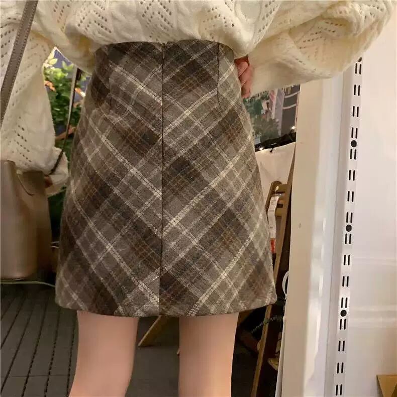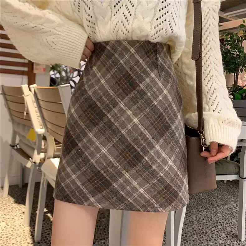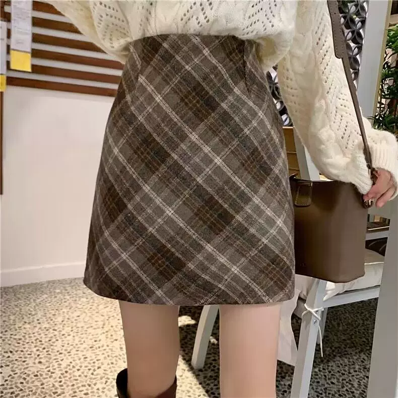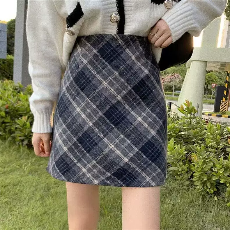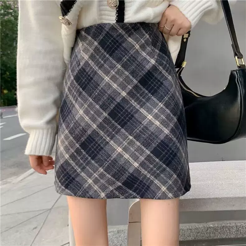 Váy len kẻ sọc cỡ lớn dành cho nữ, mùa thu đông, váy chữ A cạp cao, thon gọn, che hông, váy ngắn ôm sát cơ thể.