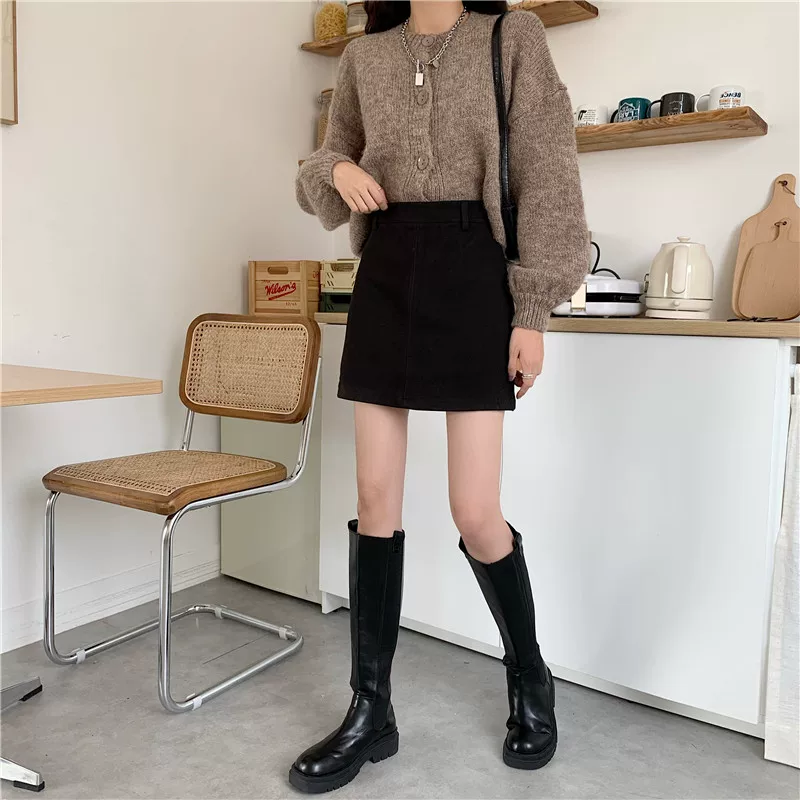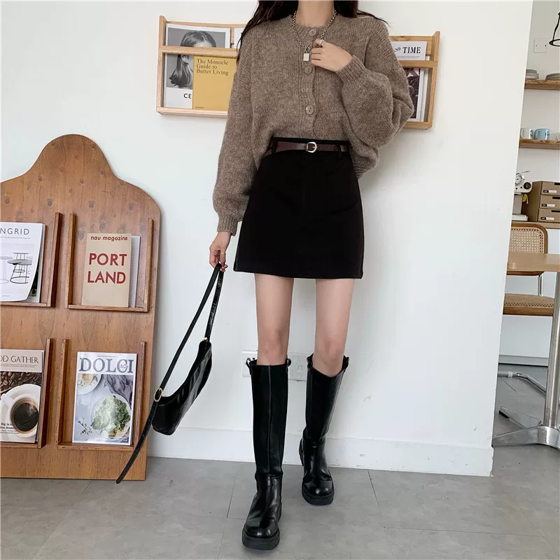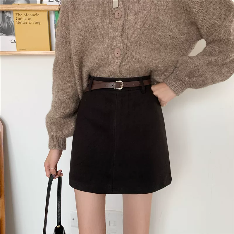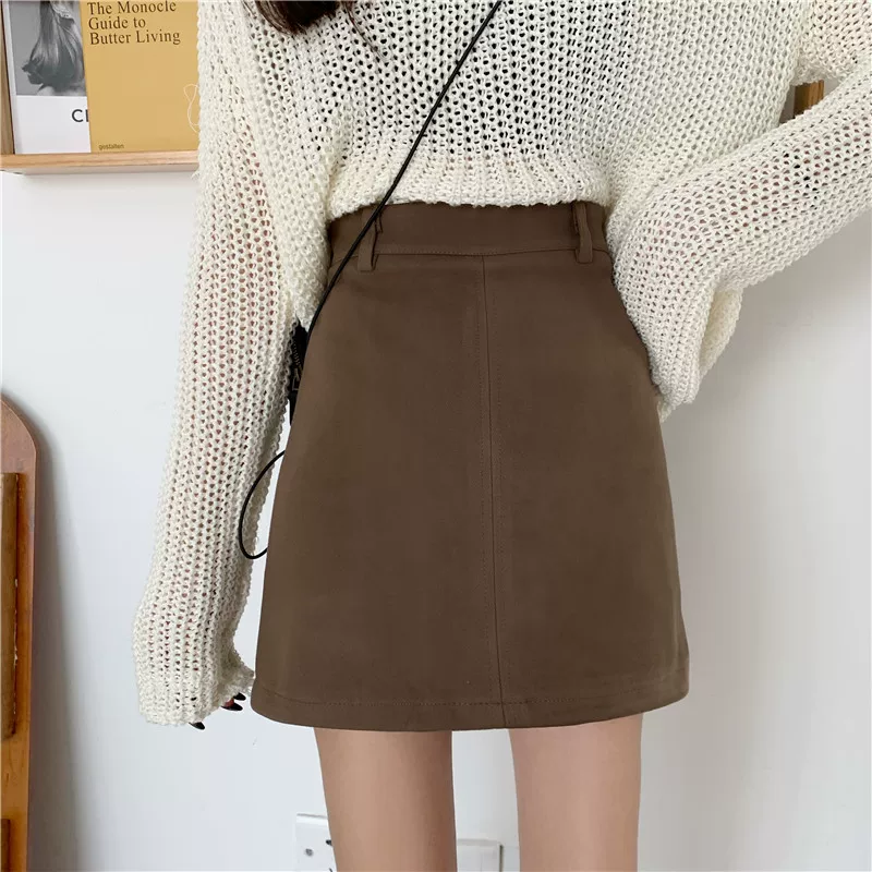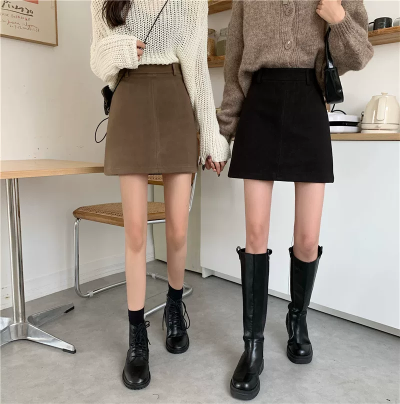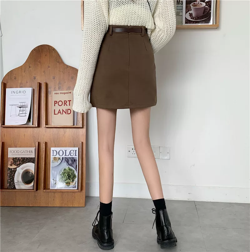 - Váy len màu nâu cỡ lớn dành cho nữ, váy bút chì chữ A cạp cao mùa thu đông, che hông, váy ngắn thon gọn.