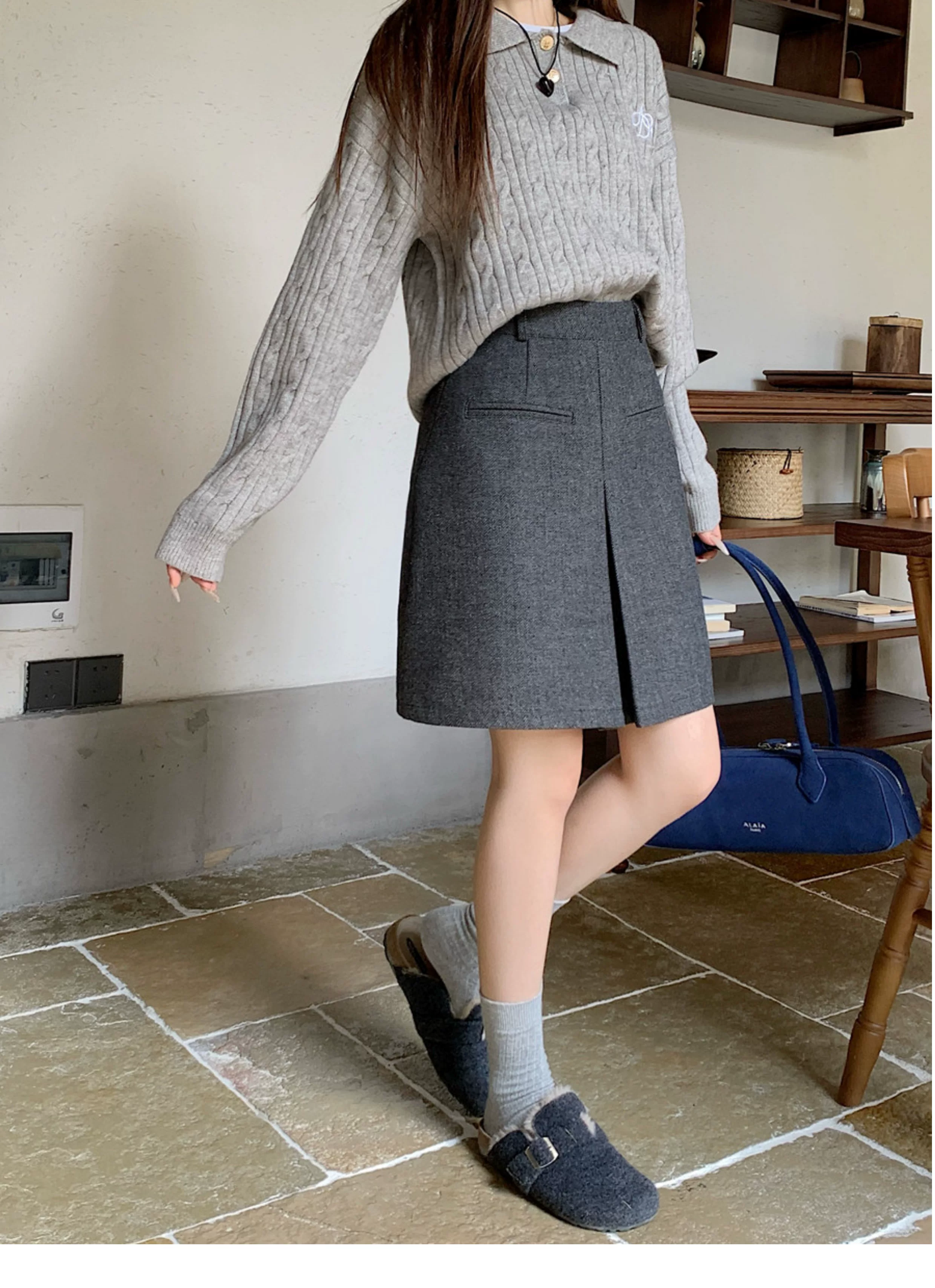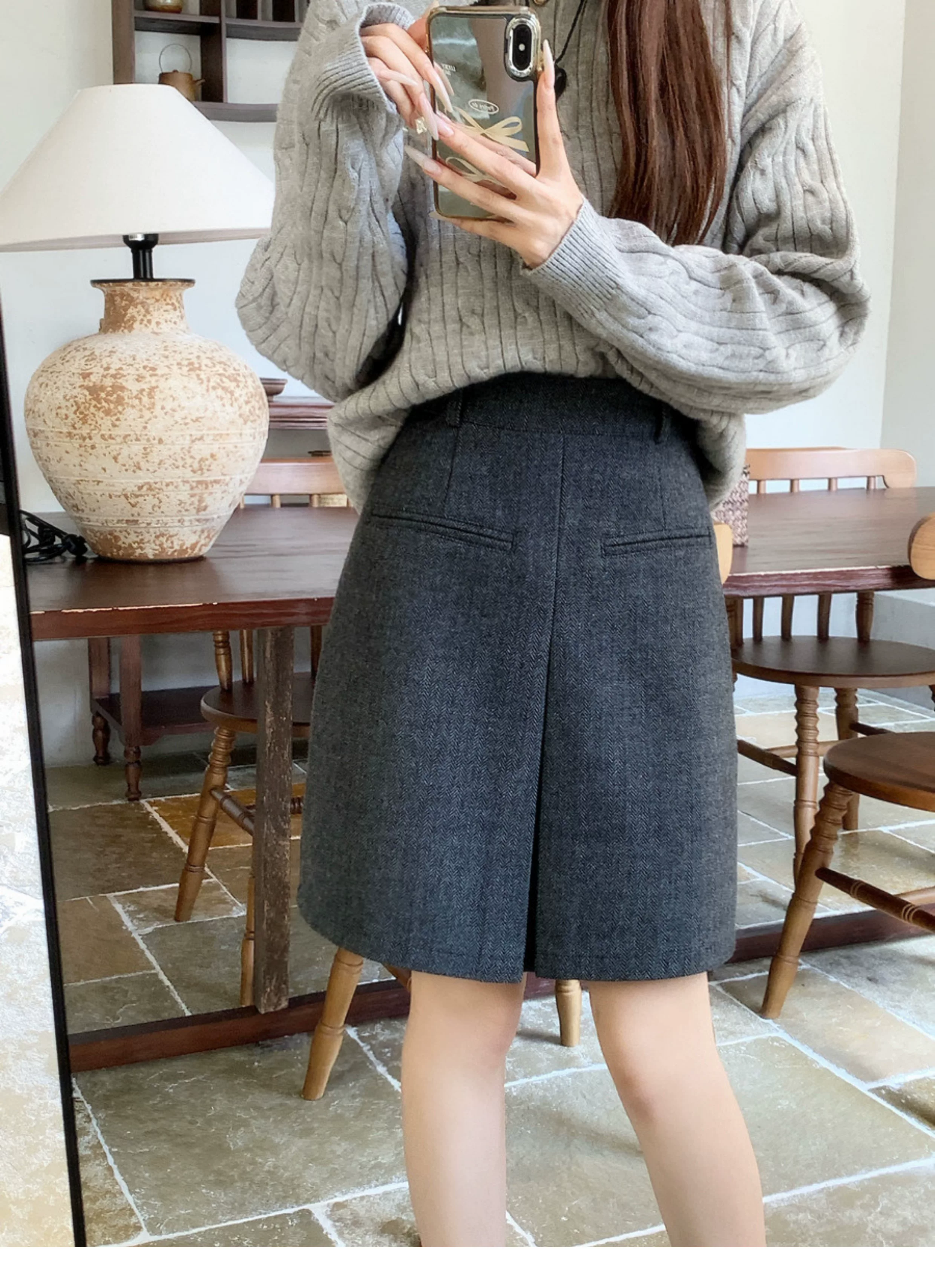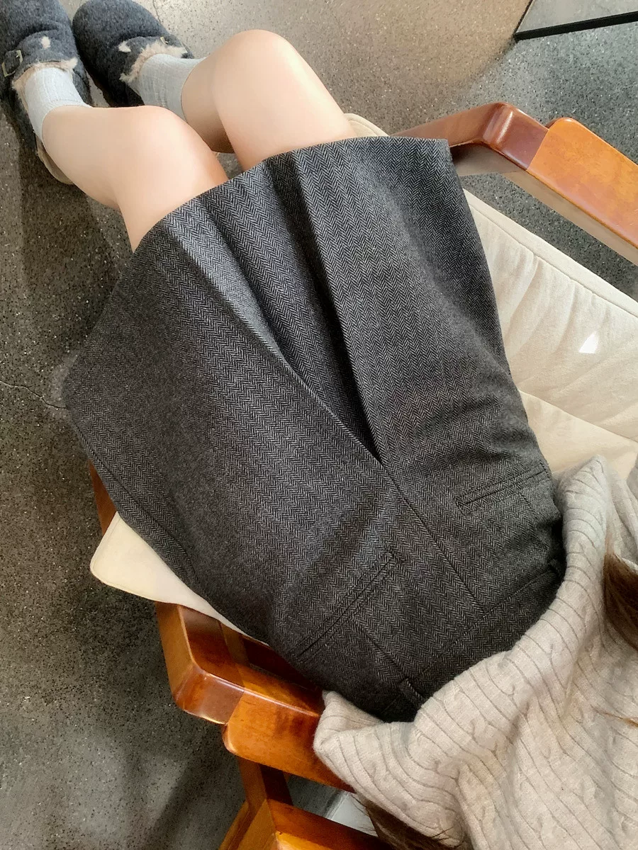 - Váy len màu xám cỡ lớn dành cho nữ, mùa thu đông, đa năng, che hông, lưng cao, váy ngắn chữ A giúp thon gọn.