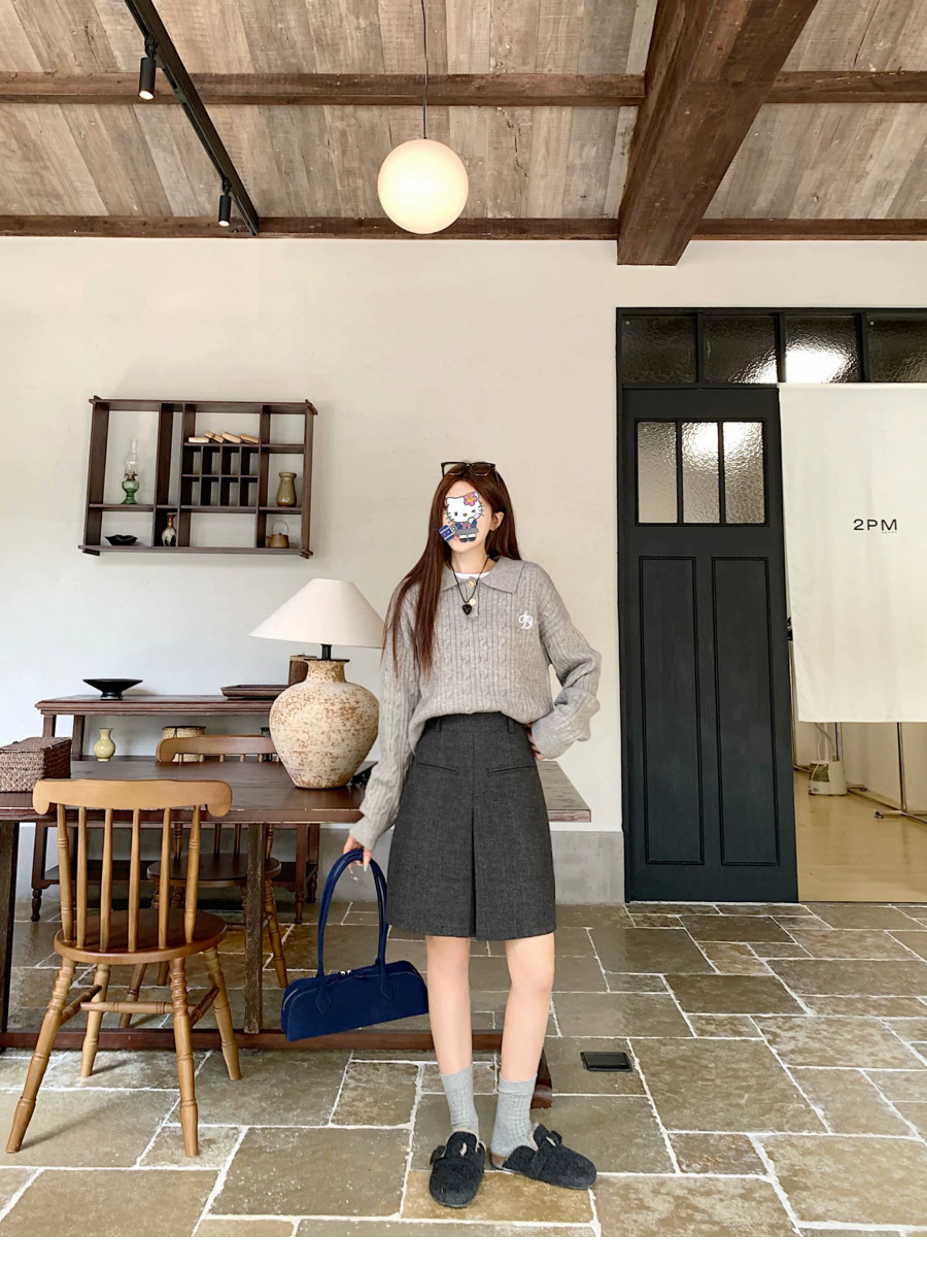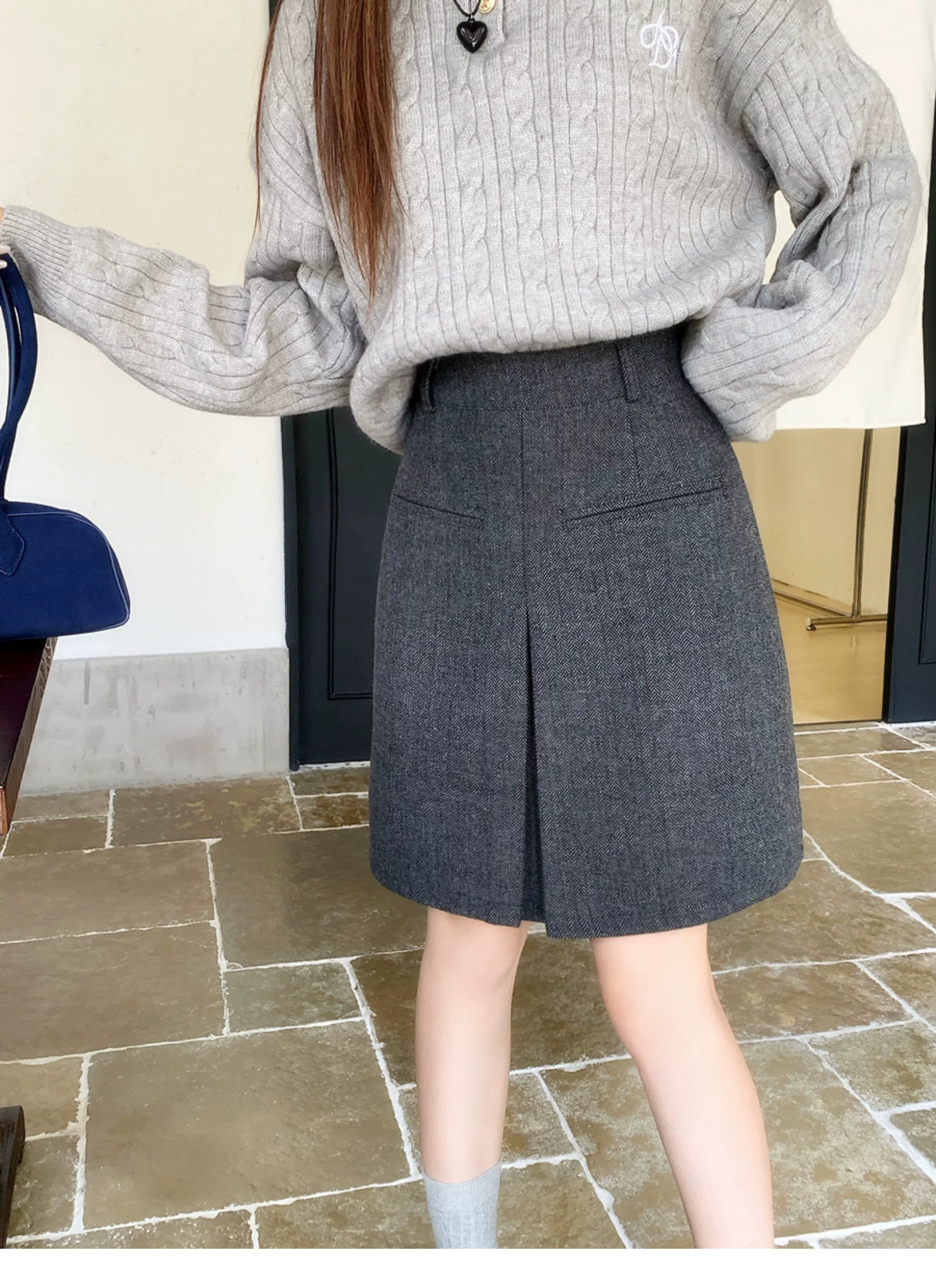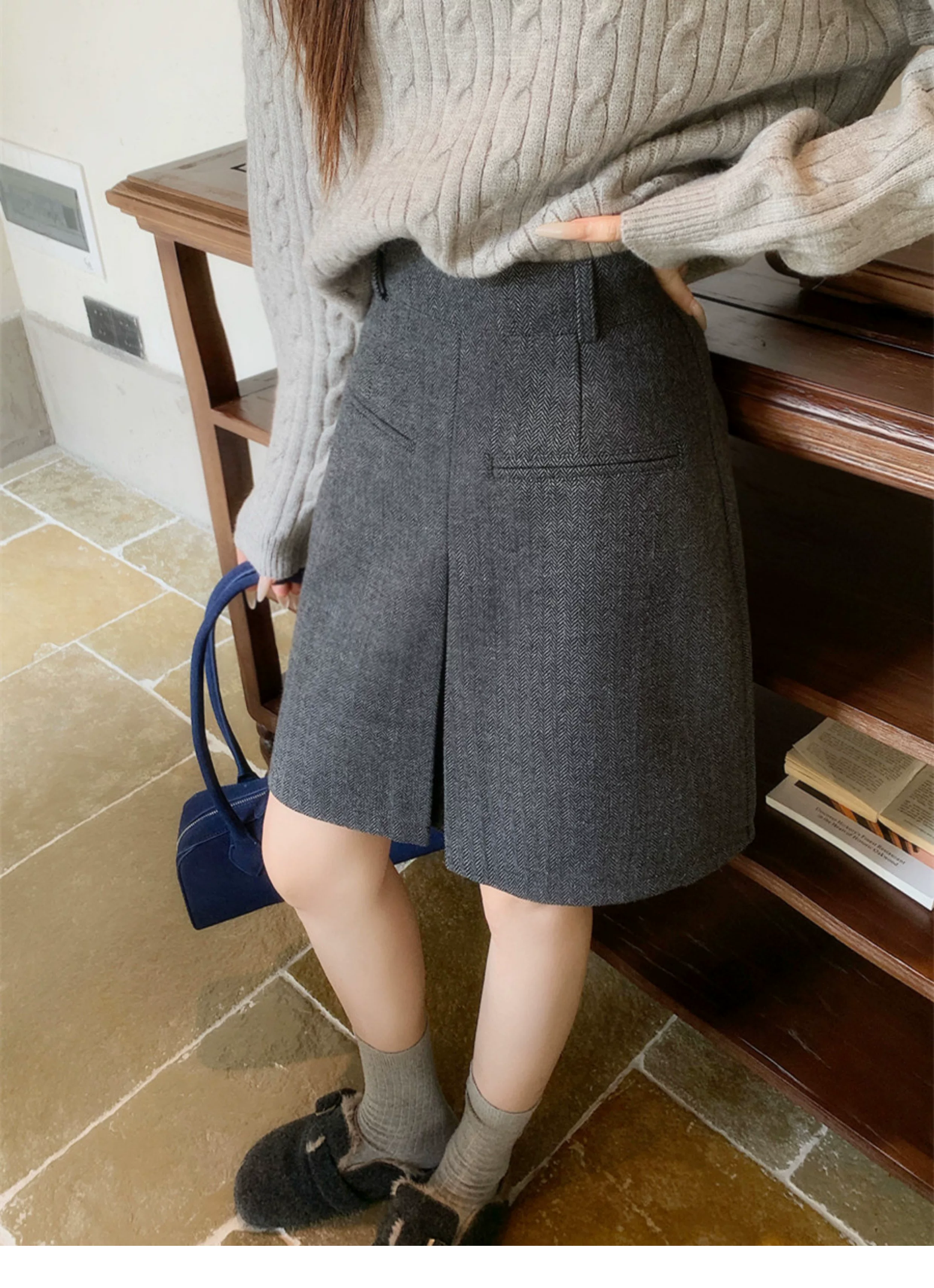 - Váy len màu xám cỡ lớn dành cho nữ, mùa thu đông, đa năng, che hông, lưng cao, váy ngắn chữ A giúp thon gọn.