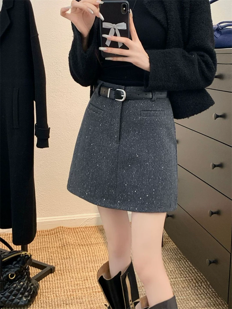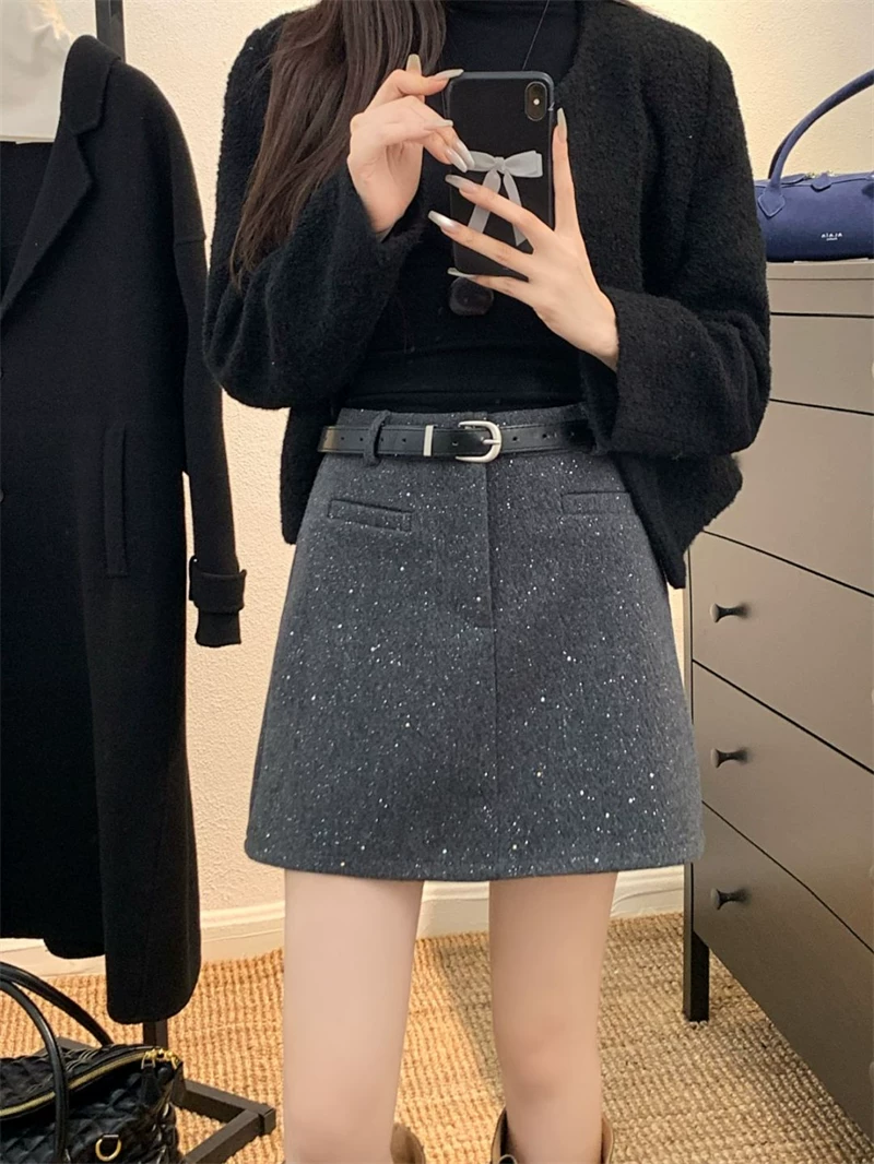 Váy len màu xám sáng bóng dành cho nữ, mùa thu đông, cỡ lớn, lưng cao, dáng nhỏ nhắn, váy ngắn đính sequin, váy bút chì dáng chữ A tôn dáng.