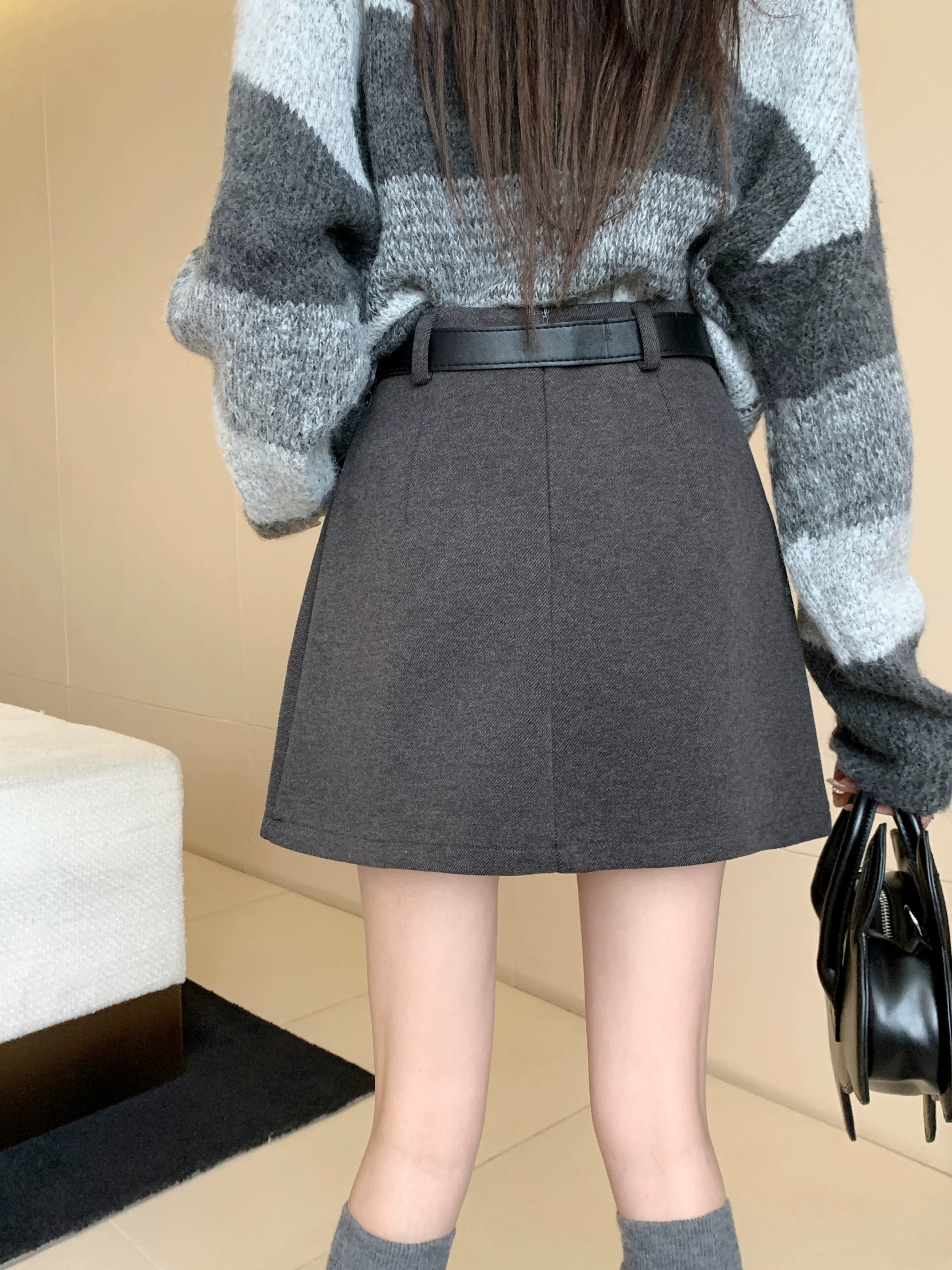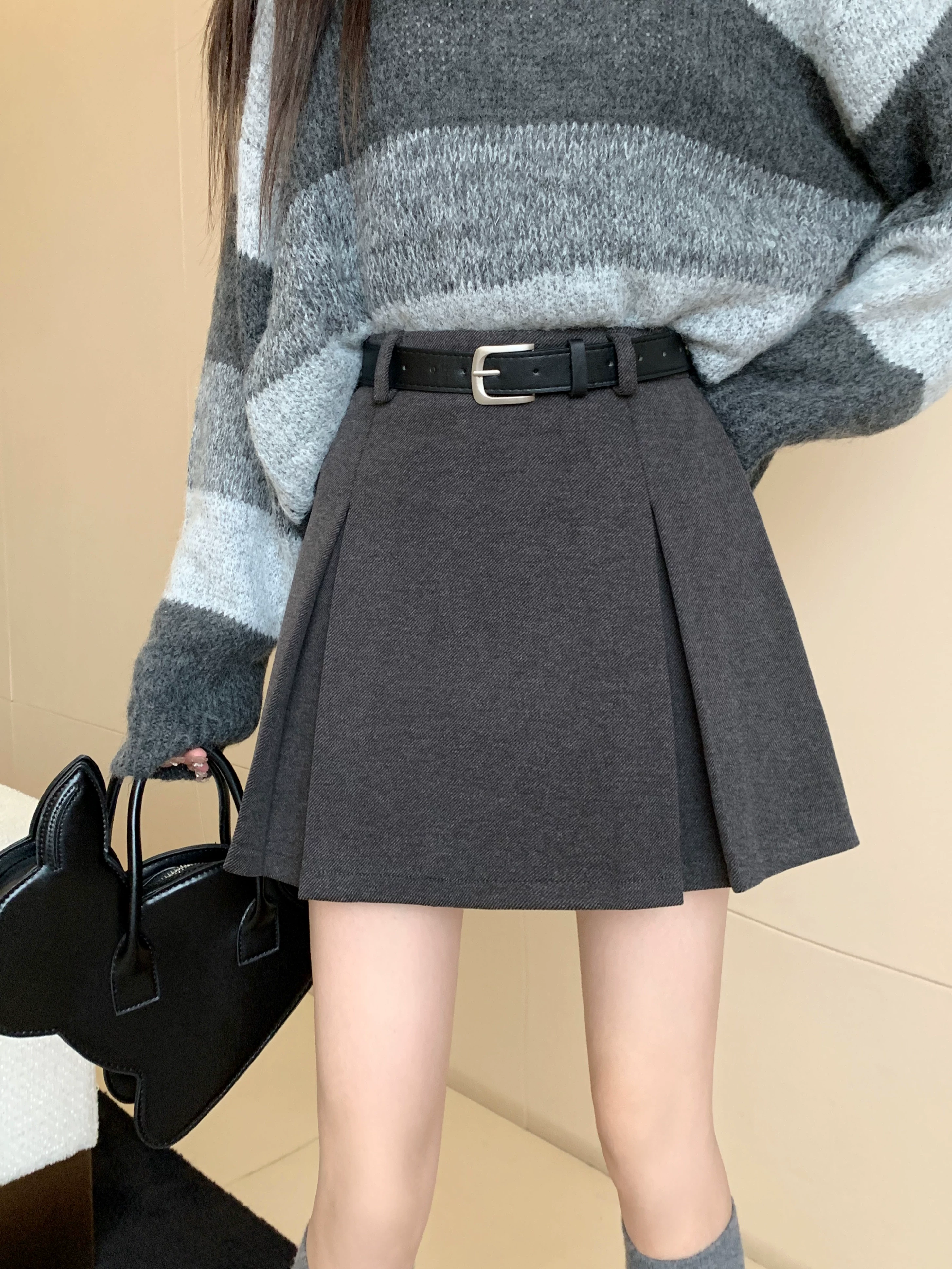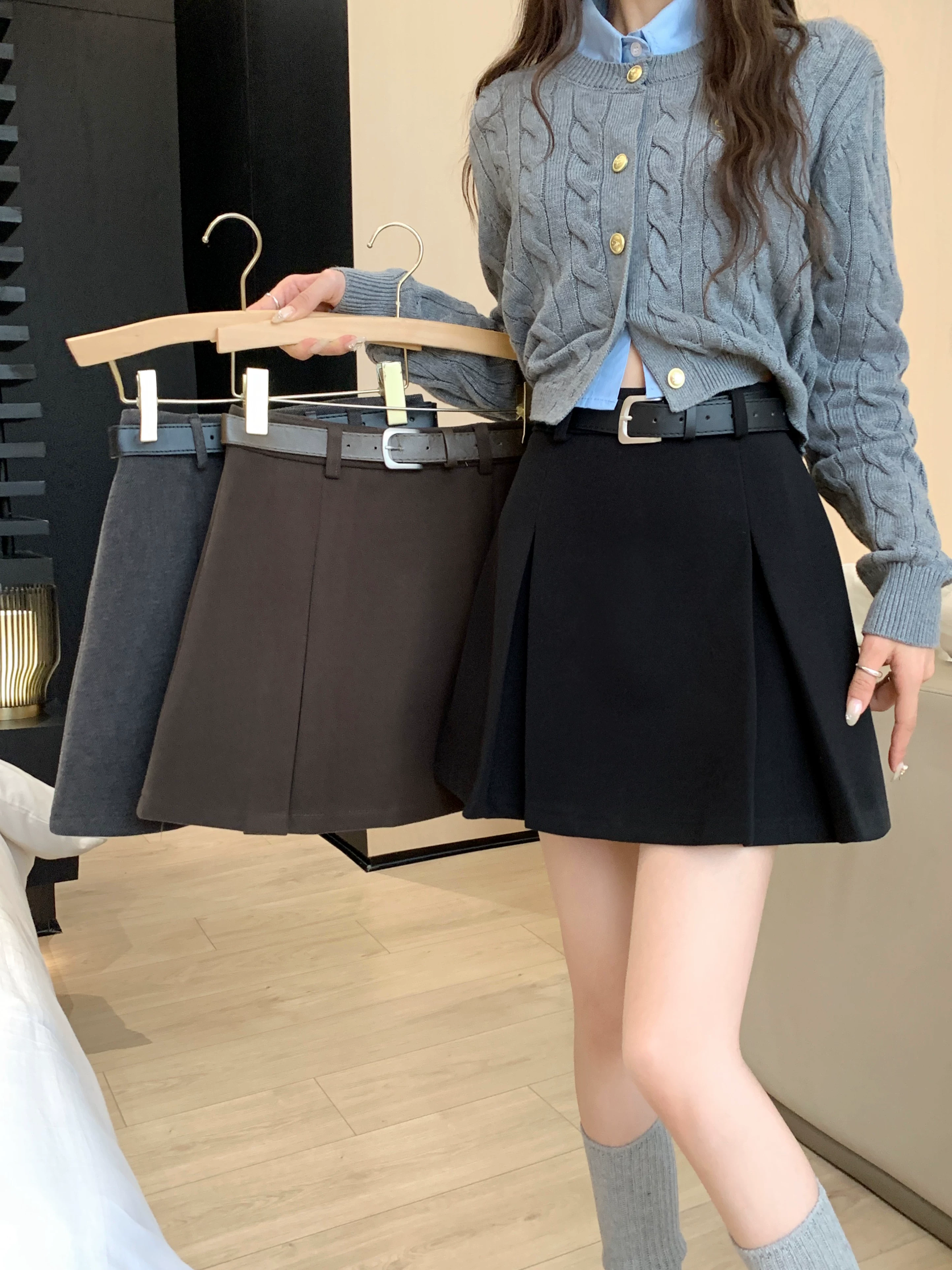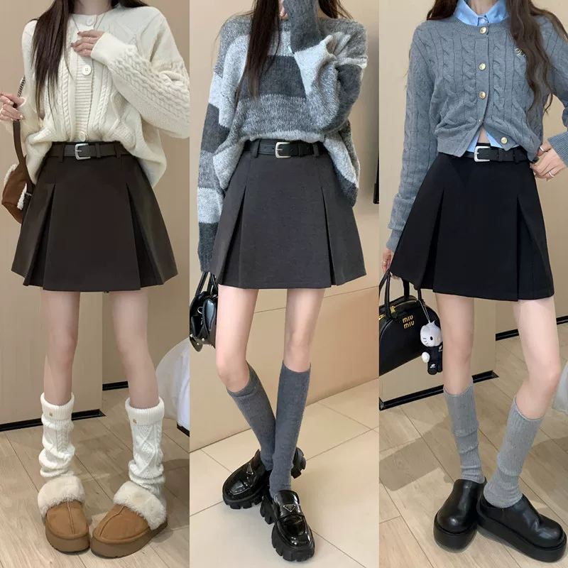 Váy len màu xám, thiết kế cỡ lớn mùa thu đông, váy ngắn dáng chữ A, váy xếp ly ôm hông màu cà phê cỡ nhỏ, cạp cao.