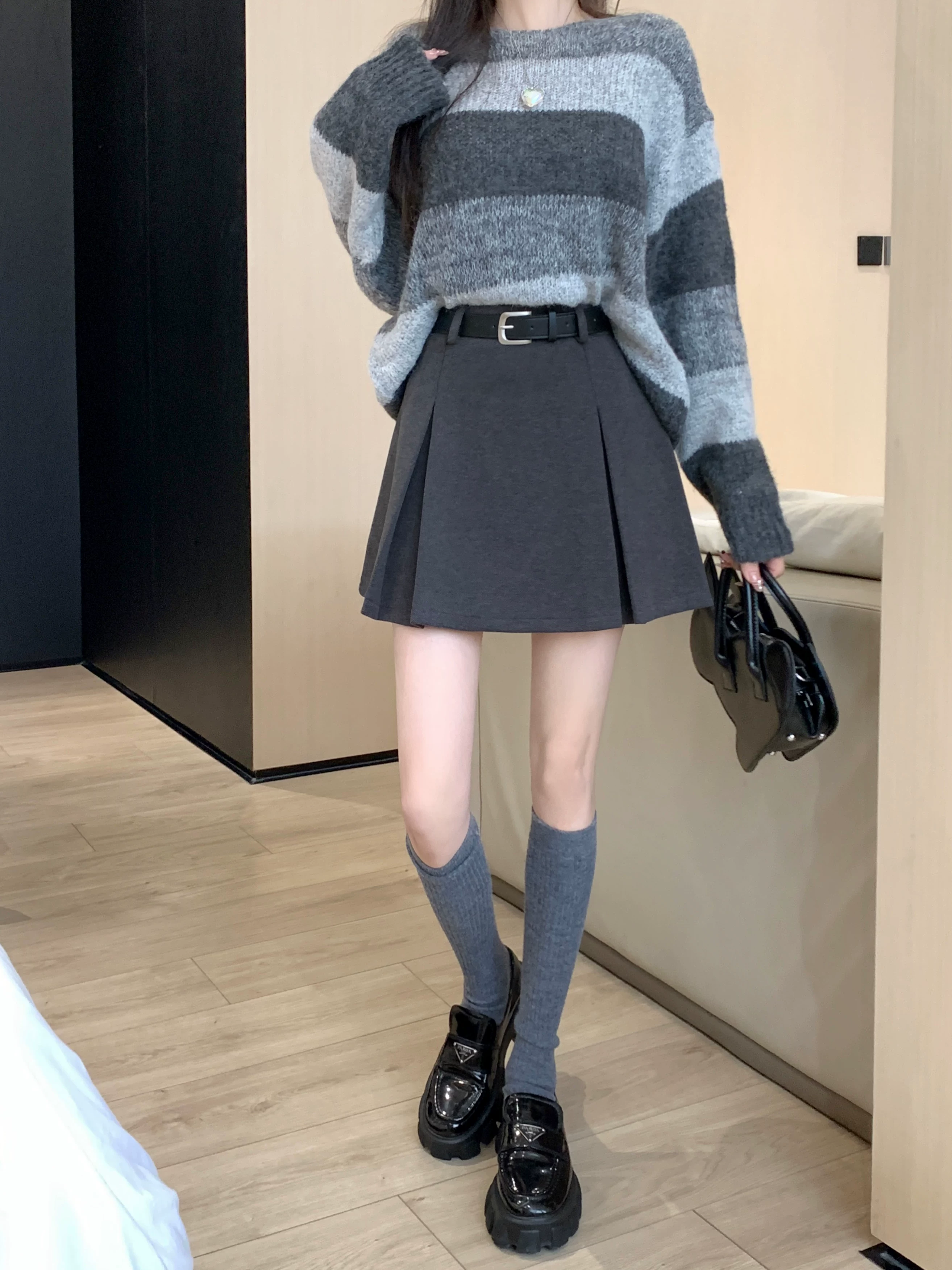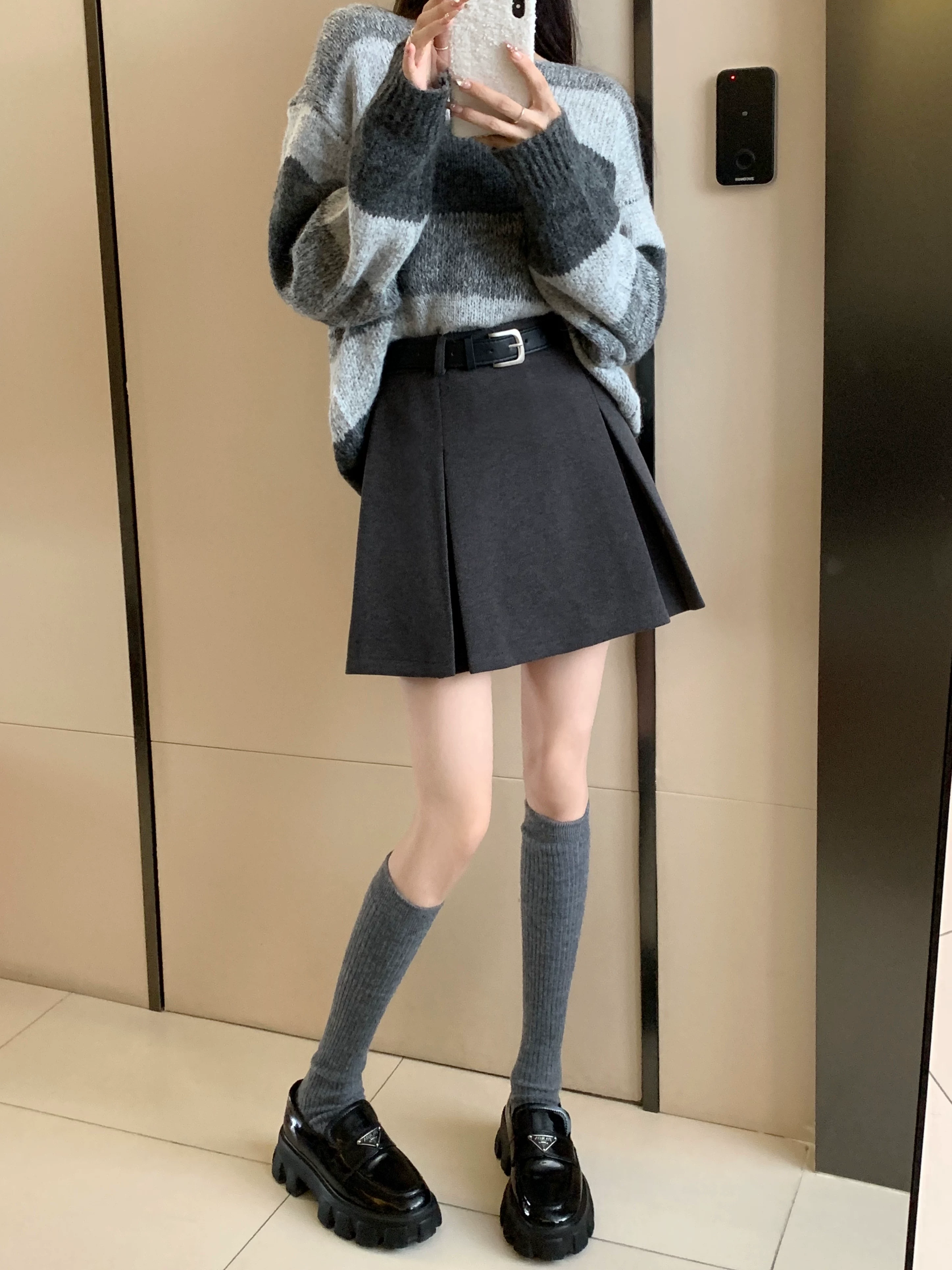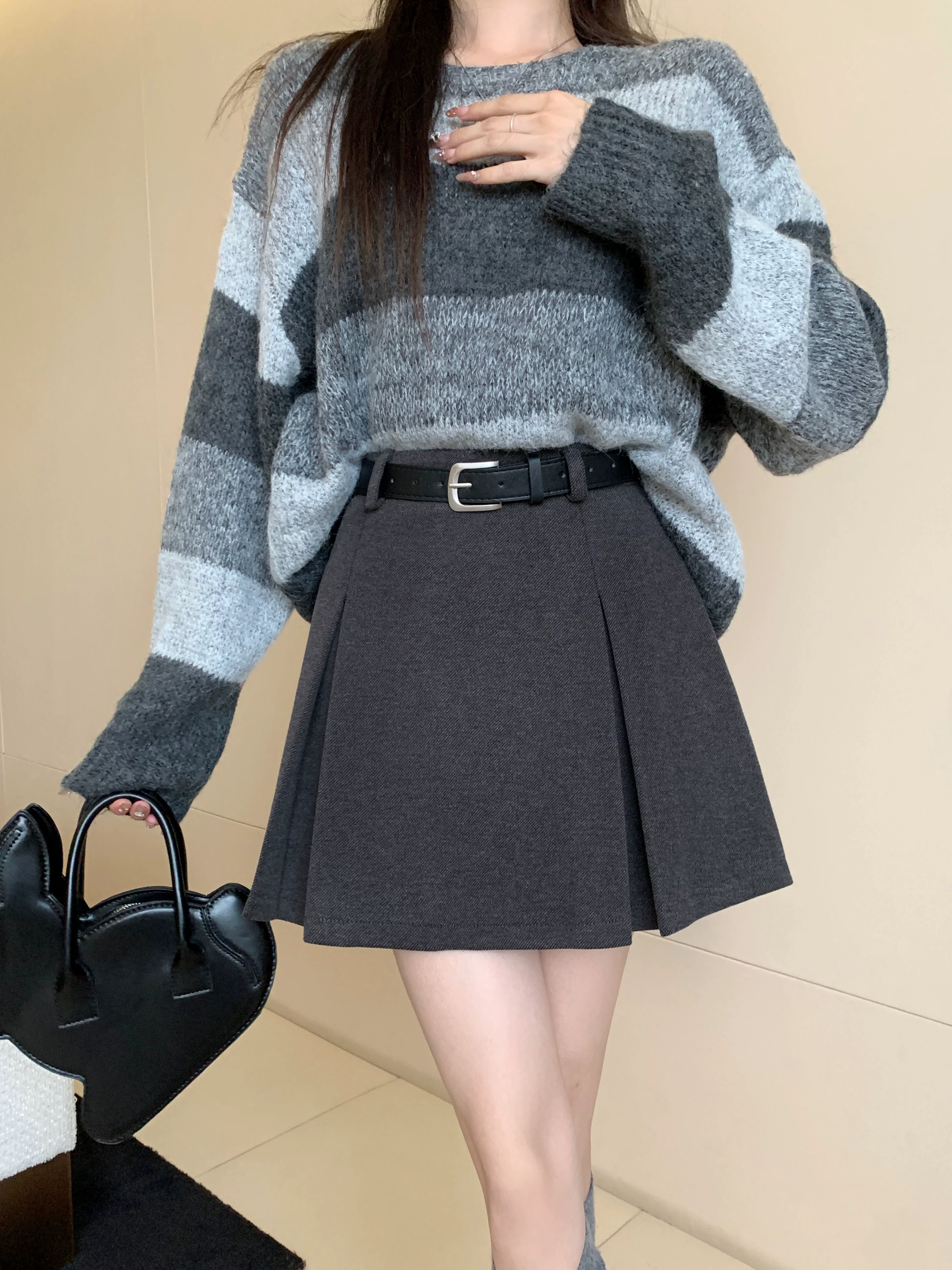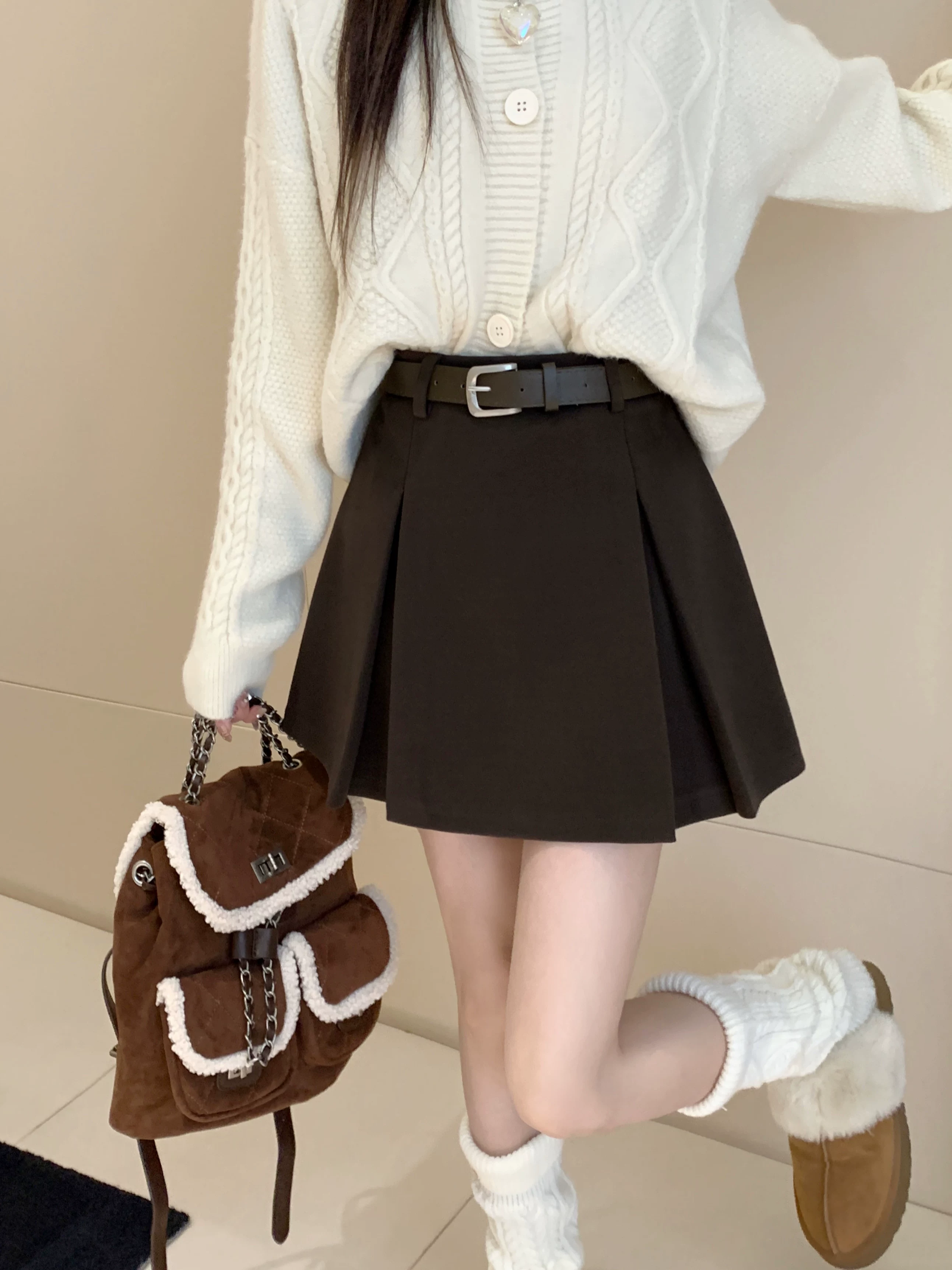 Váy len màu xám, thiết kế cỡ lớn mùa thu đông, váy ngắn dáng chữ A, váy xếp ly ôm hông màu cà phê cỡ nhỏ, cạp cao.