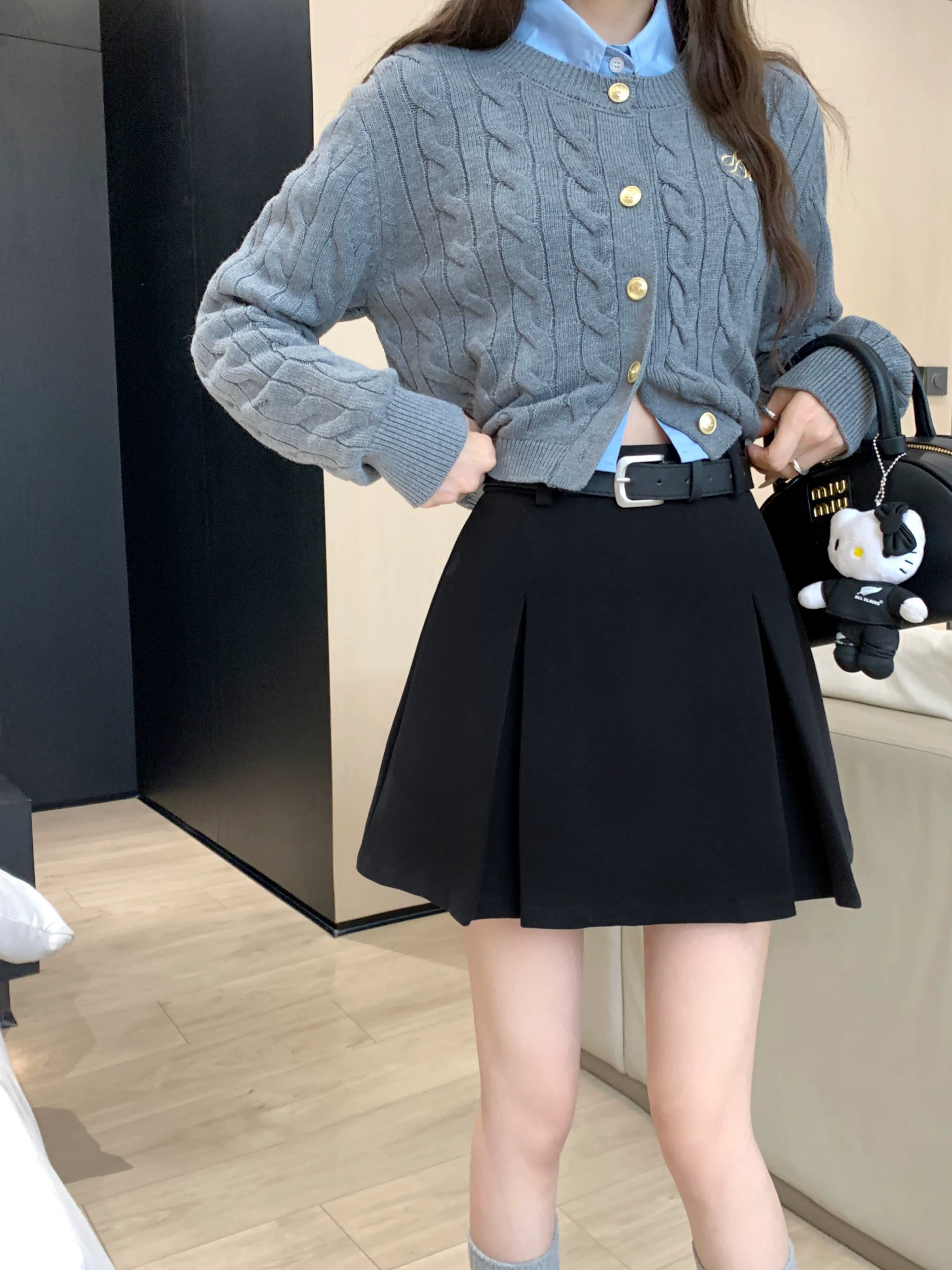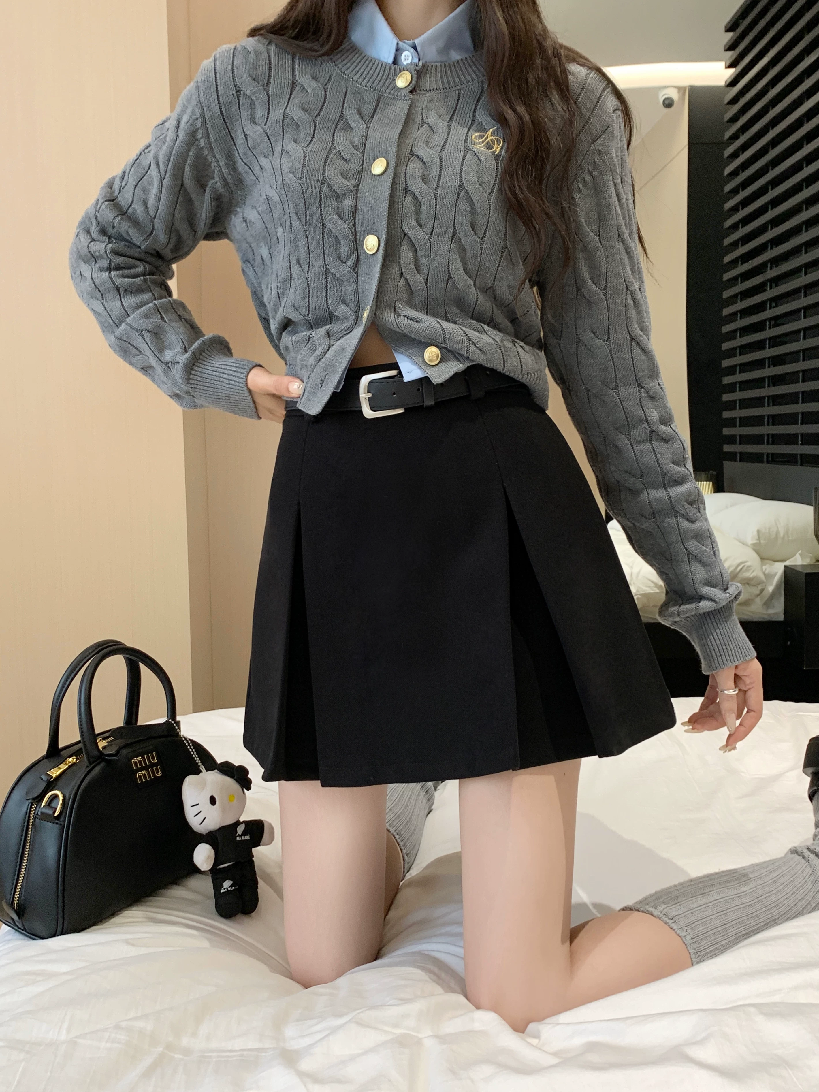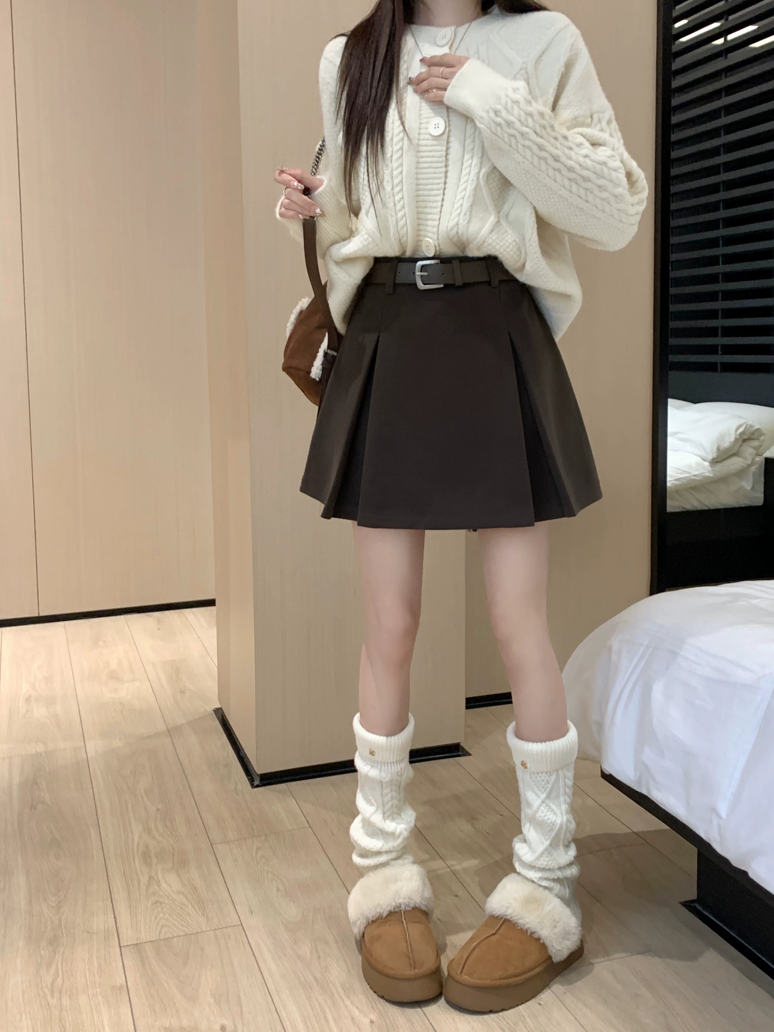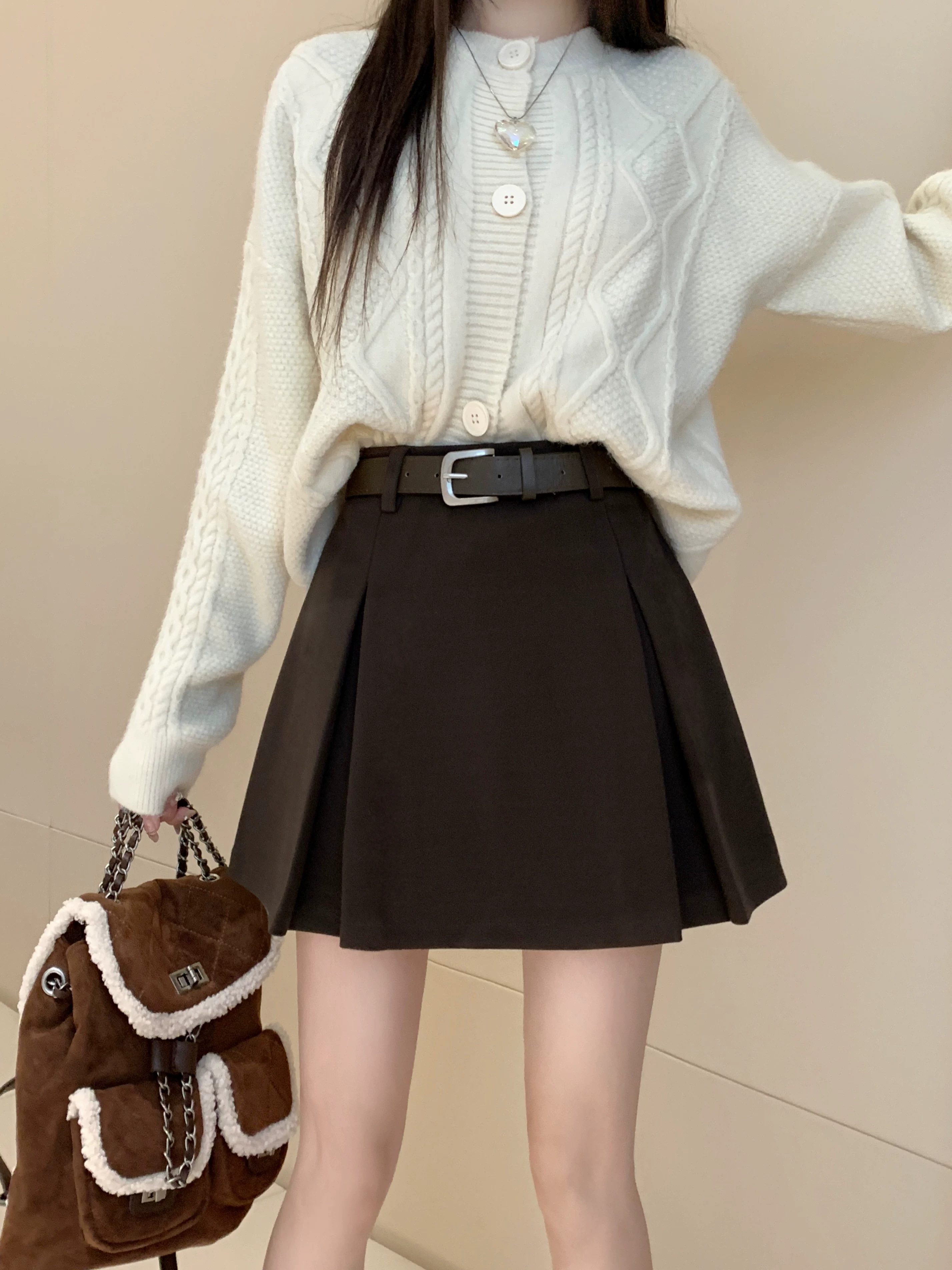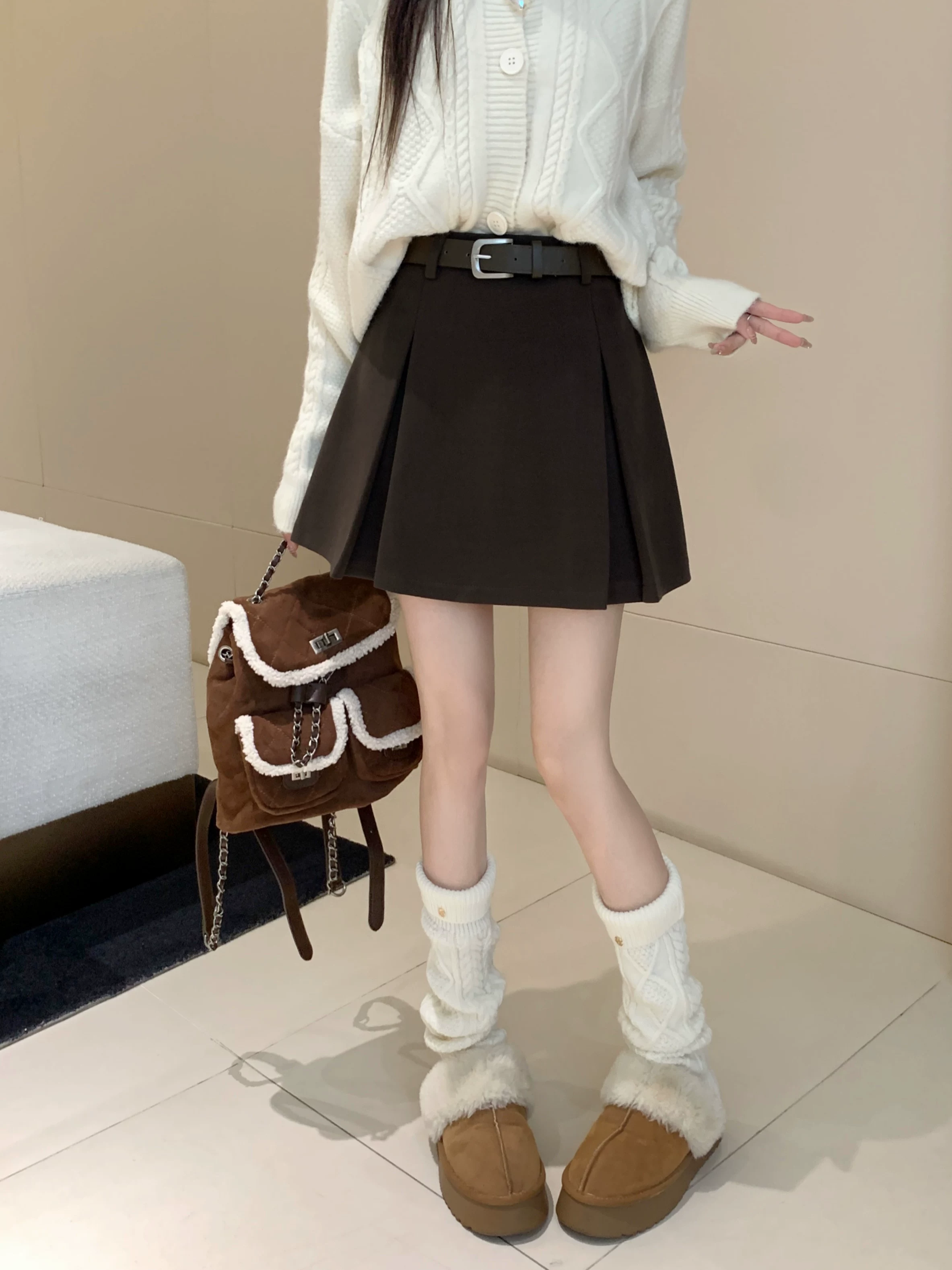 - Váy len màu xám, thiết kế cỡ lớn mùa thu đông, váy ngắn dáng chữ A, váy xếp ly ôm hông màu cà phê cỡ nhỏ, cạp cao.