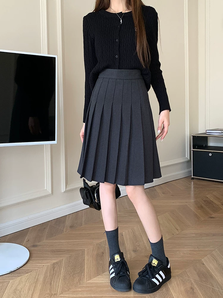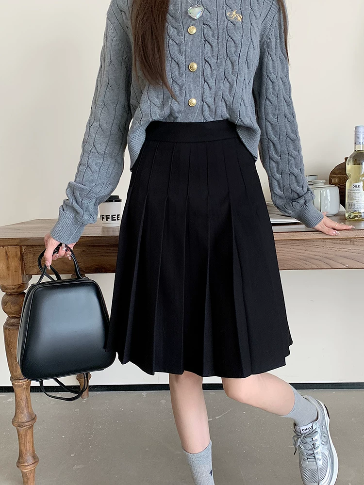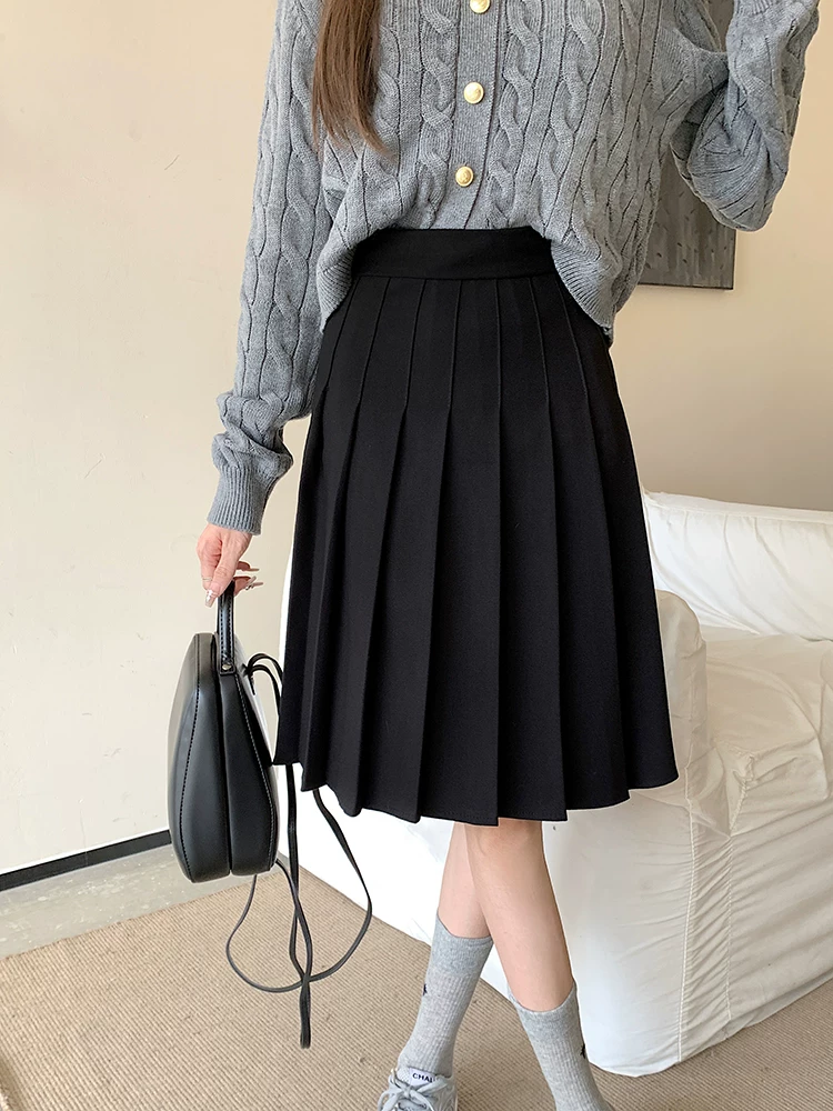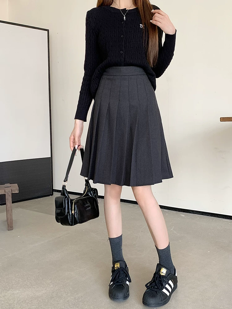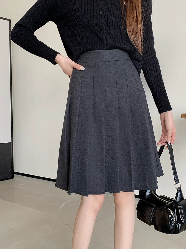 Váy len xếp ly cỡ lớn, váy dài trung bình dành cho nữ, mùa thu đông, lưng cao, phong cách preppy, váy chữ A, váy ngắn thon gọn.
