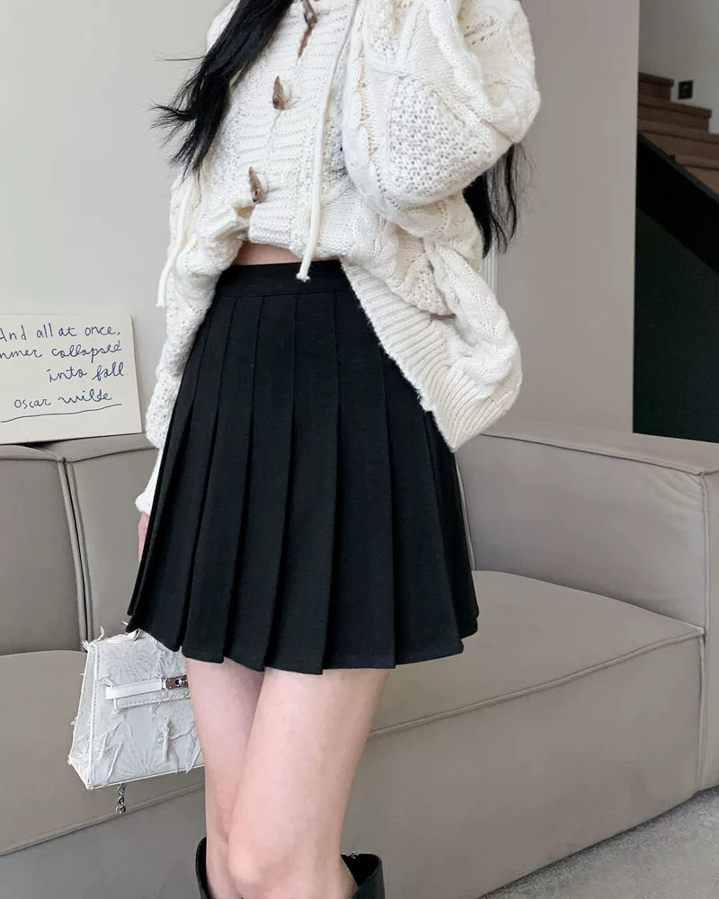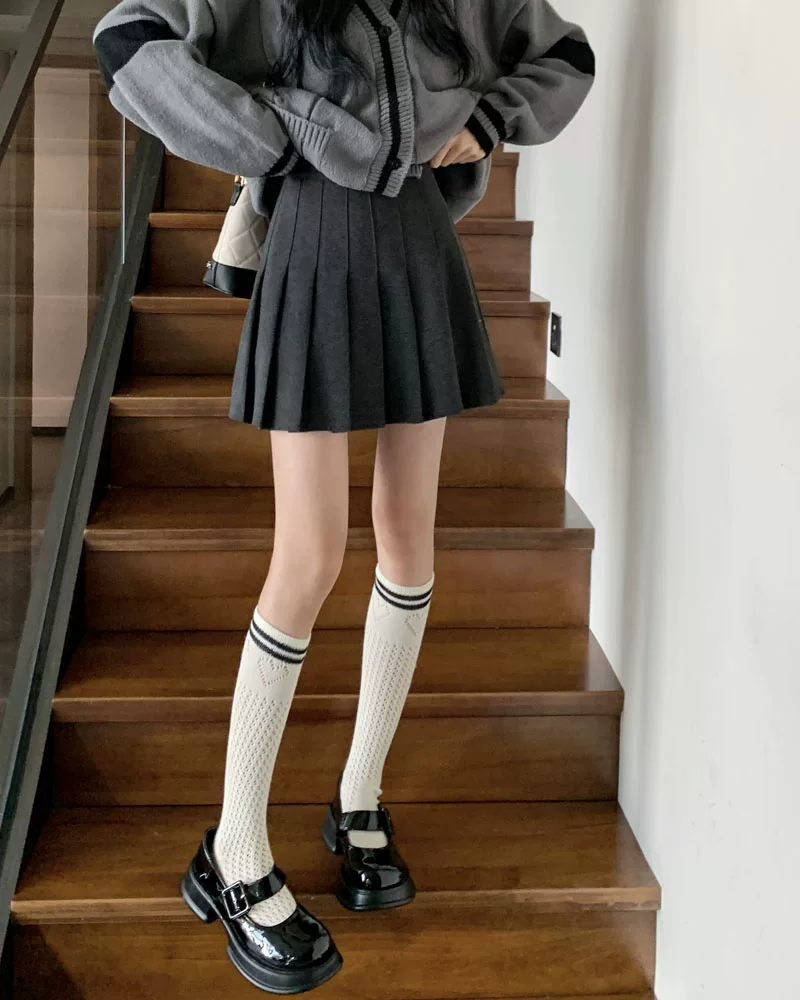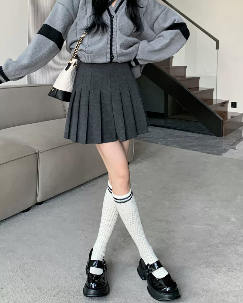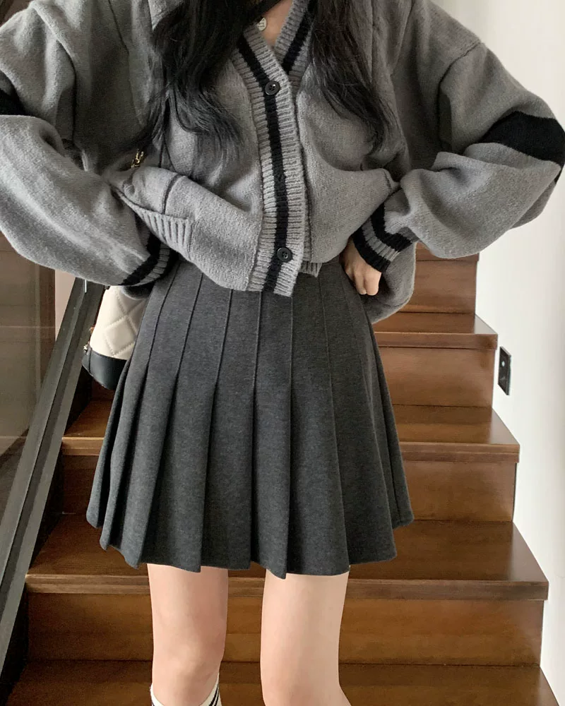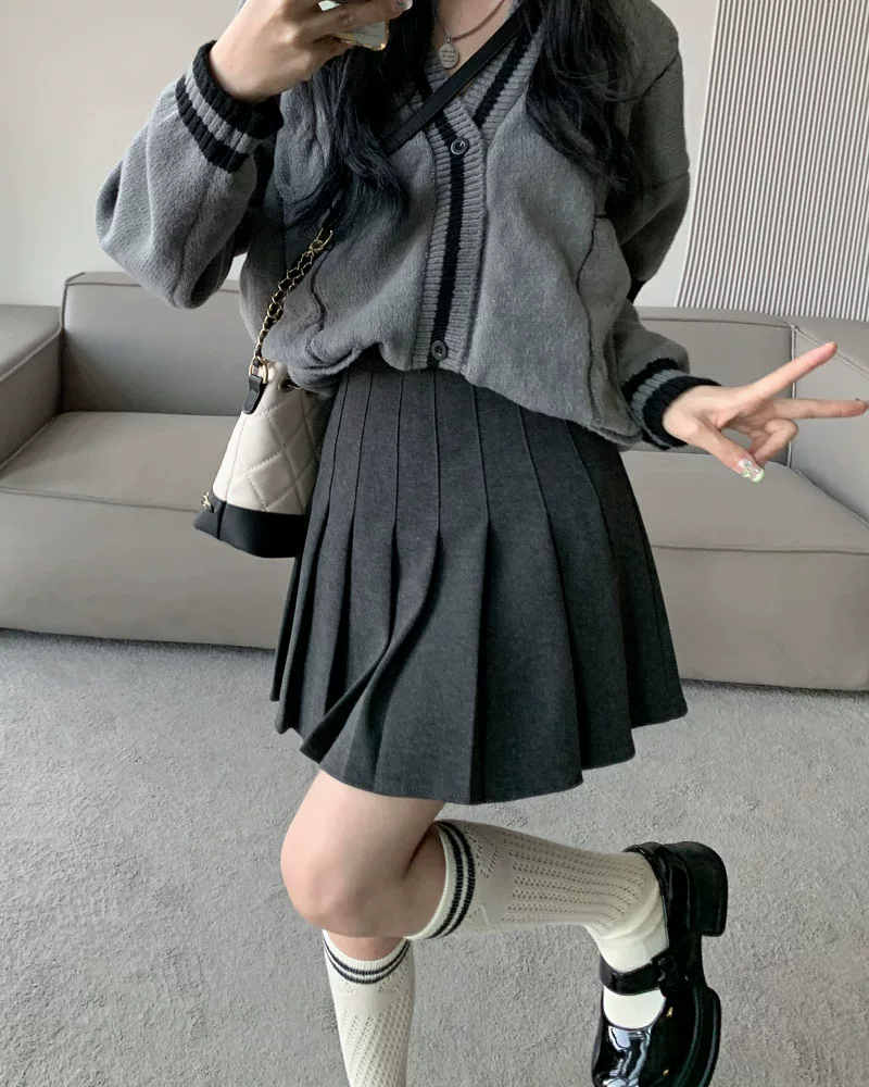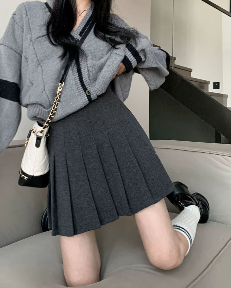 - Váy len xếp ly lưng cao màu xám, phong cách preppy thu đông dành cho nữ, phong cách Melard, váy chữ A thon gọn, váy ngắn.