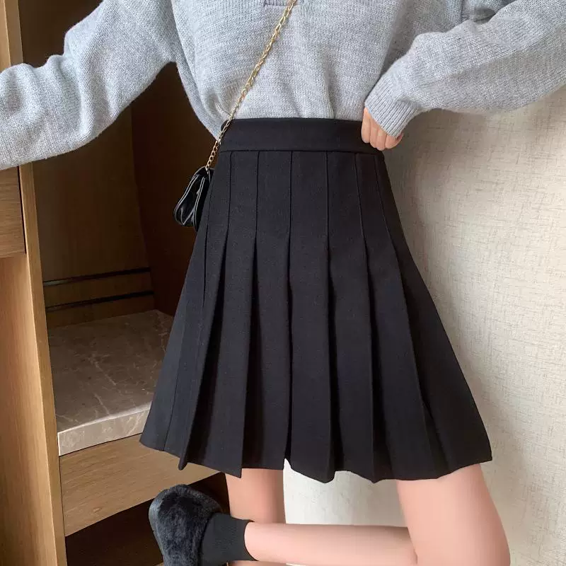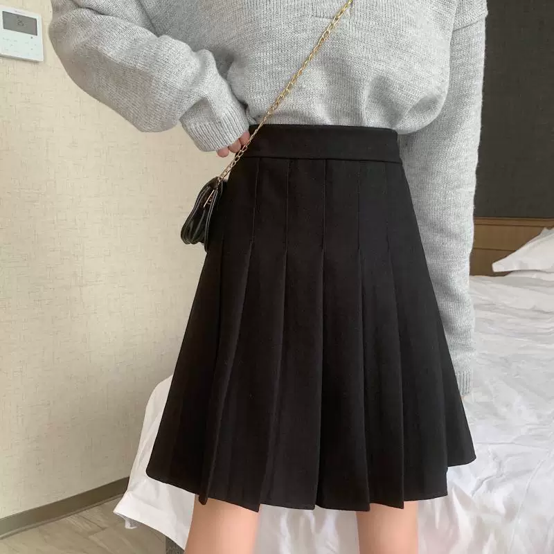 Váy len xếp ly màu đen cỡ lớn, dài vừa phải, mùa thu đông 2021 dành cho nữ, váy lưng cao dành cho phụ nữ mũm mĩm, váy chữ A thon gọn.