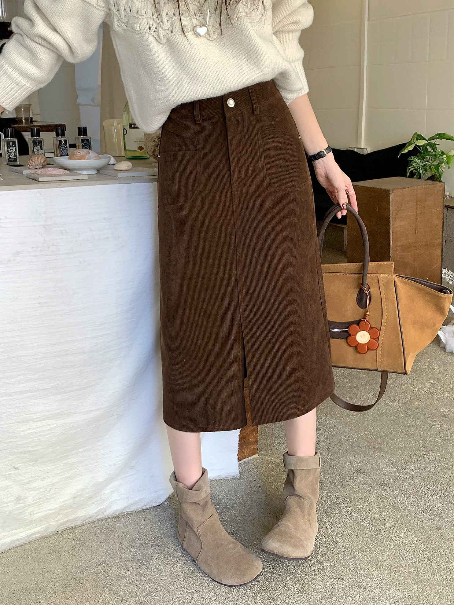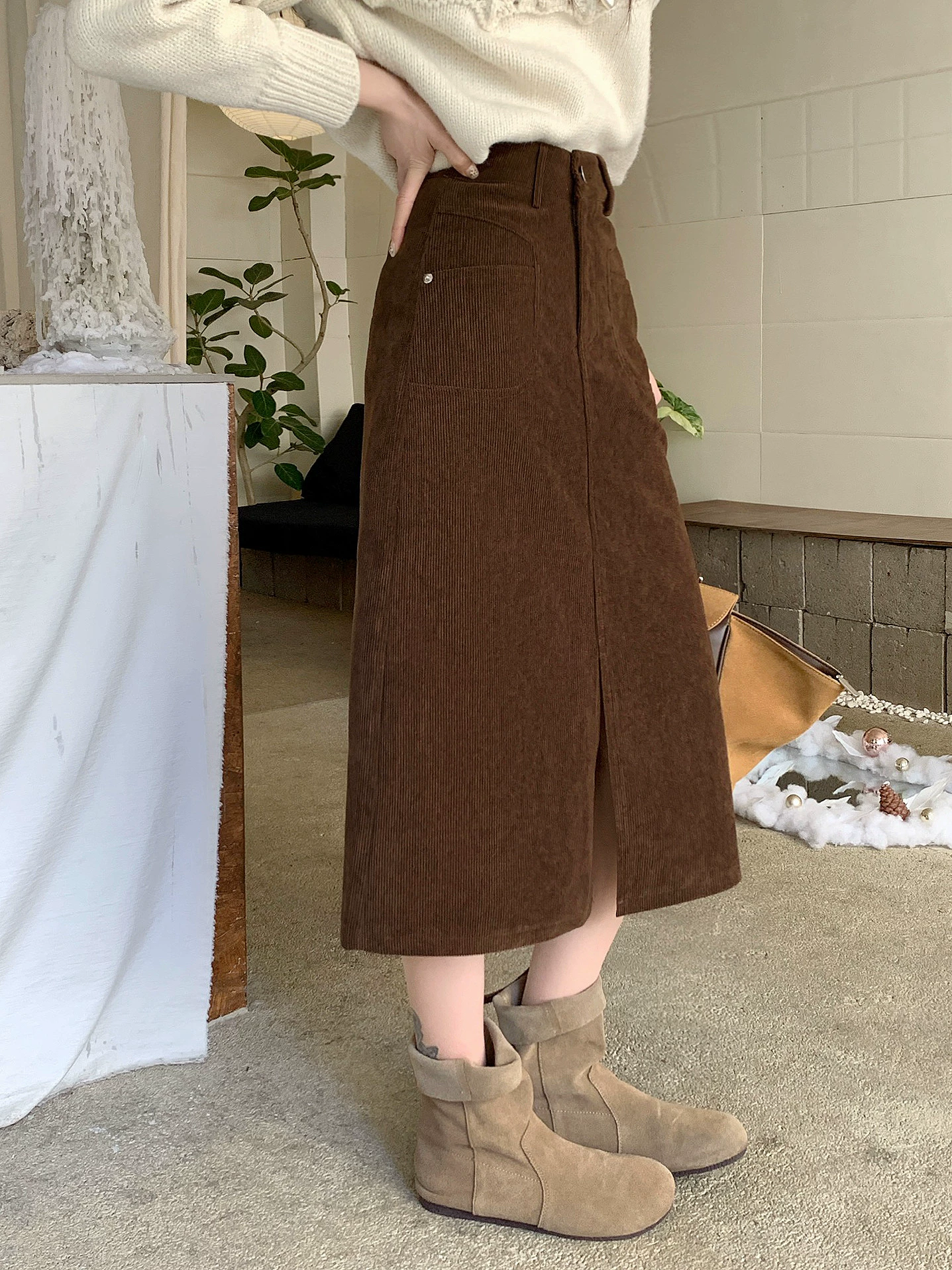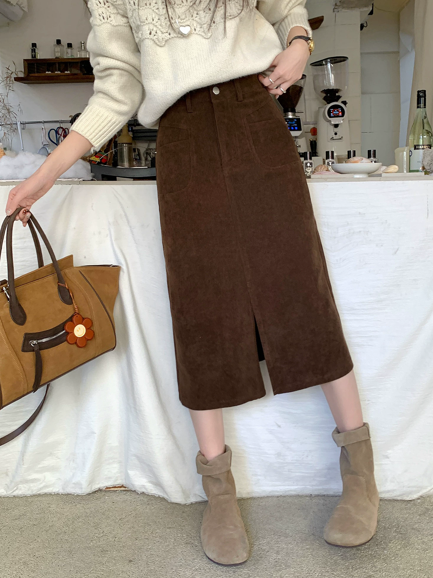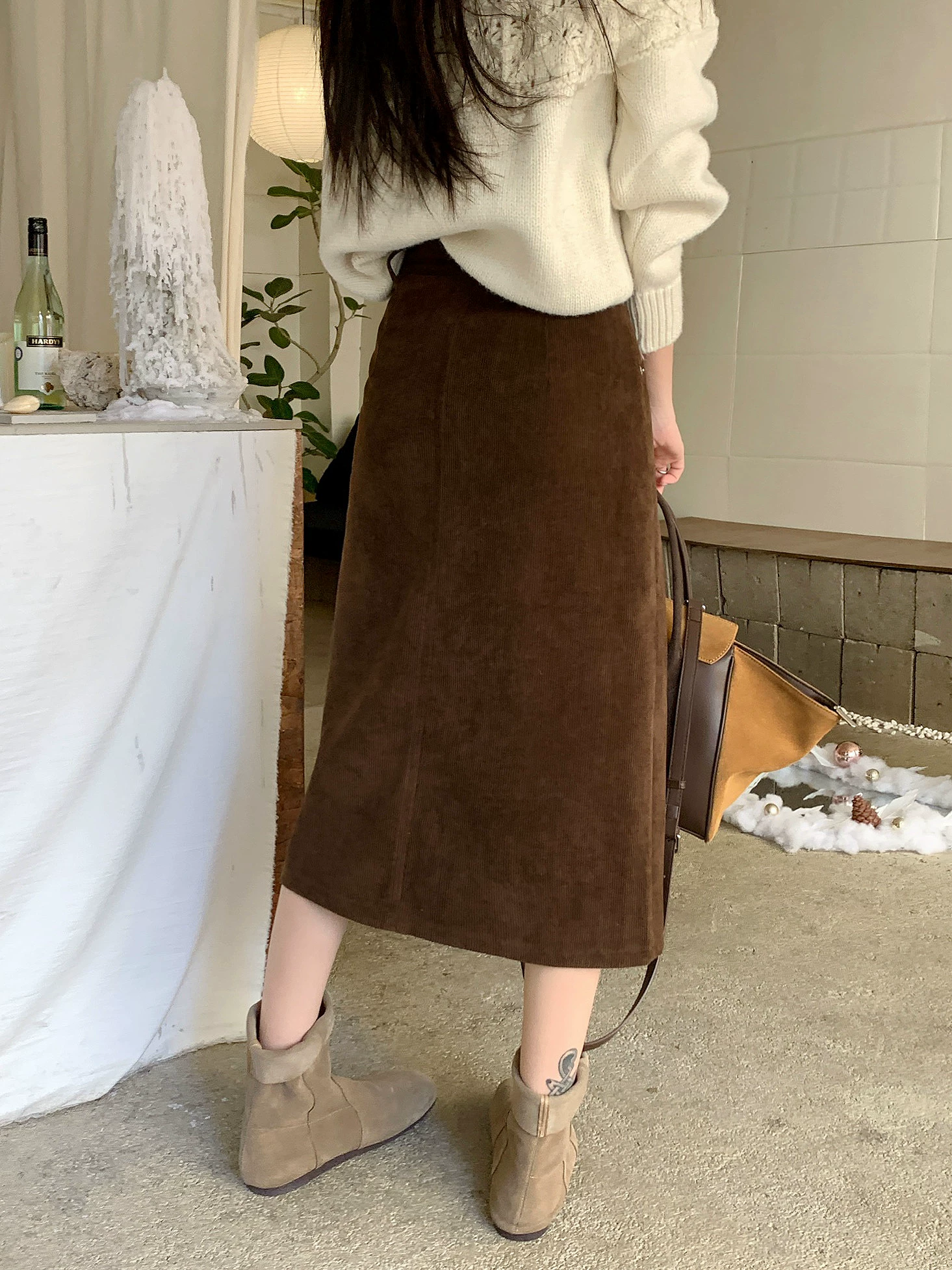 Váy màu cà phê cổ điển cỡ lớn dành cho nữ, váy chữ A cạp cao che hông mùa thu đông, váy midi ôm hông xẻ tà tôn dáng.