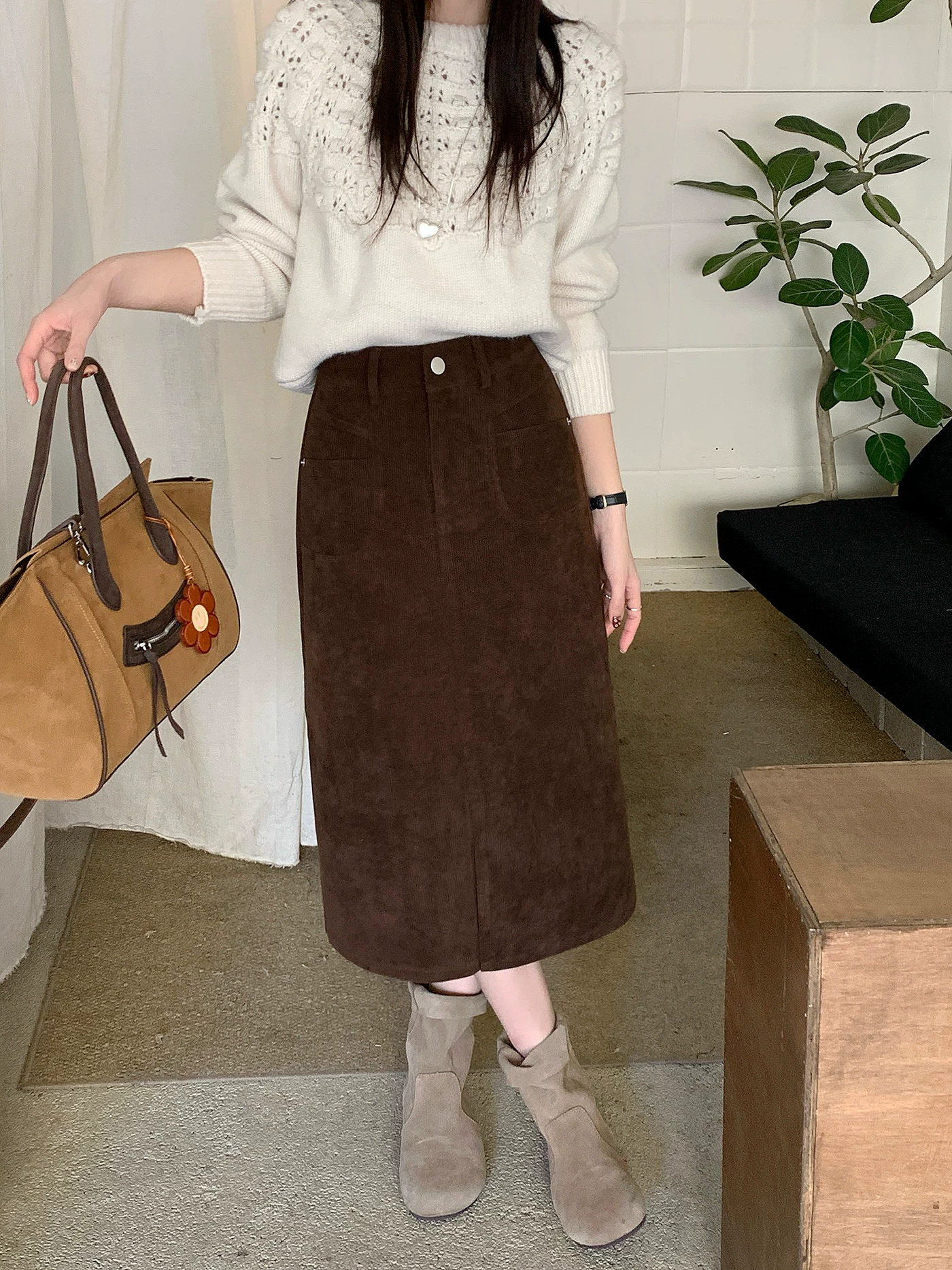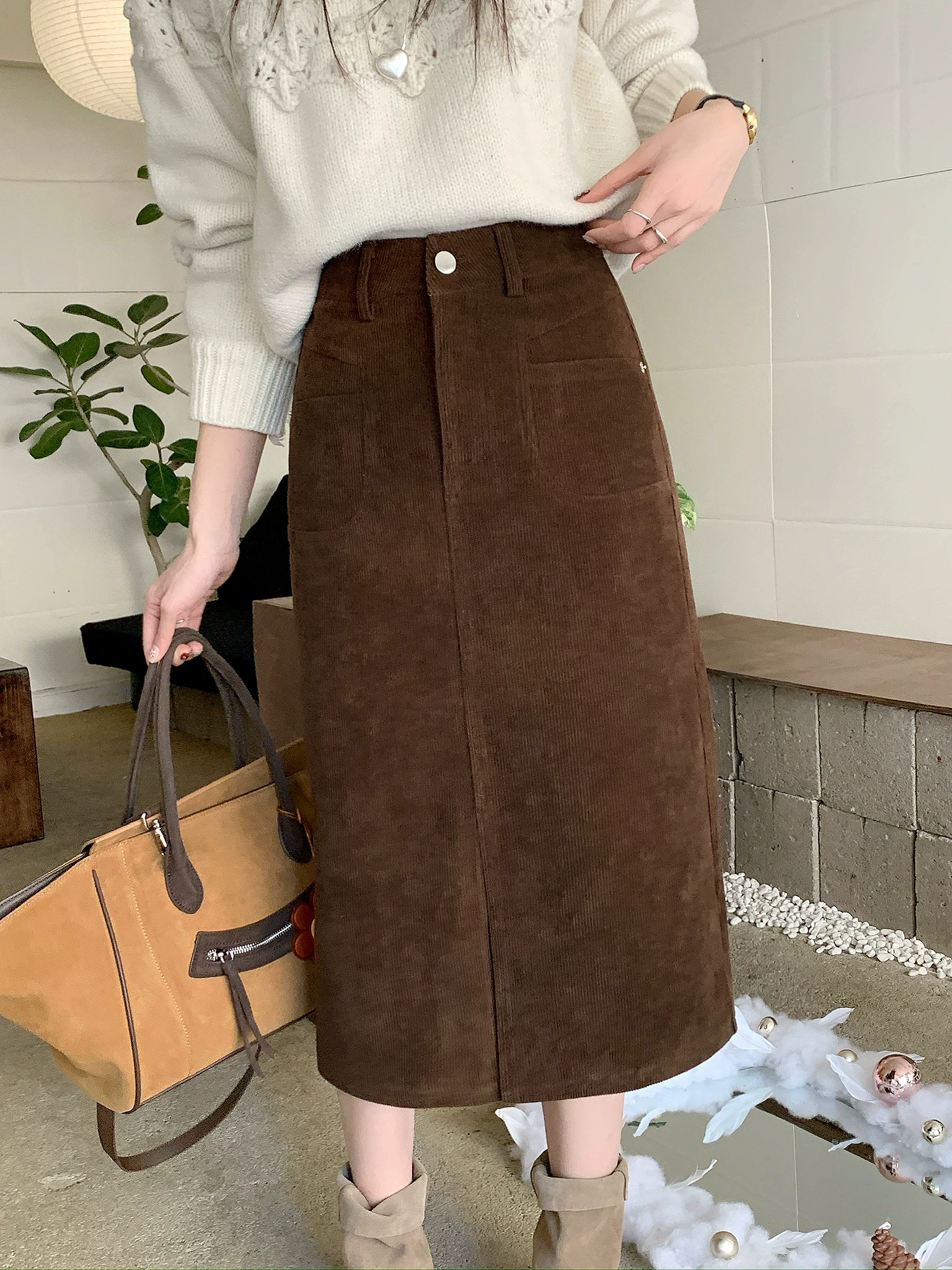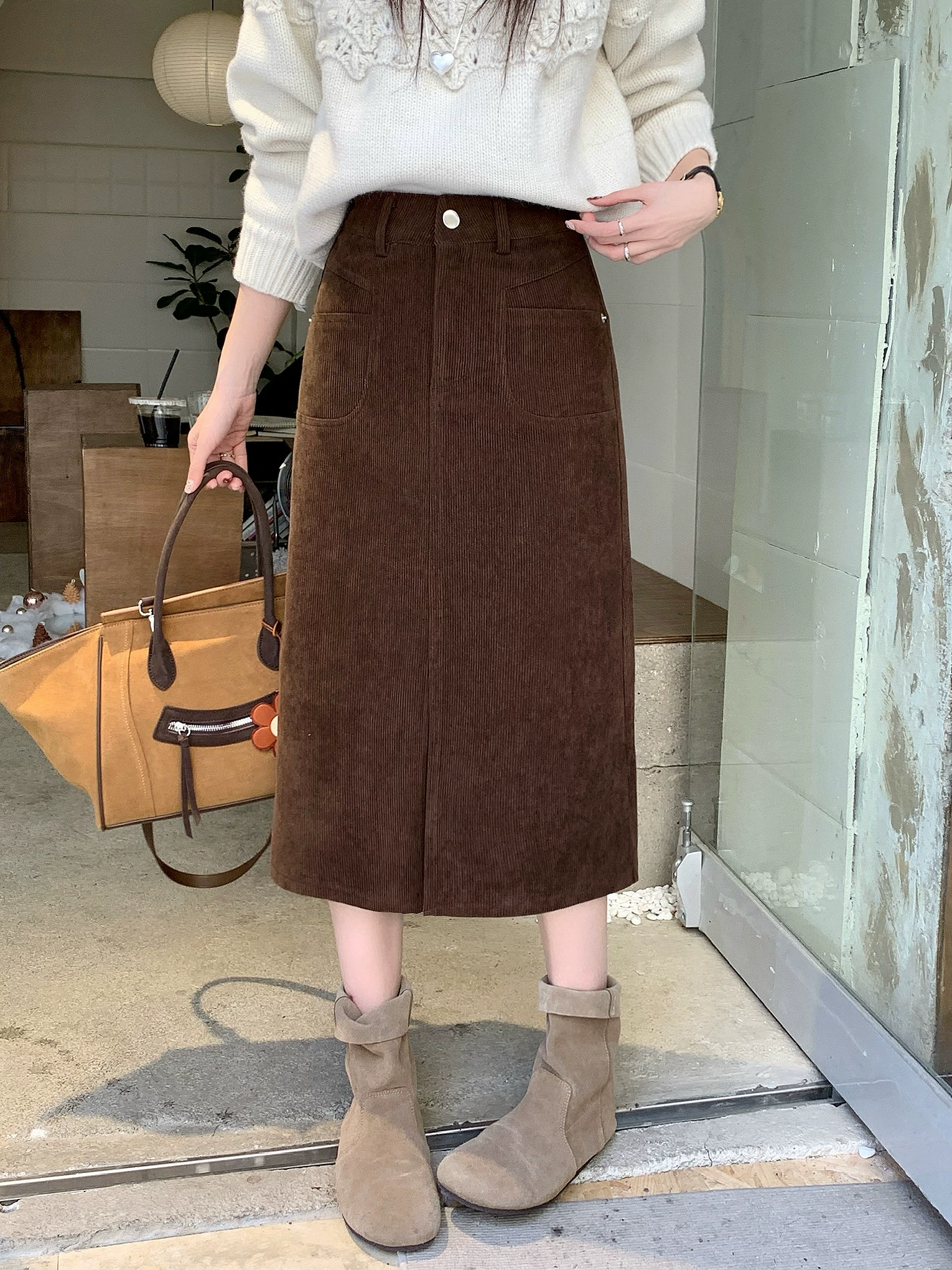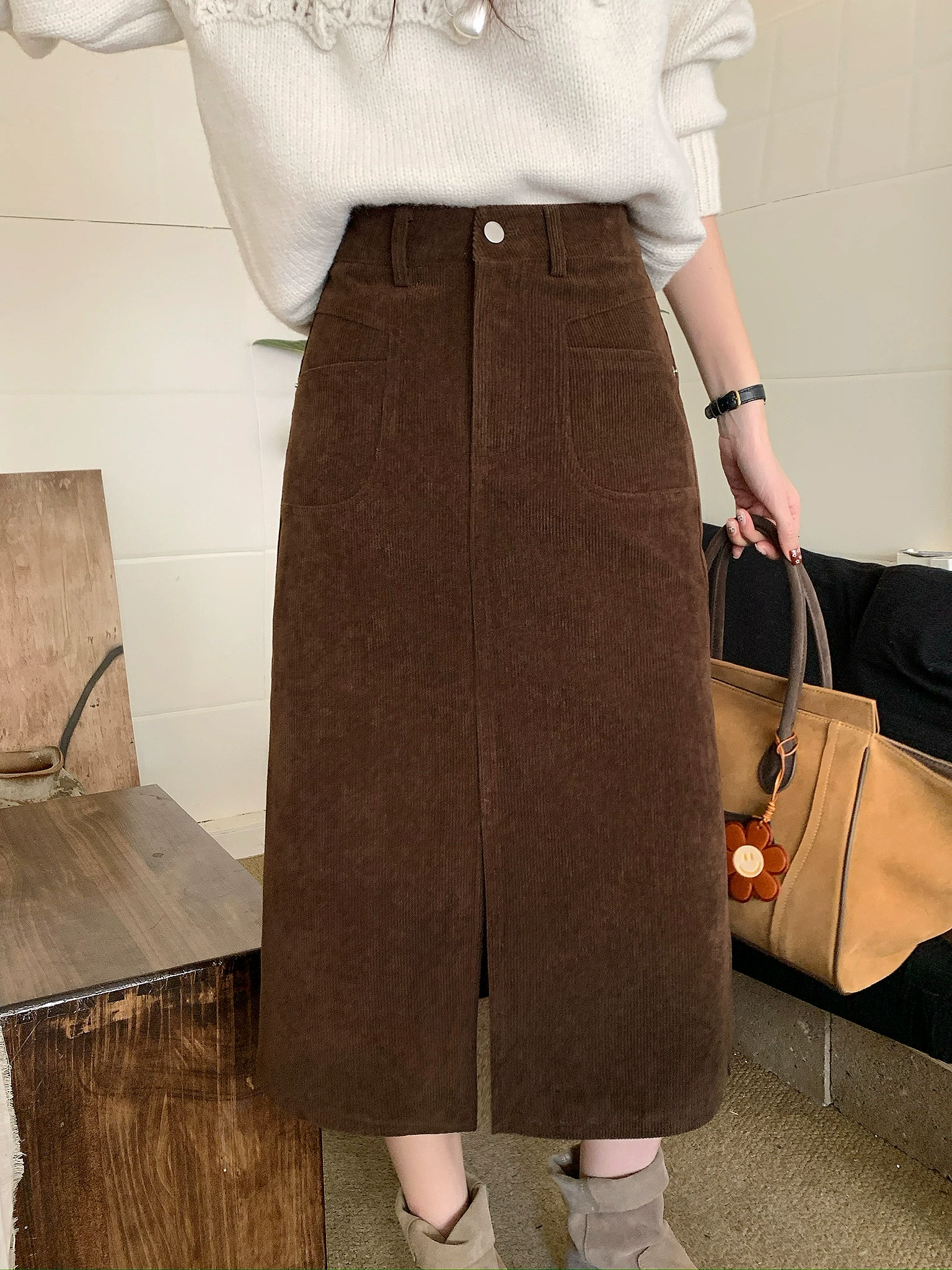Váy màu cà phê cổ điển cỡ lớn dành cho nữ, váy chữ A cạp cao che hông mùa thu đông, váy midi ôm hông xẻ tà tôn dáng.
