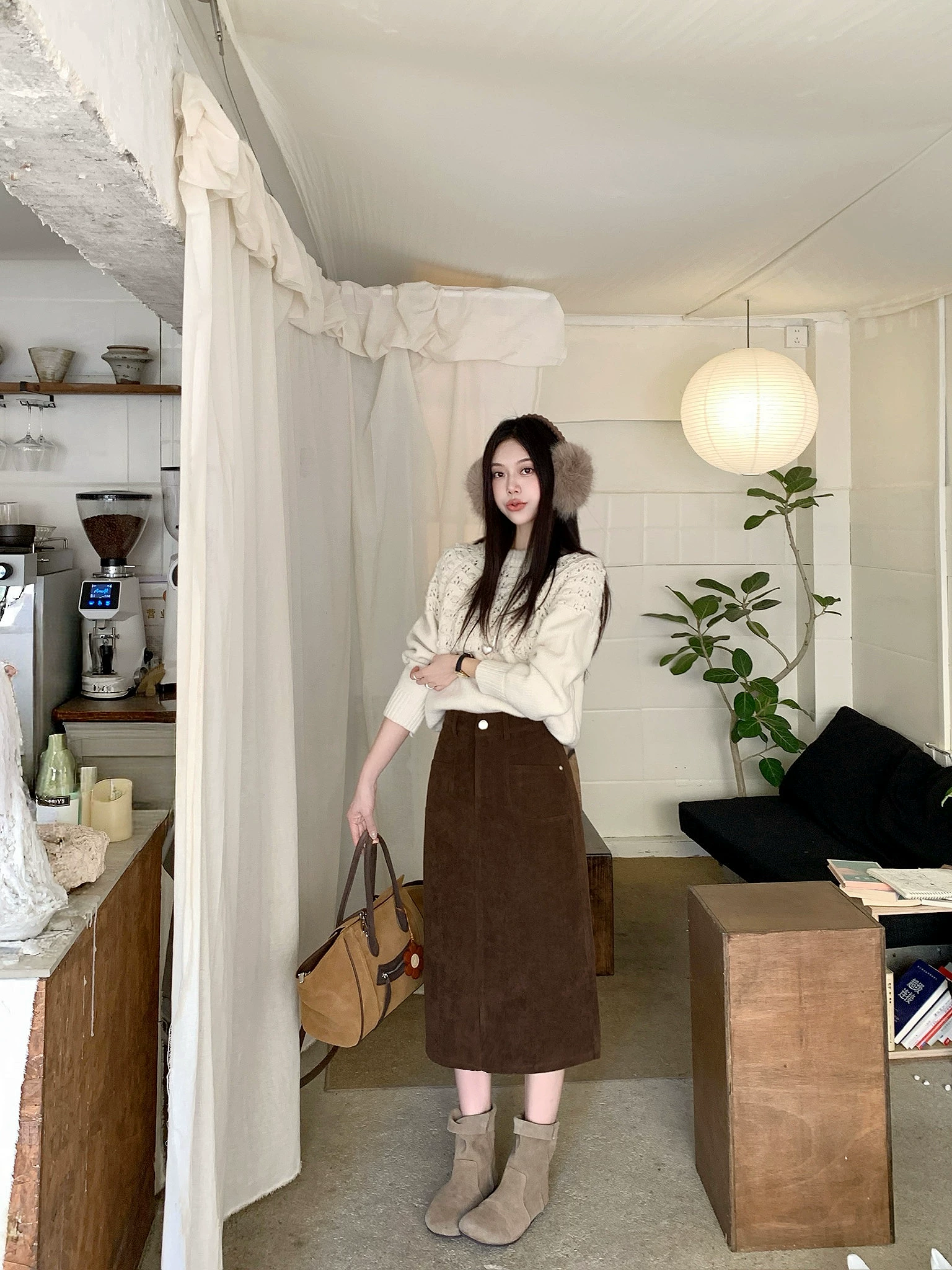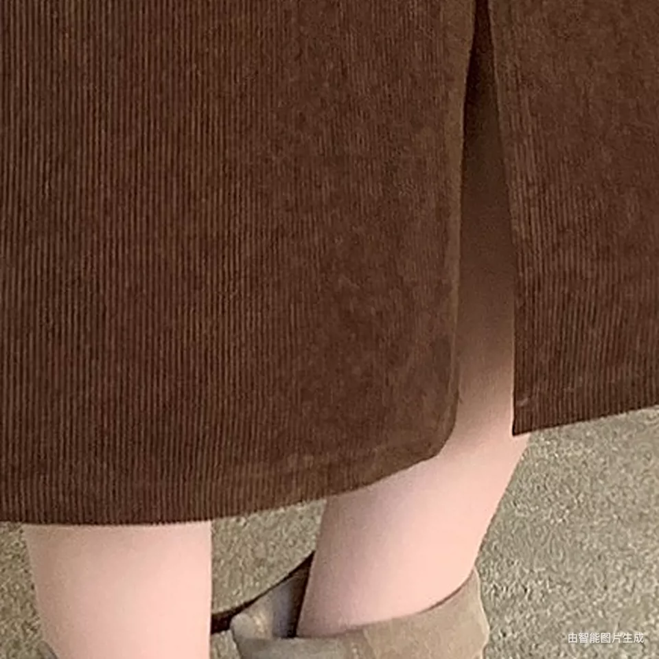 - Váy màu cà phê cổ điển cỡ lớn dành cho nữ, váy chữ A cạp cao che hông mùa thu đông, váy midi ôm hông xẻ tà tôn dáng.