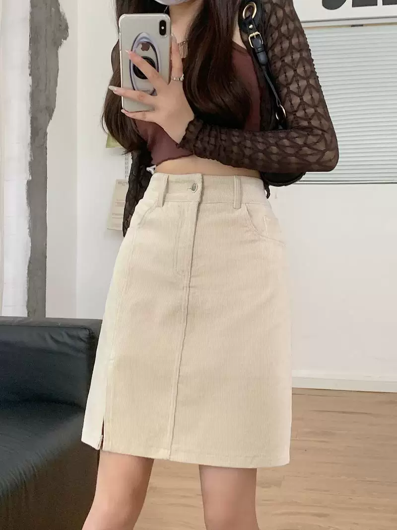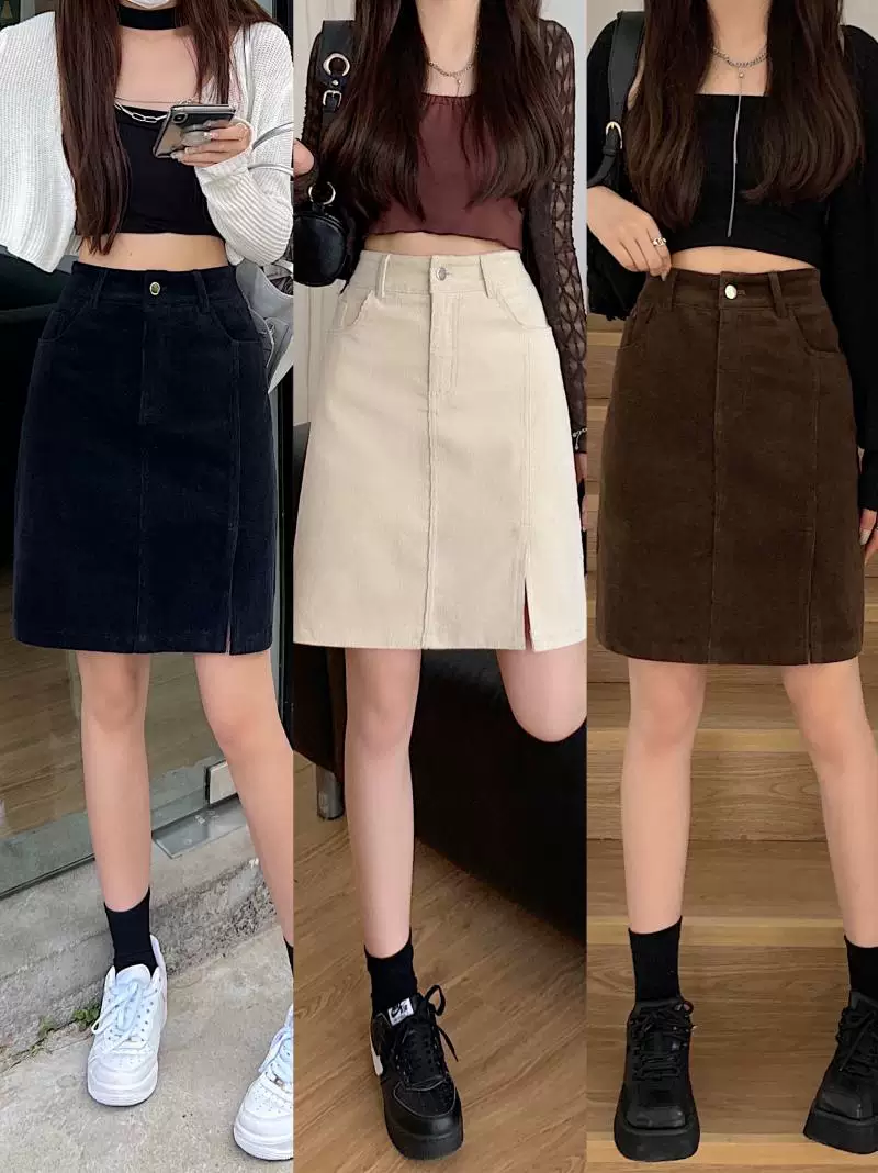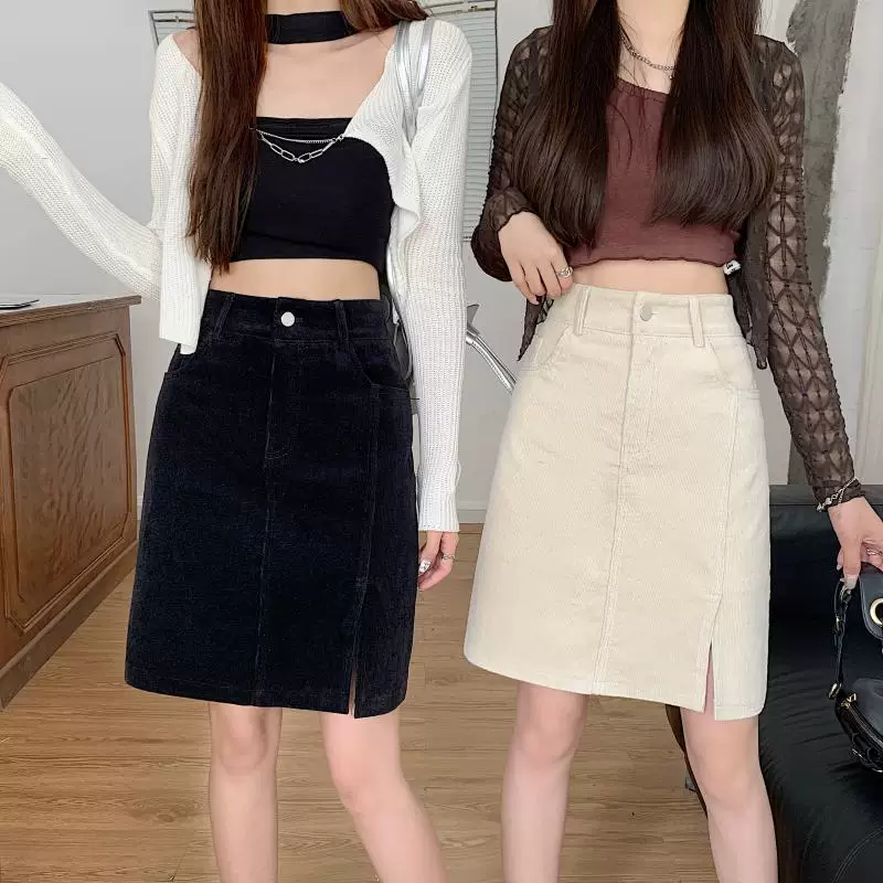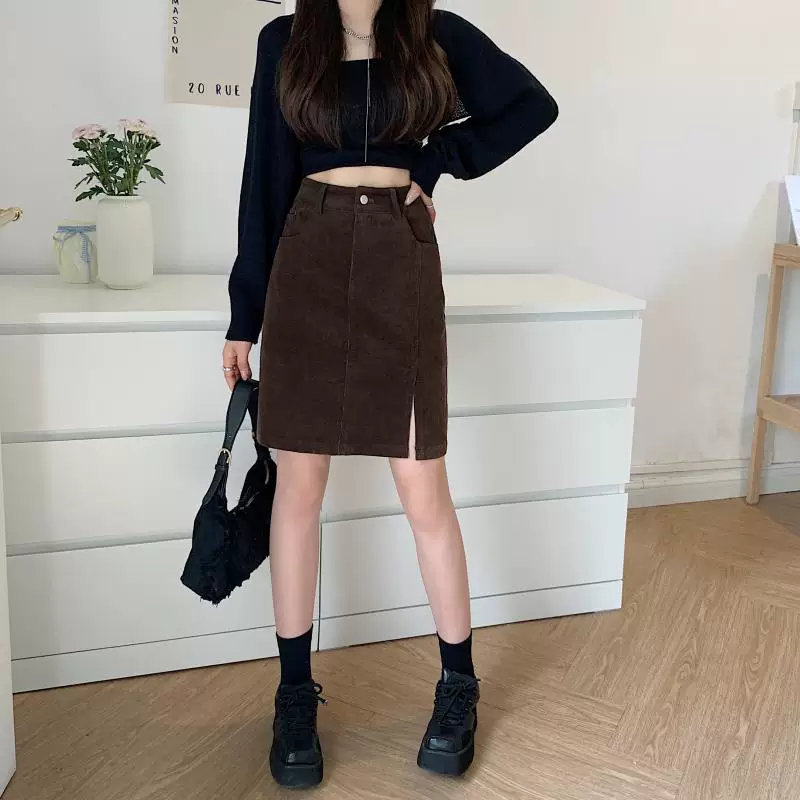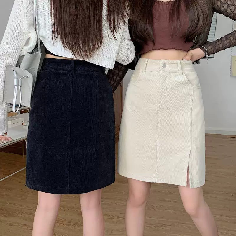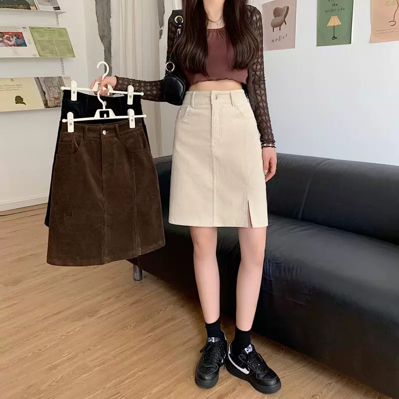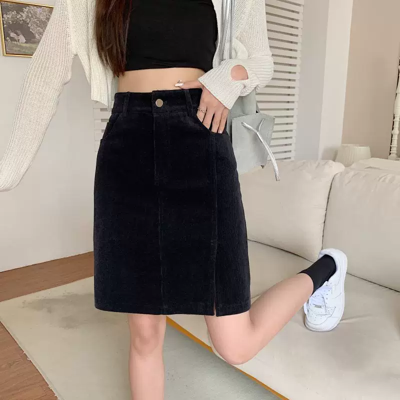- Váy midi chất liệu corduroy size lớn dành cho nữ, váy ngắn dáng chữ A xẻ tà cao eo mùa thu đông, váy bút chì che bụng ôm hông.