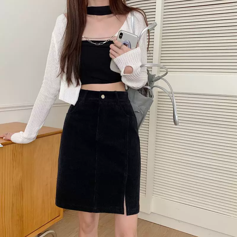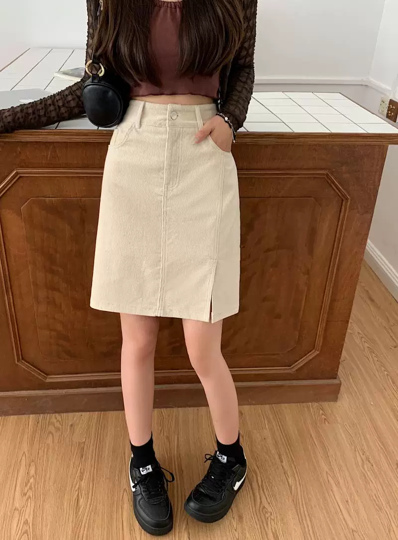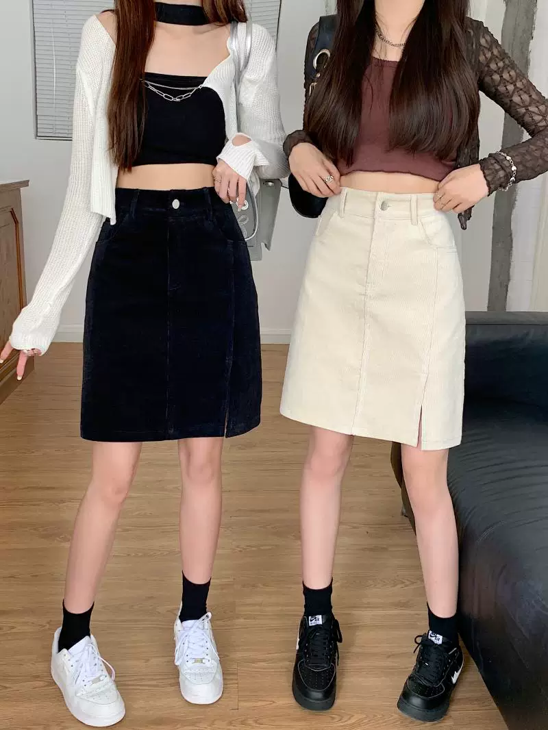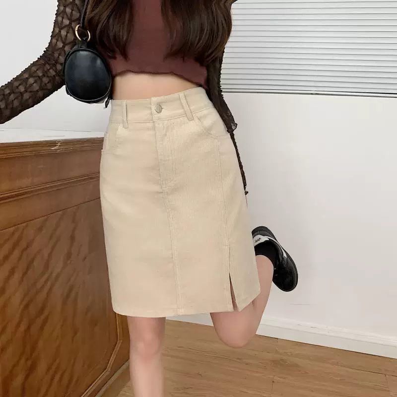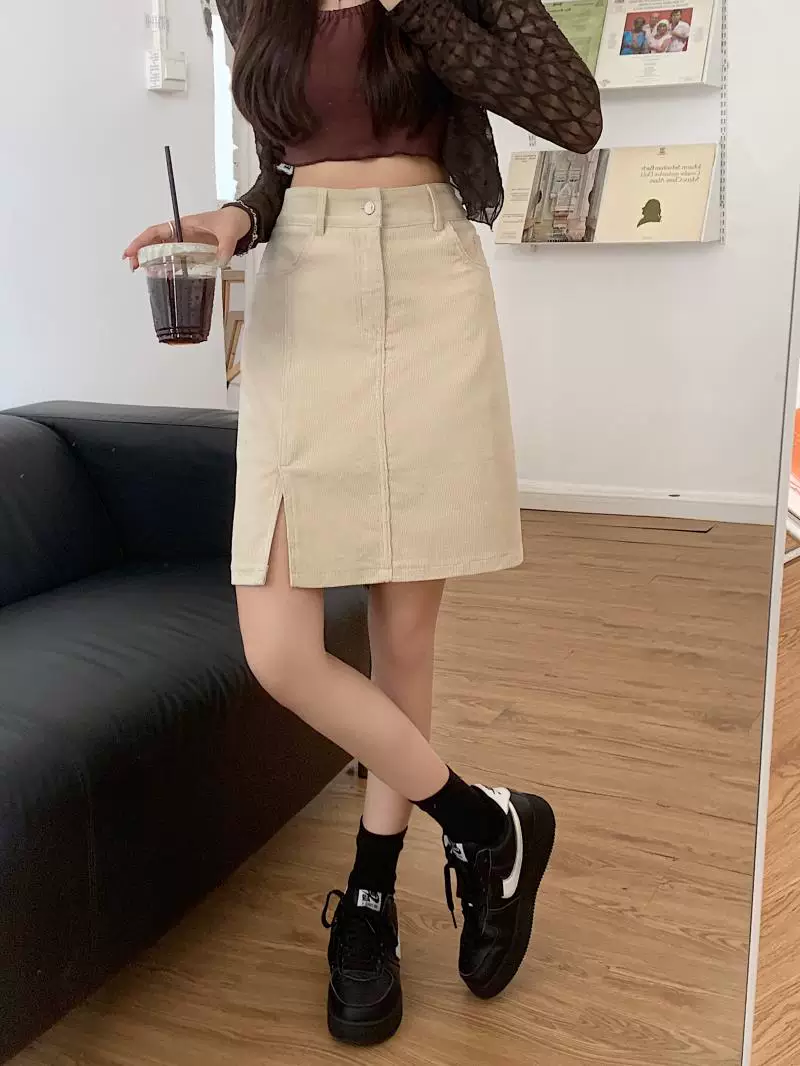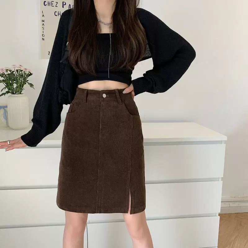 - Váy midi chất liệu corduroy size lớn dành cho nữ, váy ngắn dáng chữ A xẻ tà cao eo mùa thu đông, váy bút chì che bụng ôm hông.