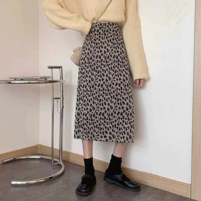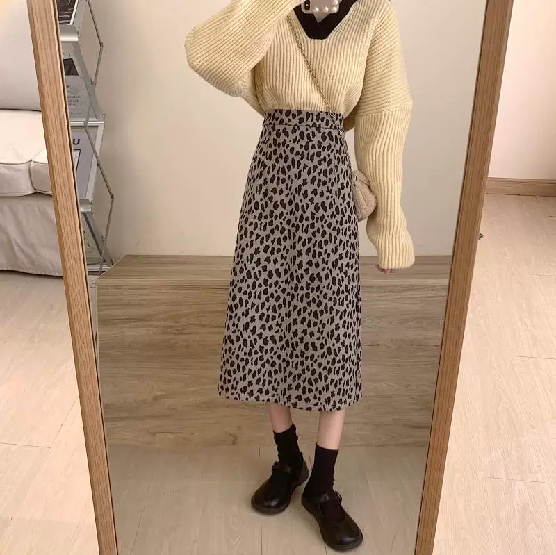 Váy midi dáng chữ A xẻ tà họa tiết da báo cổ điển cỡ lớn dành cho nữ, mùa thu đông, tôn dáng, che hông, chất liệu mềm mại.