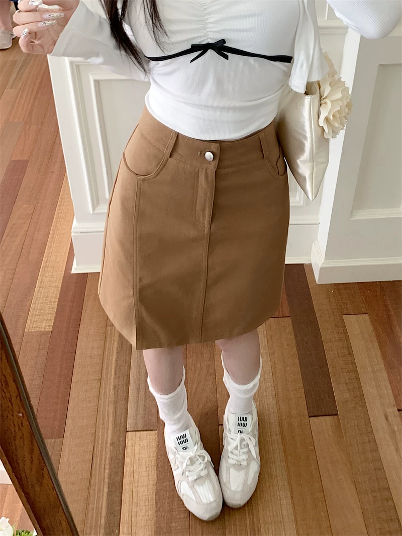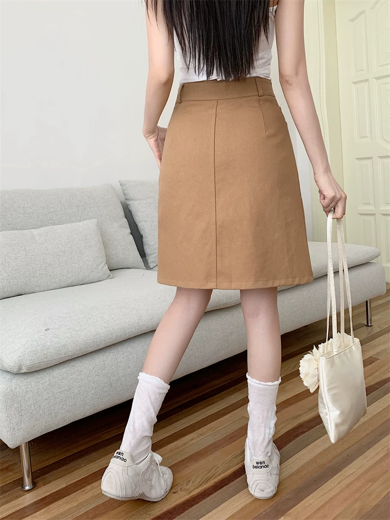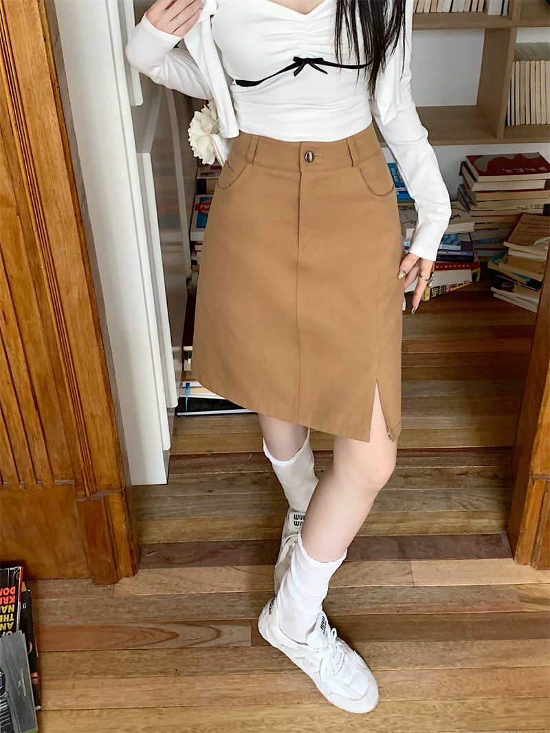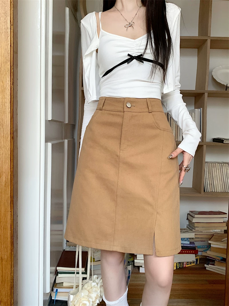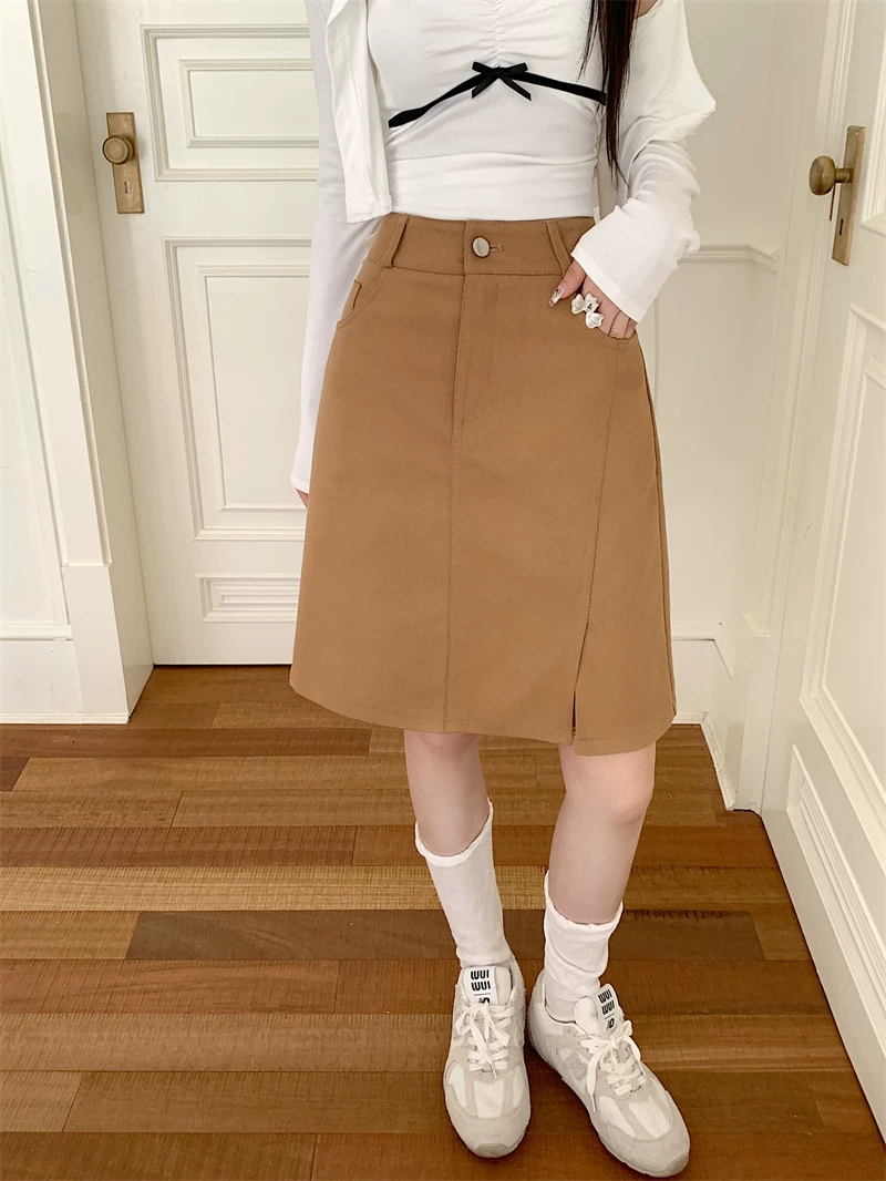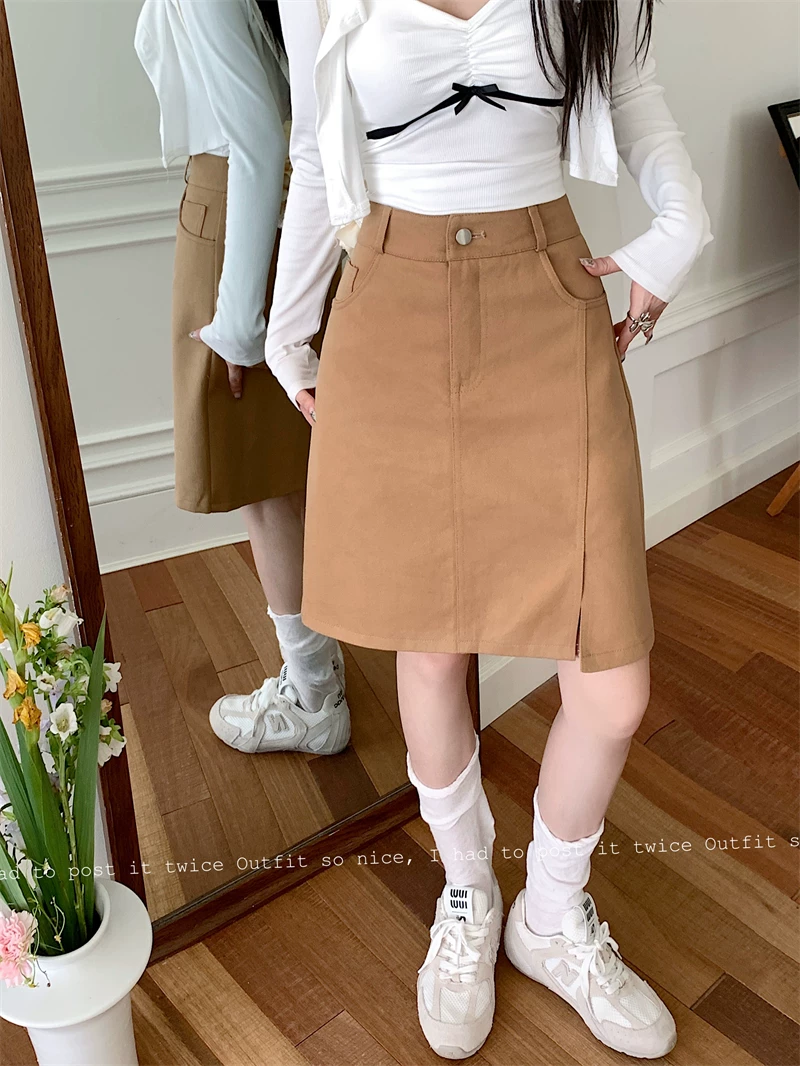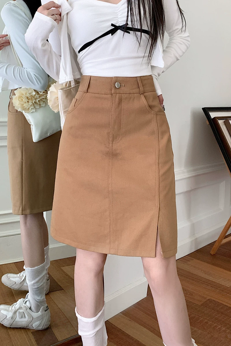 Váy midi denim kaki size lớn cho nữ, váy ngắn chữ A cạp cao mùa hè, váy bút chì dài vừa phải có đường xẻ tôn dáng.