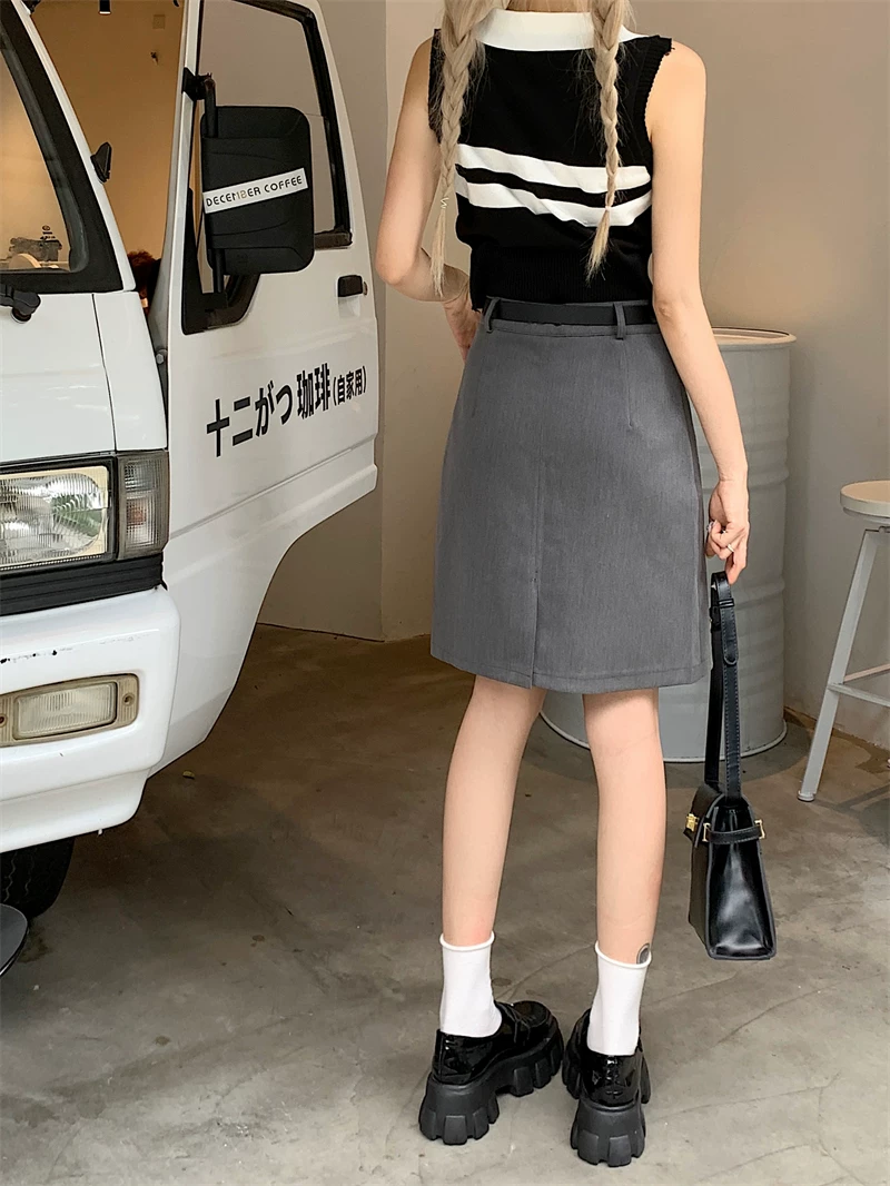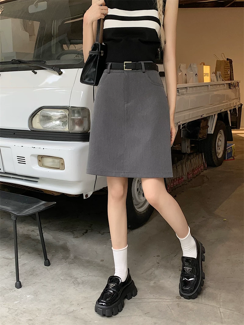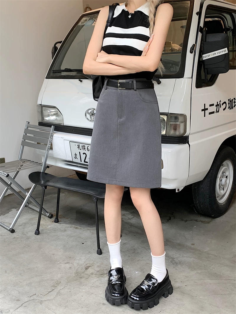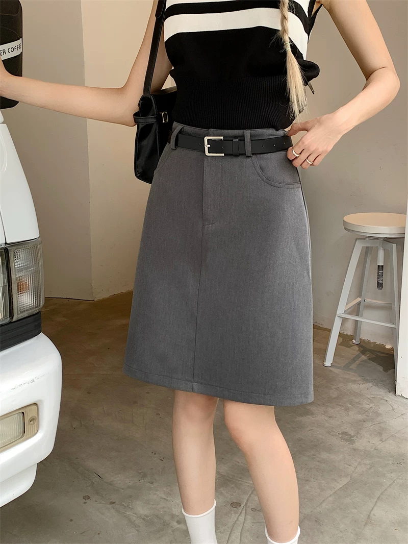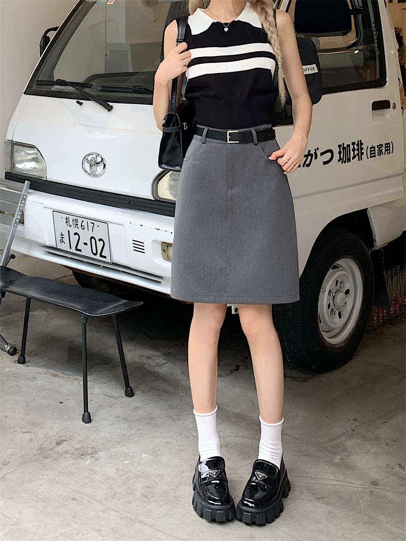 Váy midi kiểu vest màu xám dành cho nữ, cỡ lớn, cạp cao, che hông, thiết kế mùa hè, kiểu dáng chữ A ngắn.