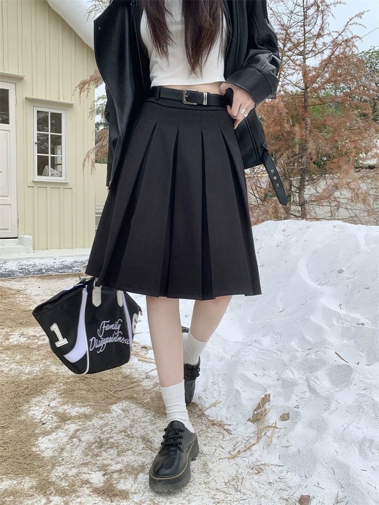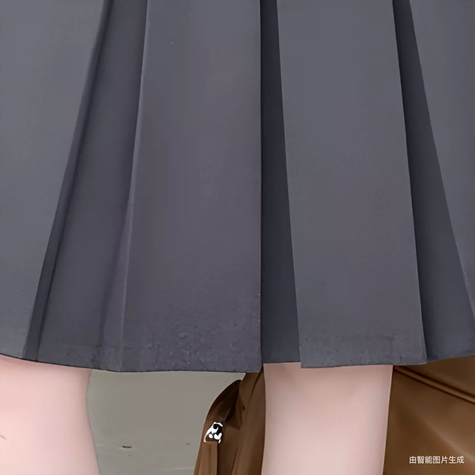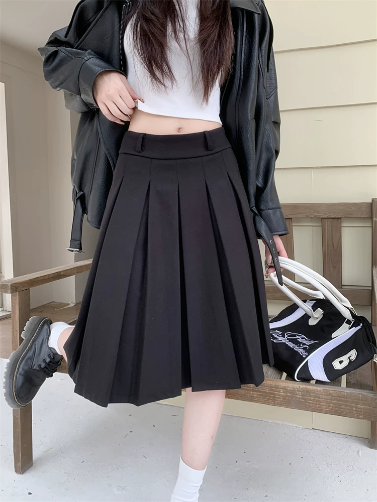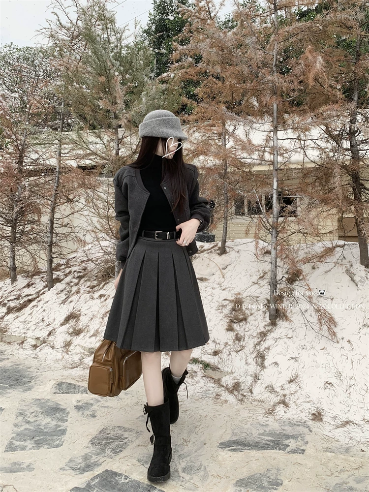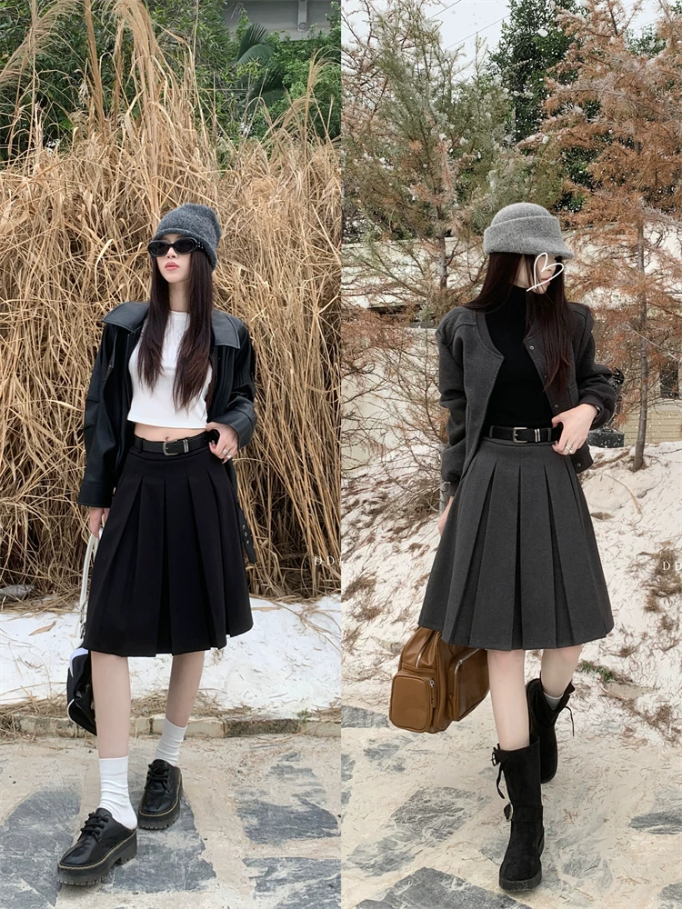 Váy midi len màu xám cỡ lớn dành cho nữ, mùa thu đông, lưng cao, thon gọn, che bụng, váy chữ A, váy xếp ly che hông.