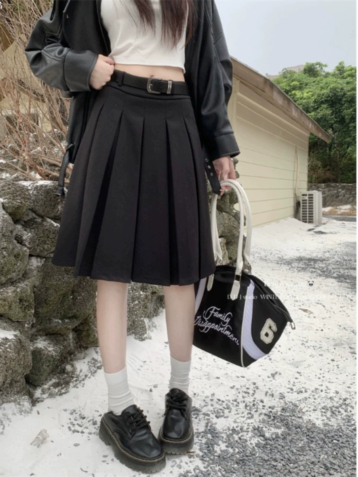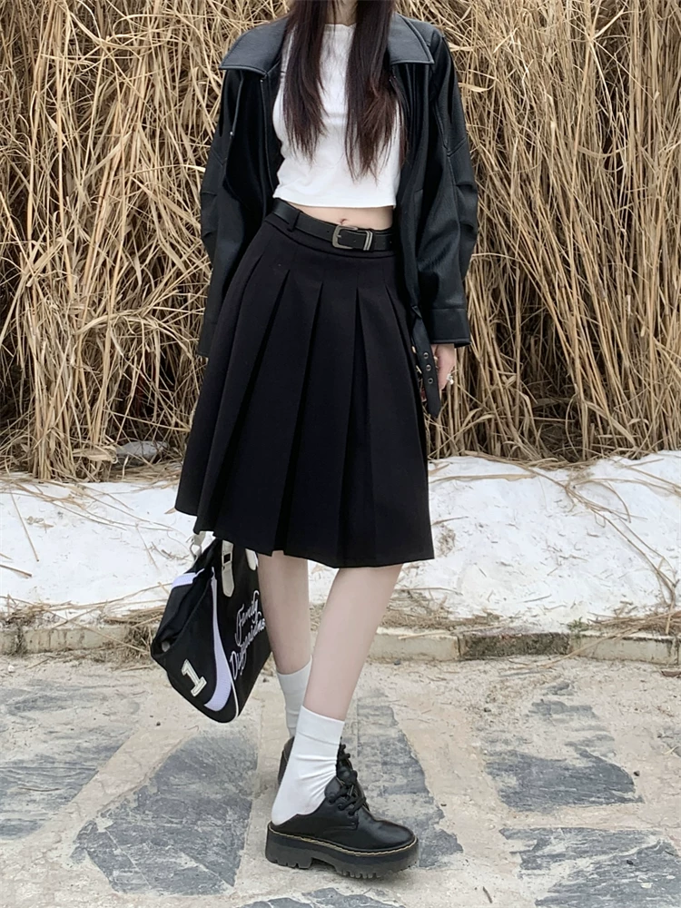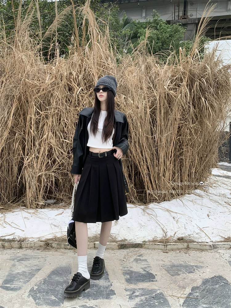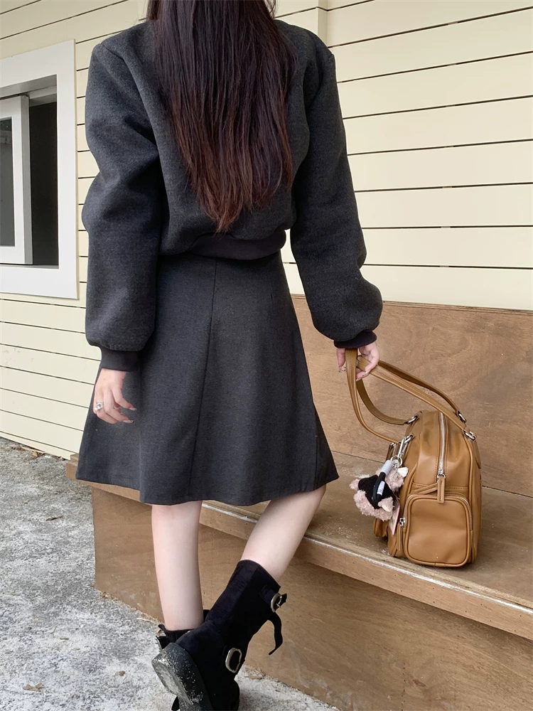 Váy midi len màu xám cỡ lớn dành cho nữ, mùa thu đông, lưng cao, thon gọn, che bụng, váy chữ A, váy xếp ly che hông.