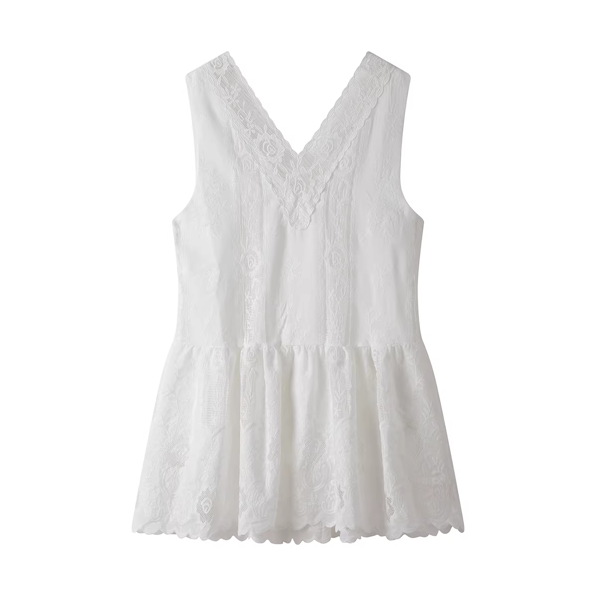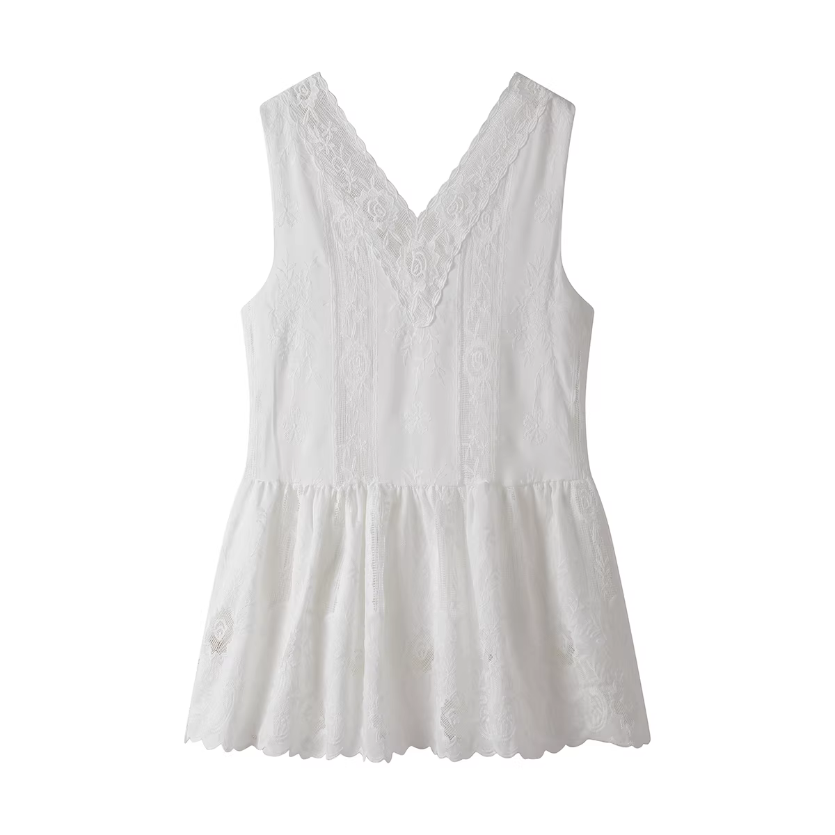 Váy ngắn cổ chữ V thêu ren nặng kiểu cổ điển dành cho nữ mùa xuân hè, màu trắng, không tay