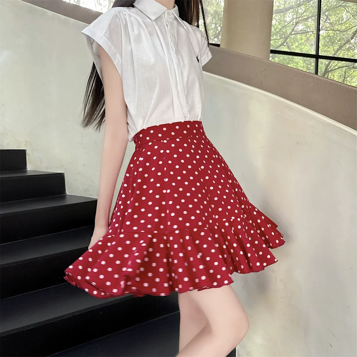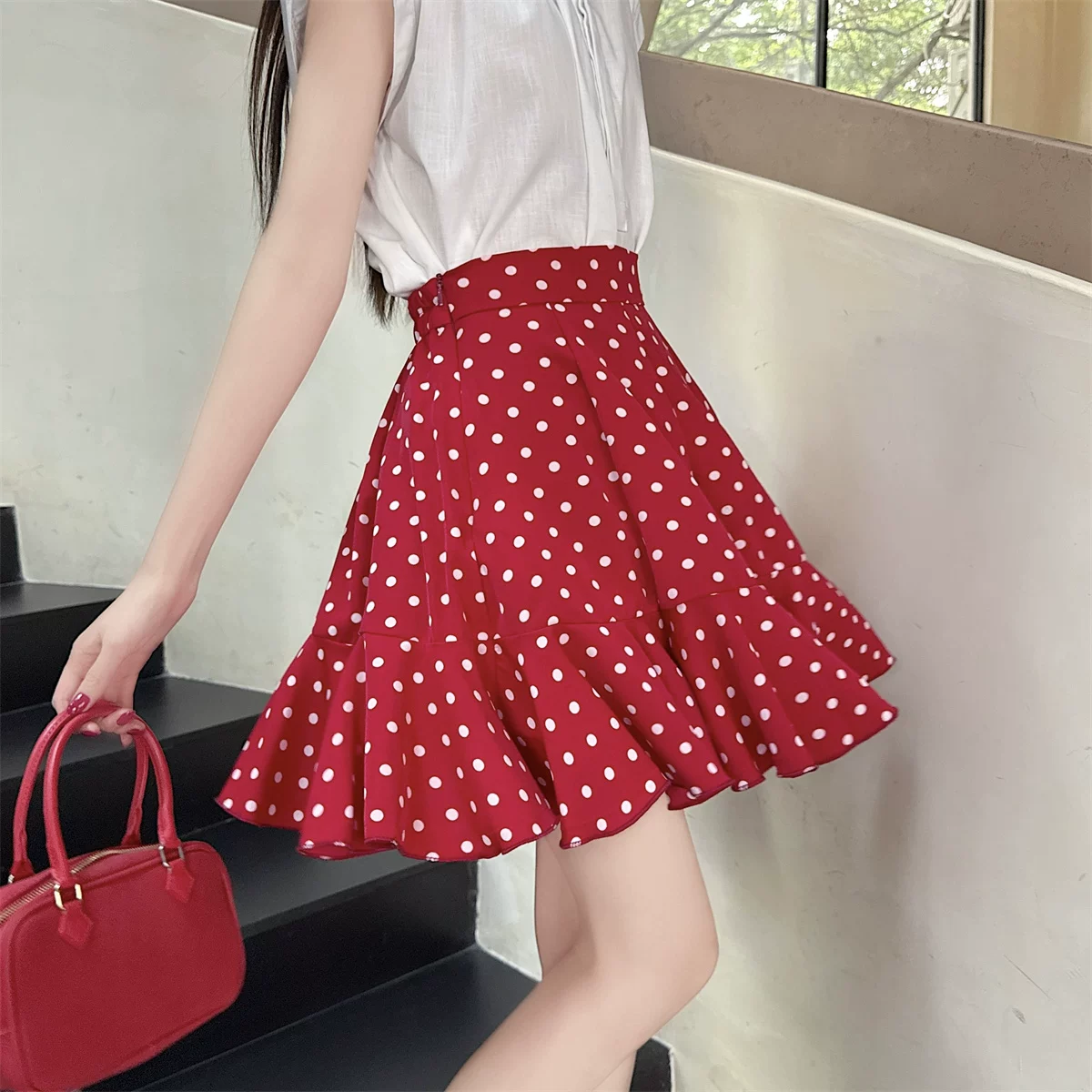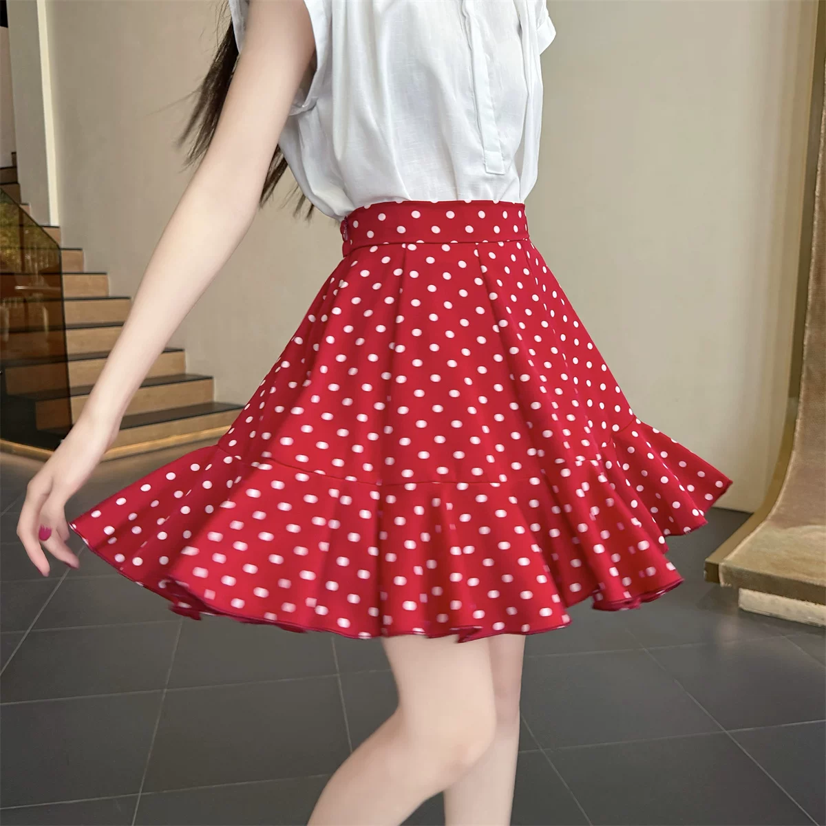 - Váy ngắn đuôi cá bằng vải voan chấm bi màu đỏ, váy dù che hông cỡ lớn mùa hè, váy chữ A xếp nếp nhỏ nhắn