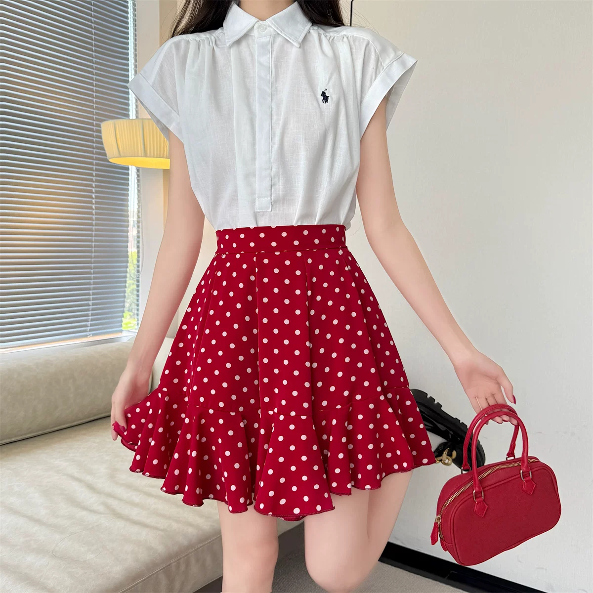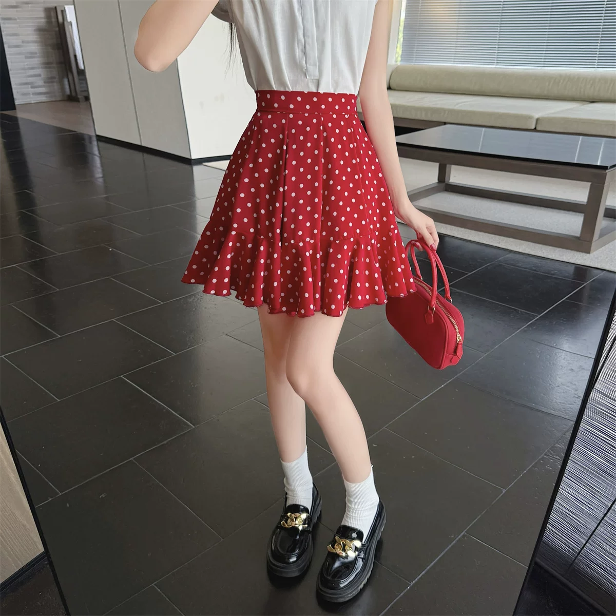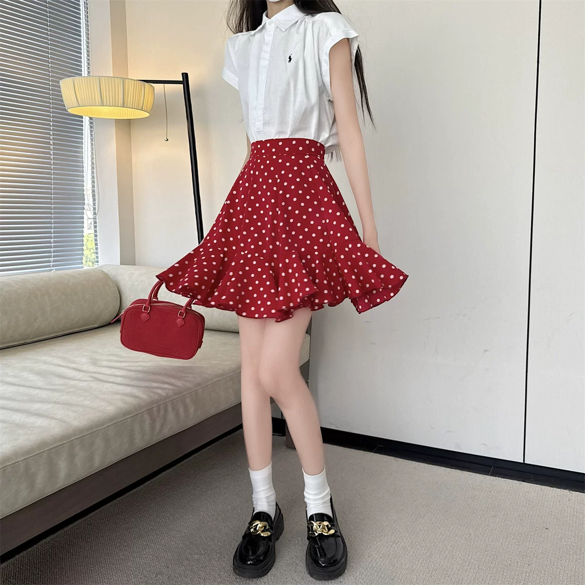- Váy ngắn đuôi cá bằng vải voan chấm bi màu đỏ, váy dù che hông cỡ lớn mùa hè, váy chữ A xếp nếp nhỏ nhắn