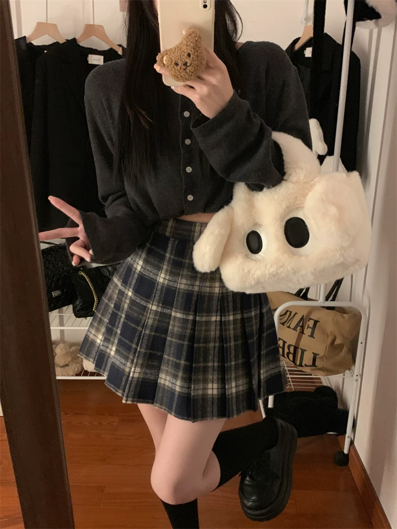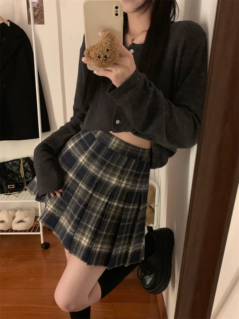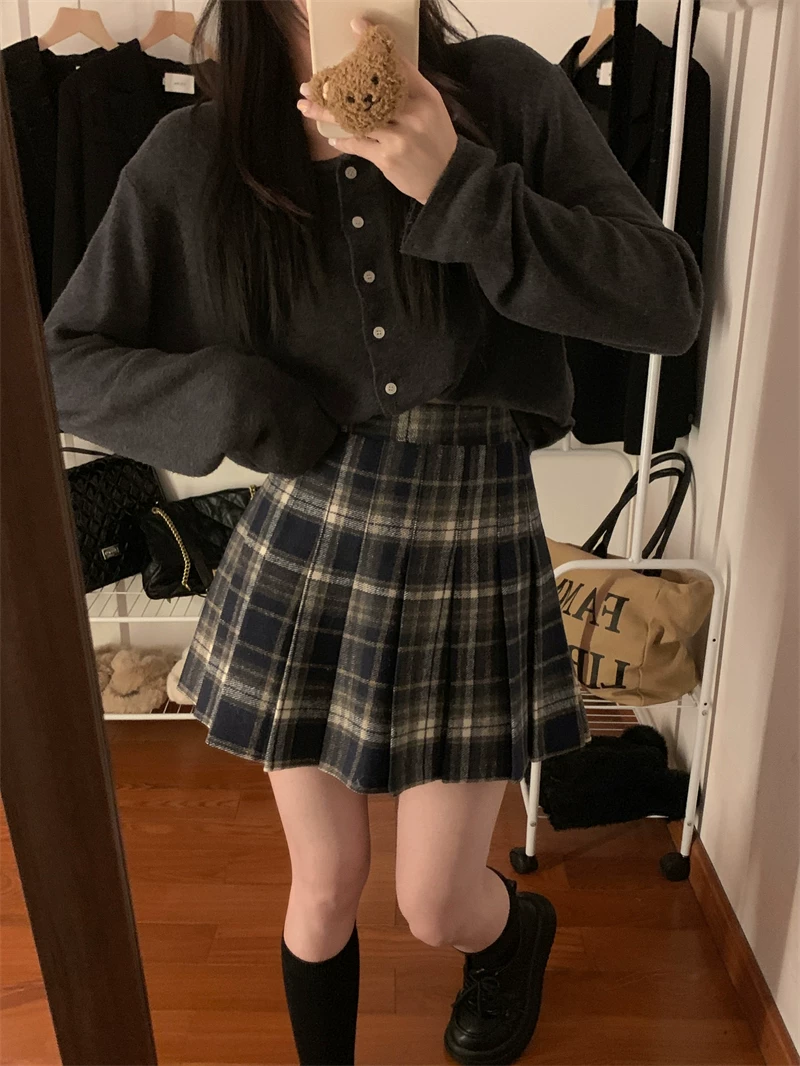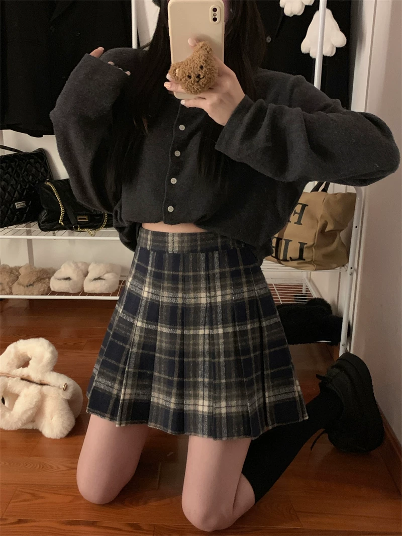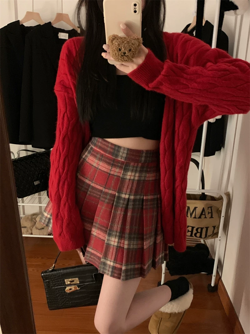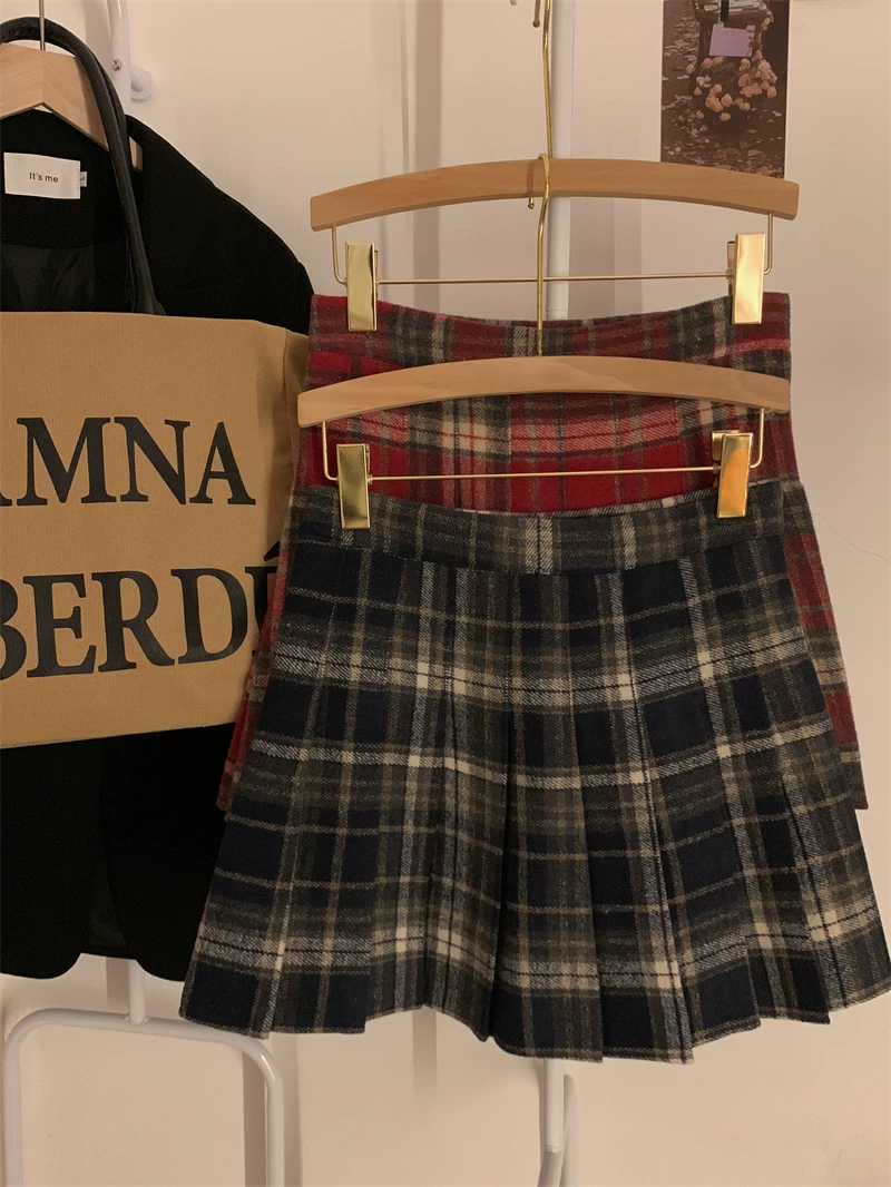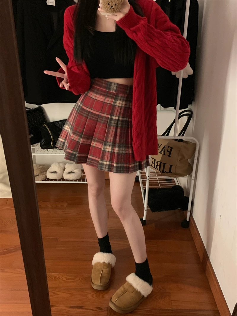 - Váy ngắn len kẻ sọc đỏ phong cách preppy cỡ lớn dành cho nữ, váy chữ A cạp cao giảm béo mùa thu đông, váy xếp ly JK.