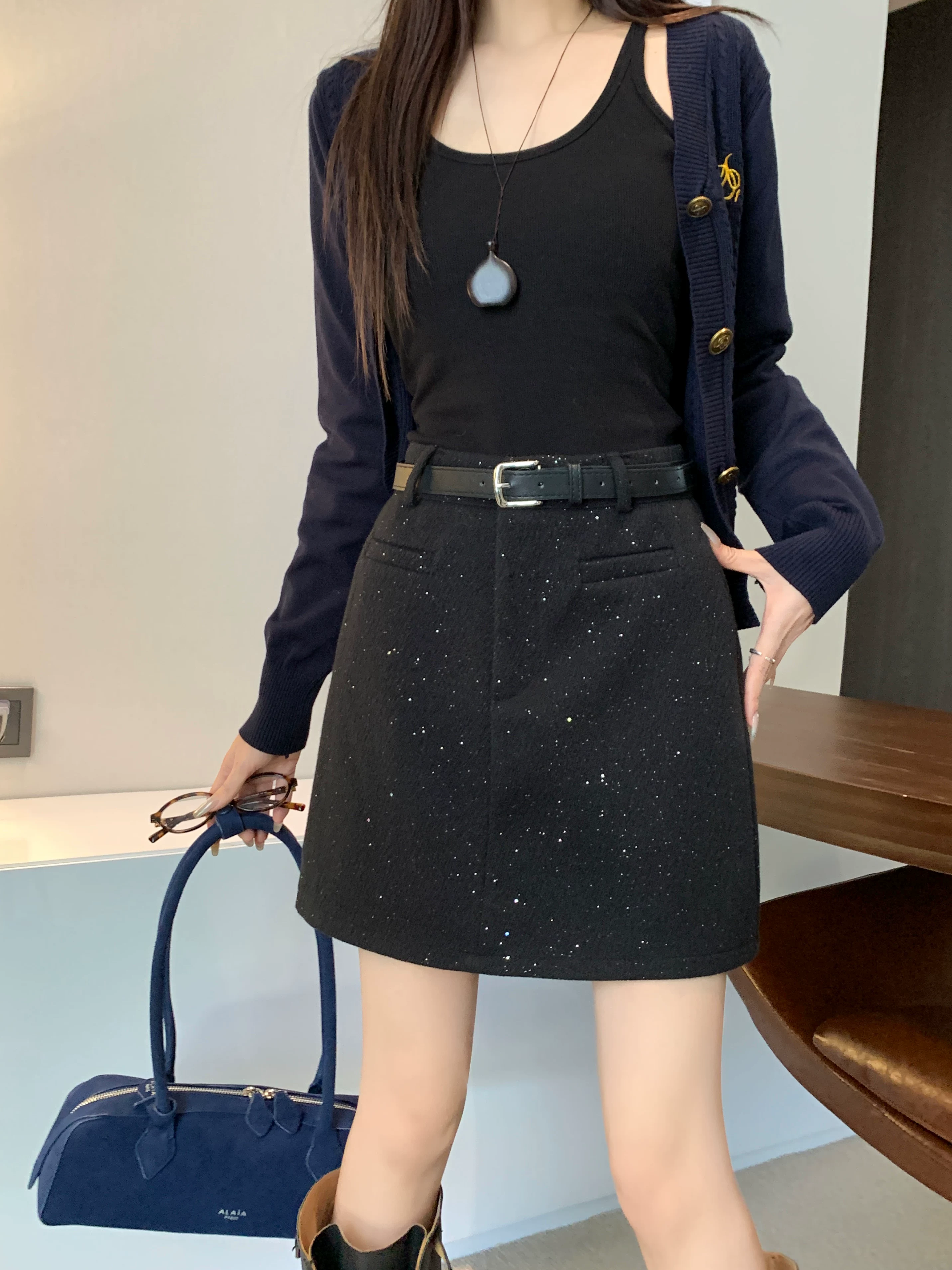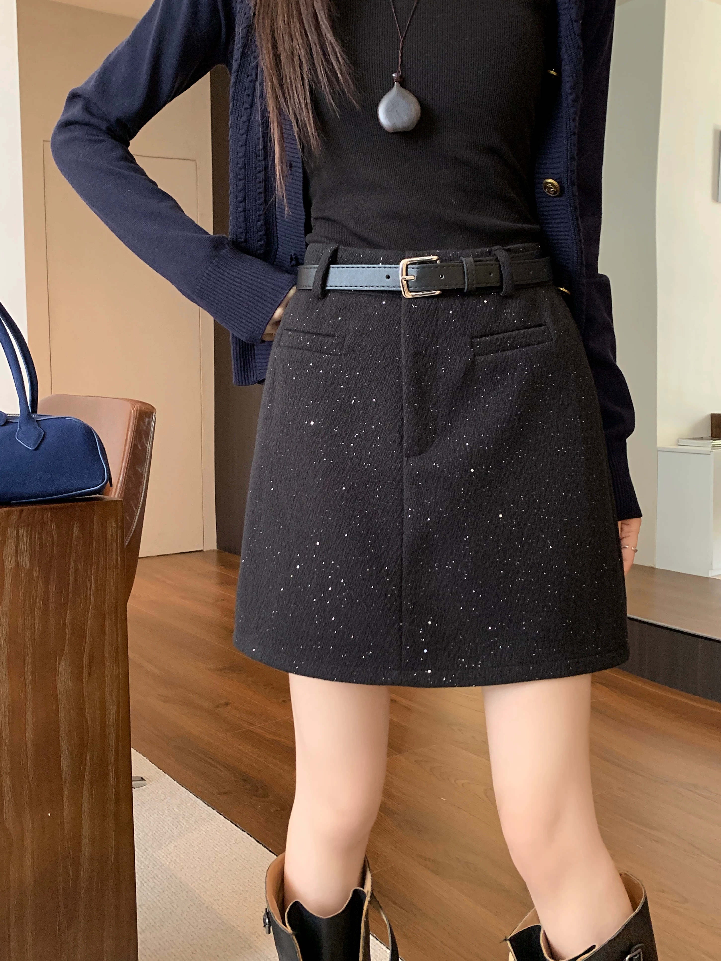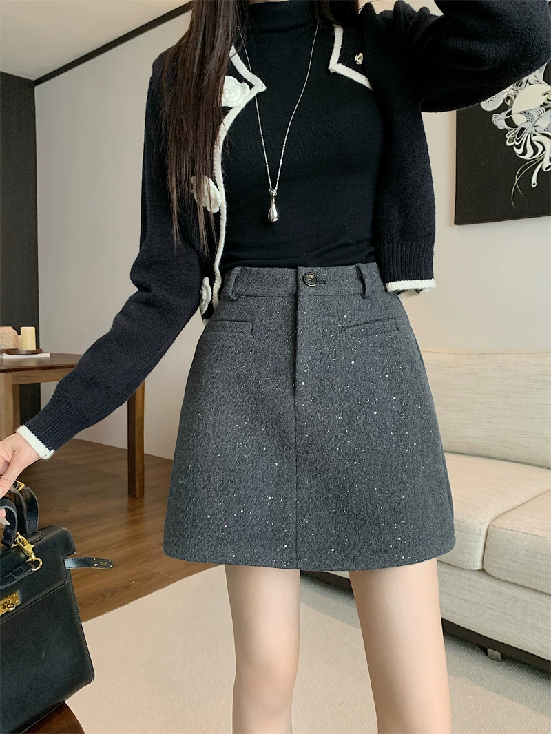 - Váy ngắn len sáng bóng bầu trời sao cho nữ, mùa thu đông, cỡ lớn, váy chữ A lưng cao, váy ngắn ôm sát đính sequin nhỏ nhắn.