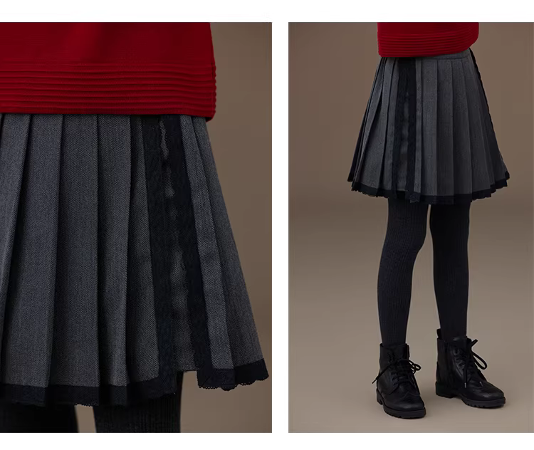 Váy ngắn mùa thu đông cho bé gái, màu đen, kiểu xếp ly, phối ren, phong cách dễ thương, năng động