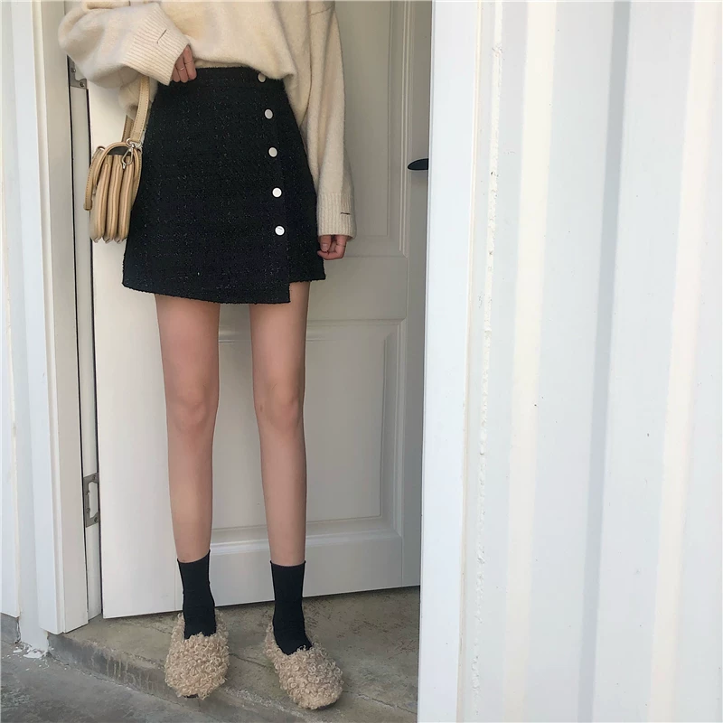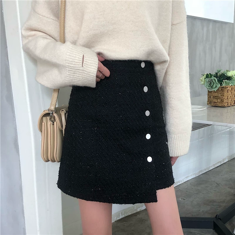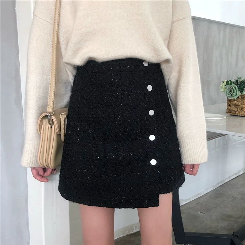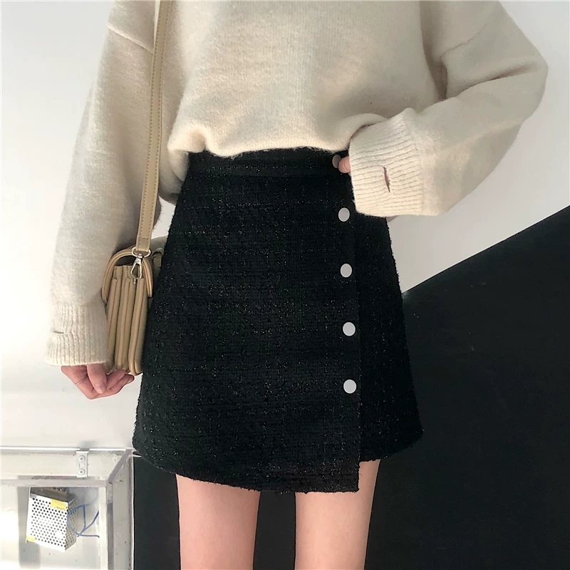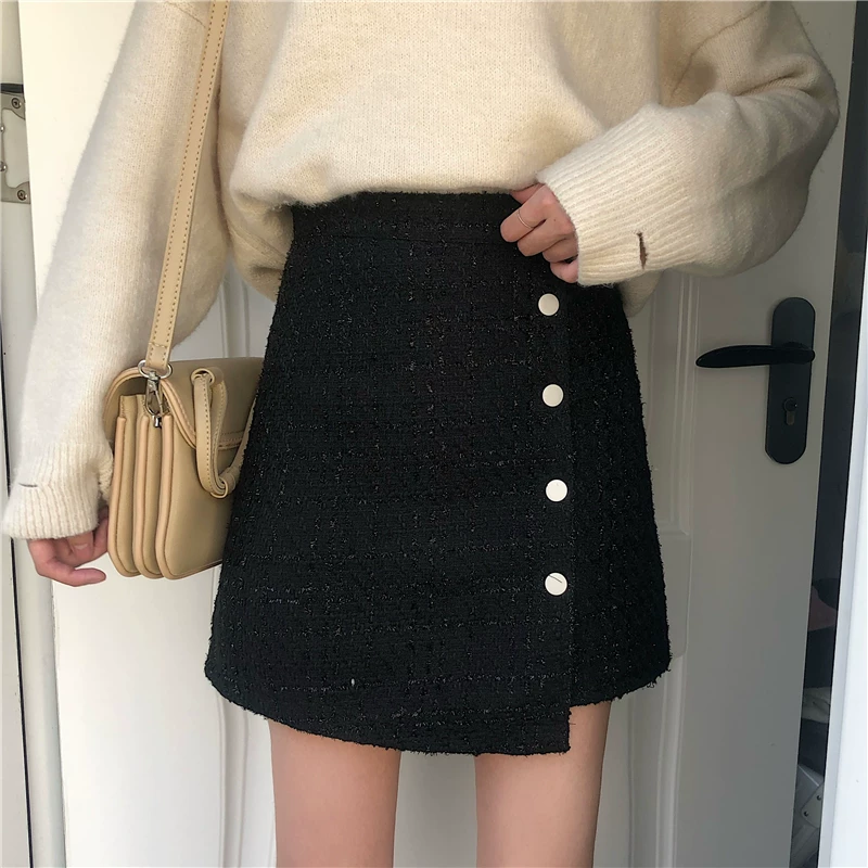 Váy ngắn tweed cỡ lớn dành cho nữ, mùa thu đông, váy chữ A cạp cao tôn dáng, váy nửa thân len dáng bất quy tắc.