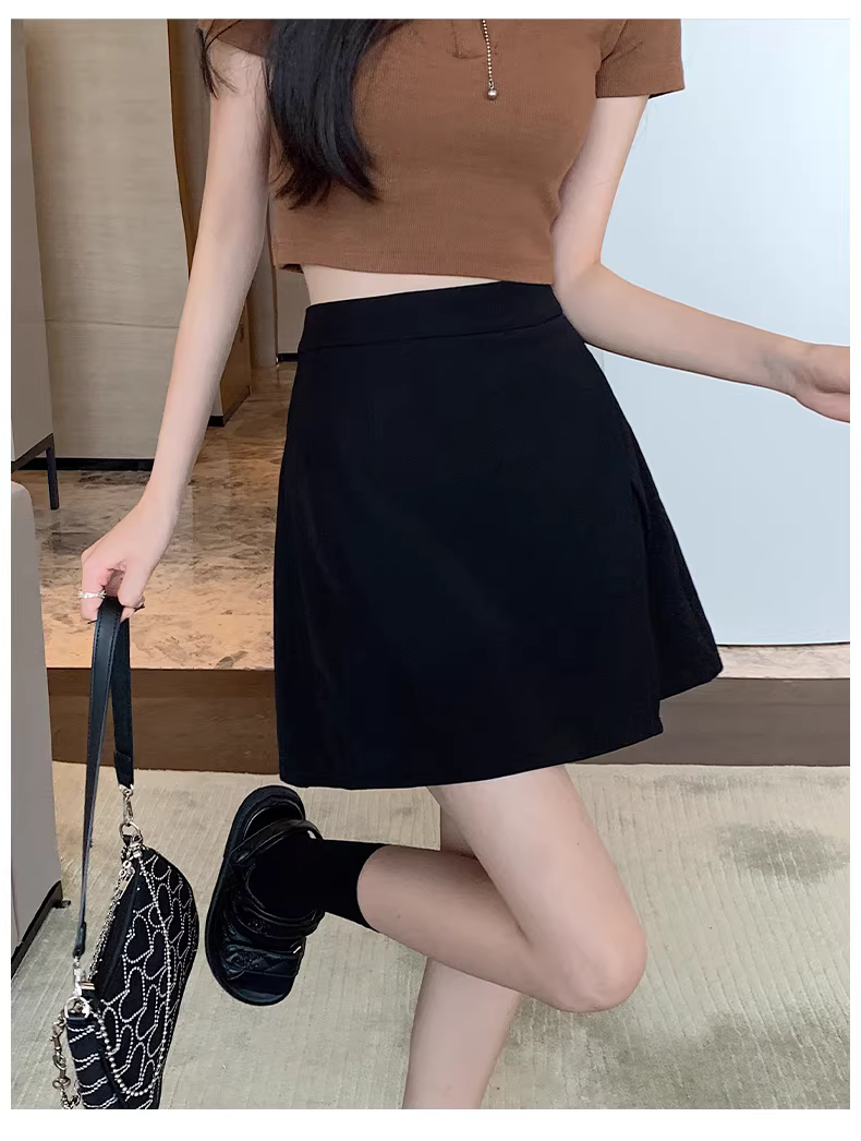 Váy ngắn xẻ tà màu đen hình quả lê dành cho nữ, mùa hè dành cho nữ cỡ nhỏ, che hông, giảm béo, chống lộ, quần váy chữ A cạp cao