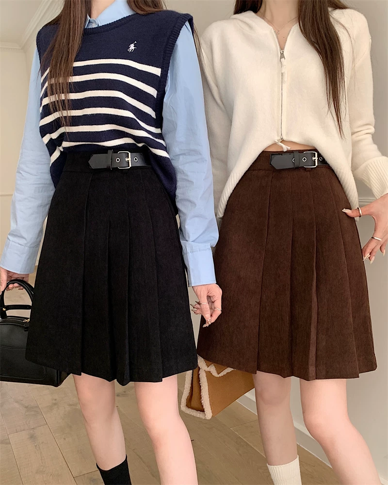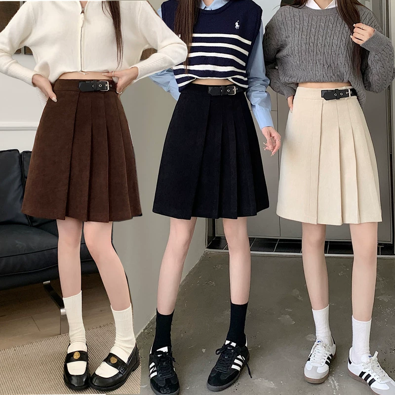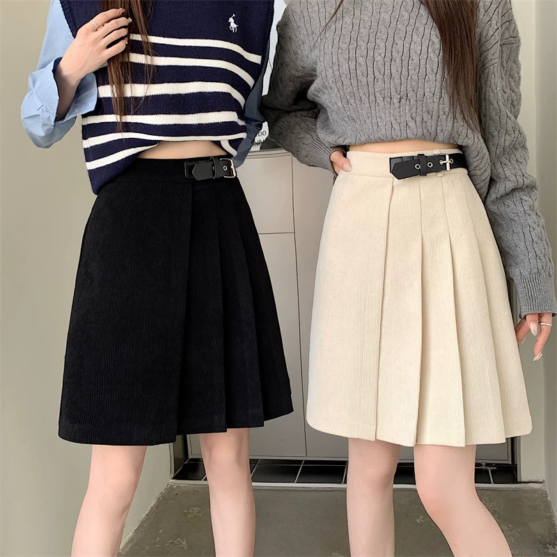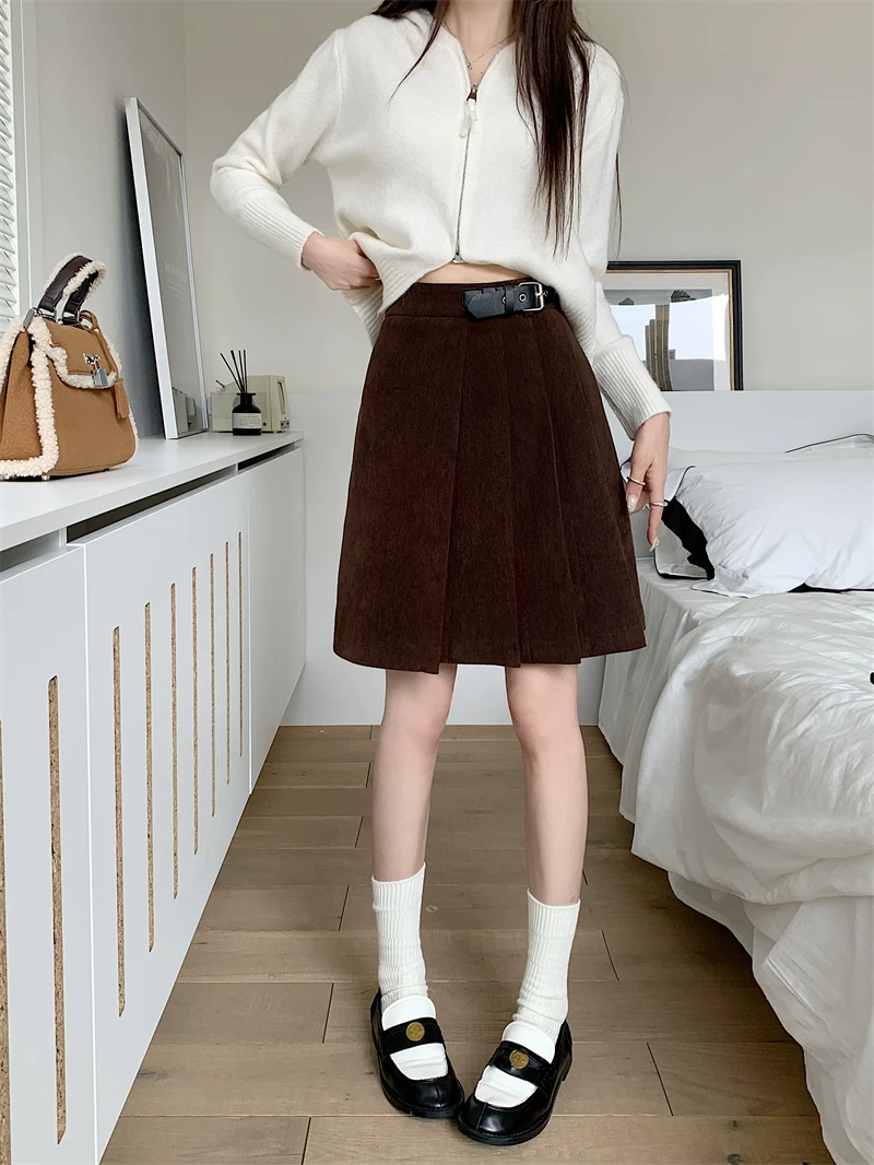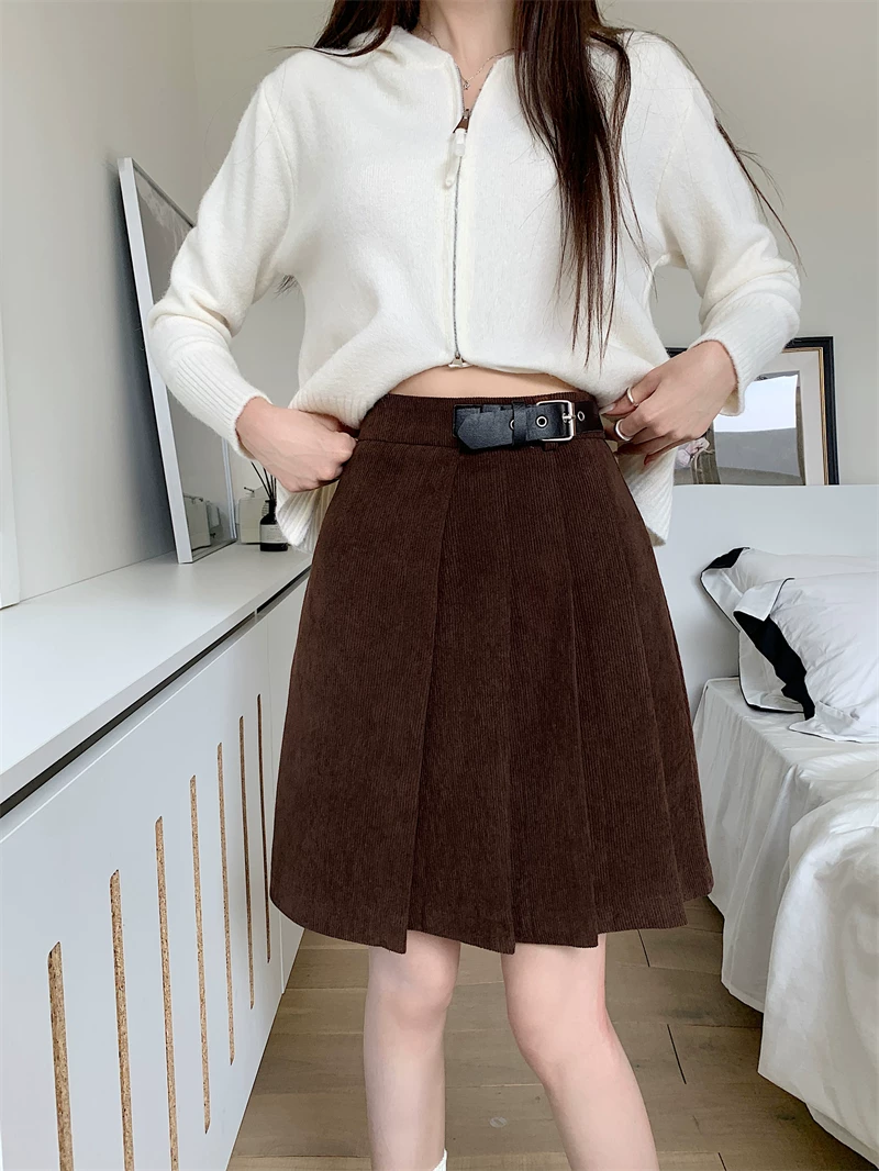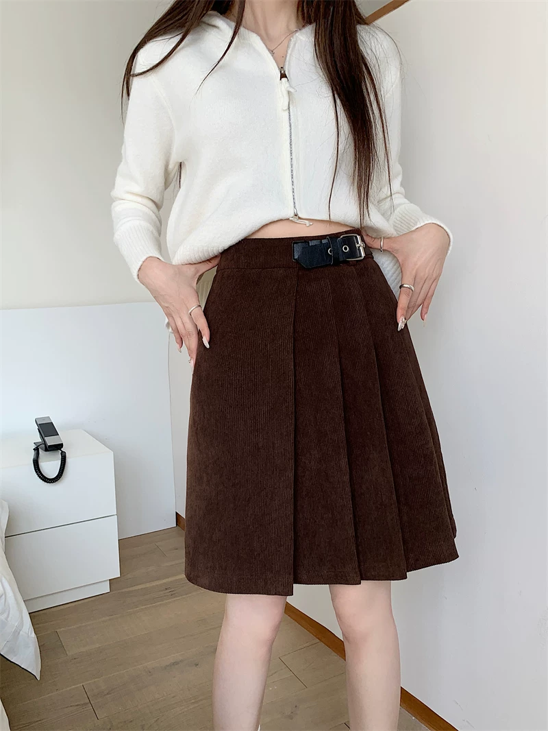 Váy nhung kẻ lưng cao dành cho nữ, mùa thu đông, cỡ lớn, váy ngắn chữ A thon gọn, màu cà phê, váy ôm sát, váy xếp ly không đều.
