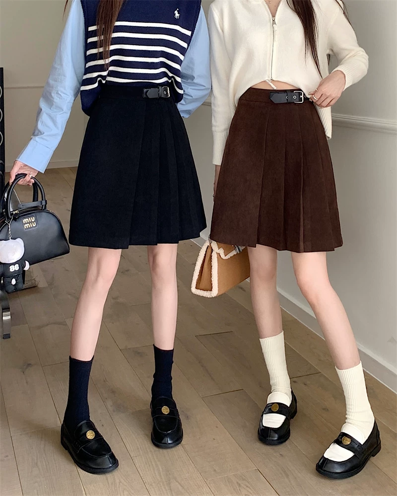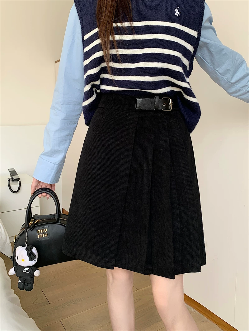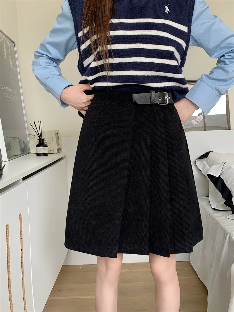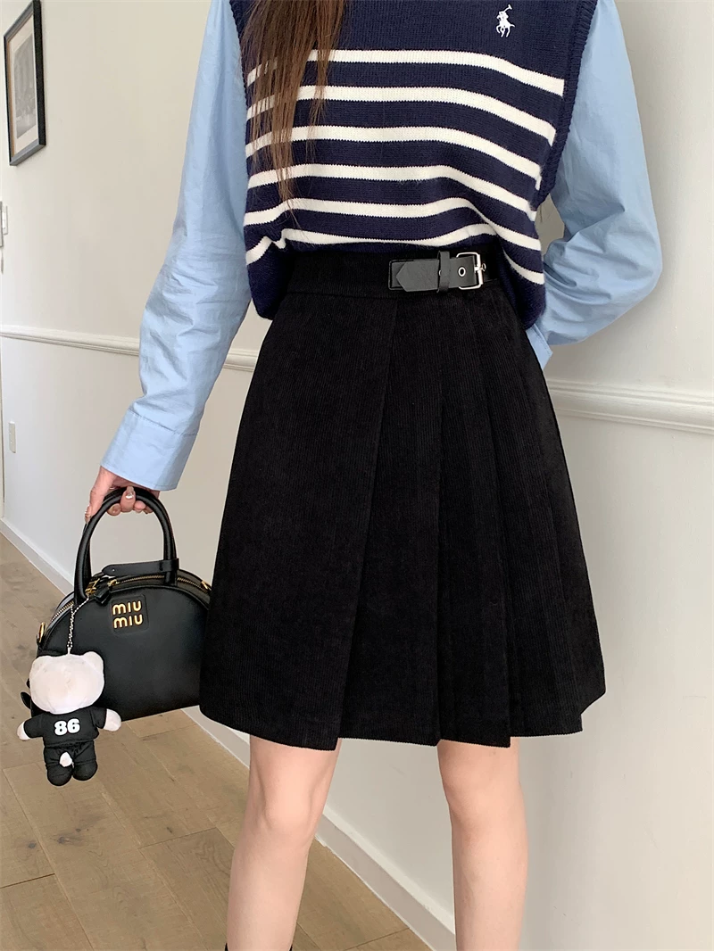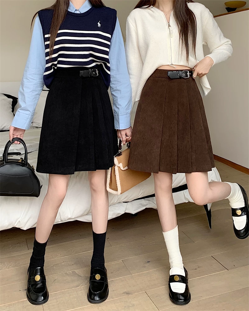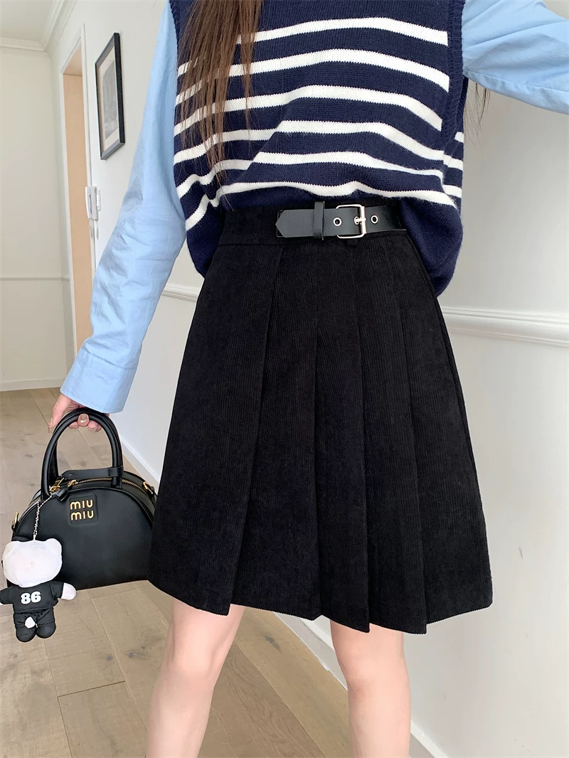 Váy nhung kẻ lưng cao dành cho nữ, mùa thu đông, cỡ lớn, váy ngắn chữ A thon gọn, màu cà phê, váy ôm sát, váy xếp ly không đều.
